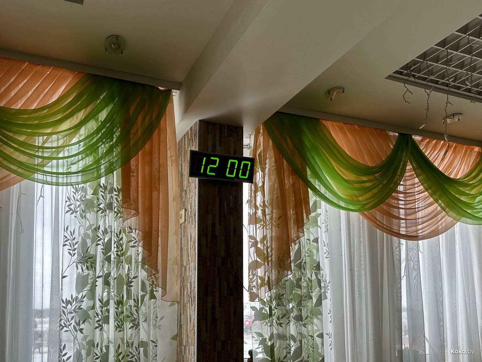 Атмосфера классической столовой при заводе с линией раздачи и небольшим залом, на часах 12:00, вижу один свободный столик.