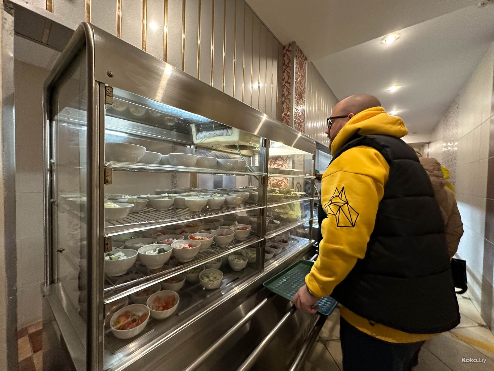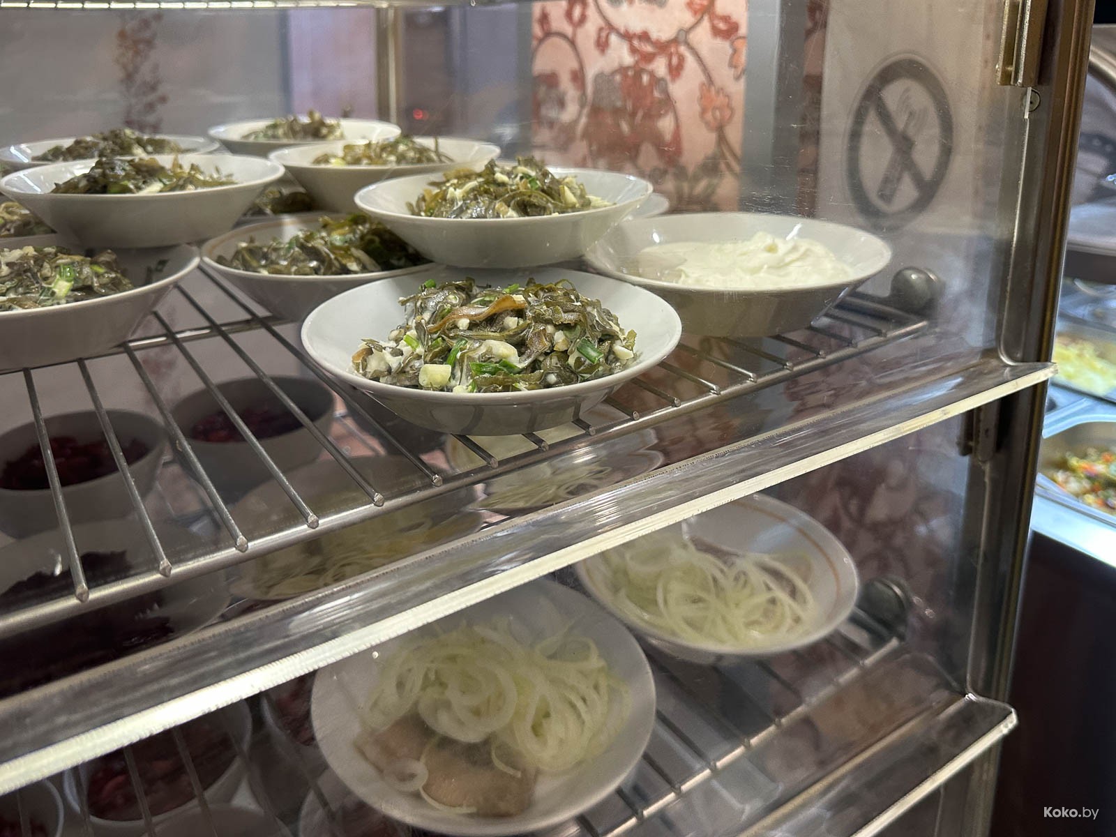 Первый взгляд на меню: приличный выбор, девять горячих, четыре вида супов, в разделе для вегетарианцев: морская капуста, молочный суп, запеканка, 11 видов салатов и яйцо на подушке из салатного лука.