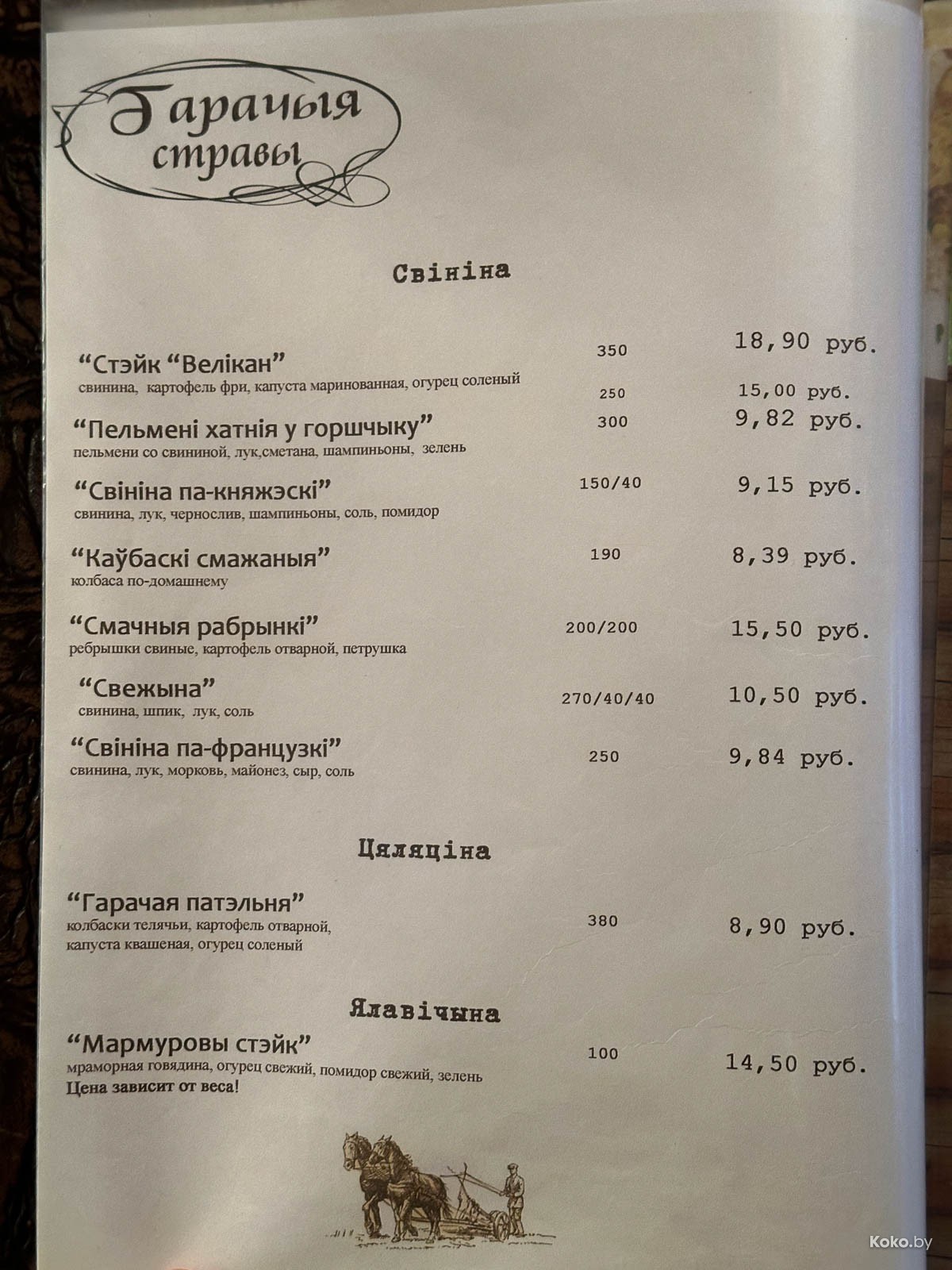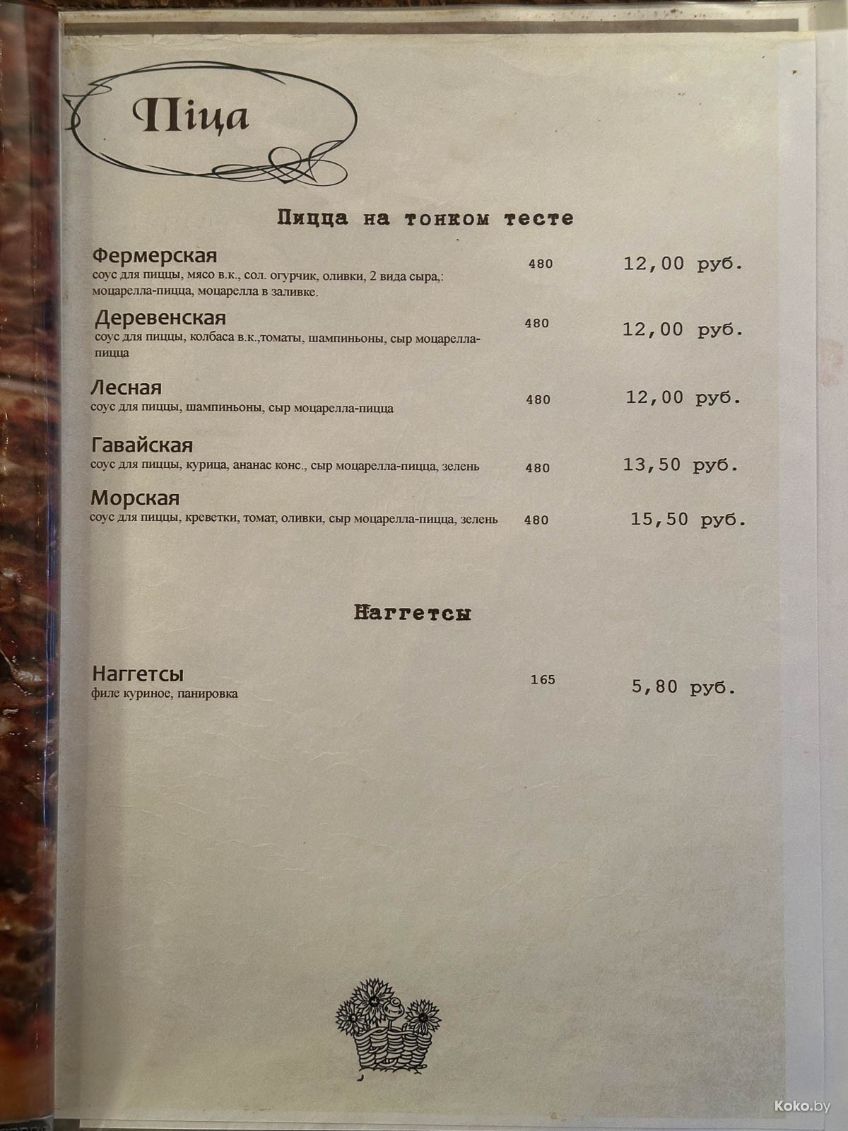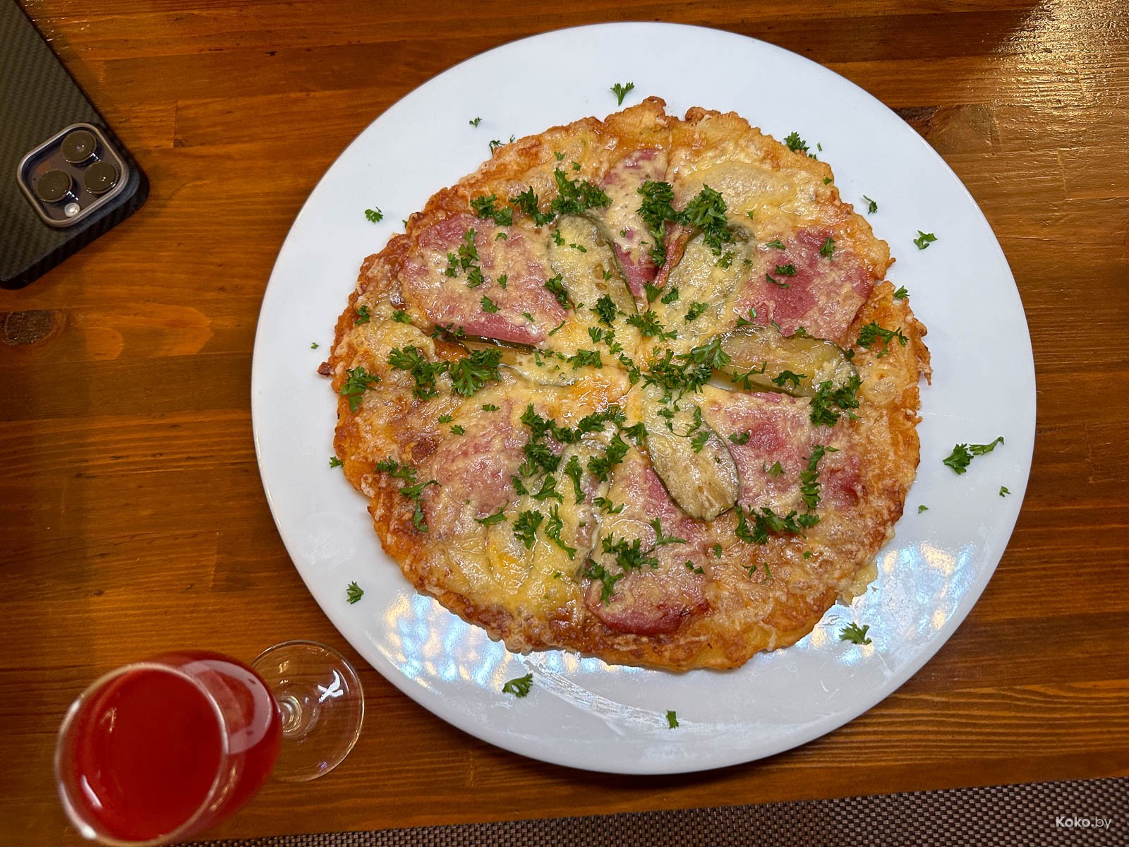 Цены - лайтовые, много всего из картошки, их хрюшки под майонезом и рыбы. Просим туровское фирменное - им оказалась знаменитая на все деревни Туровщины картофельная пицца с колбасой фермера за 12р.