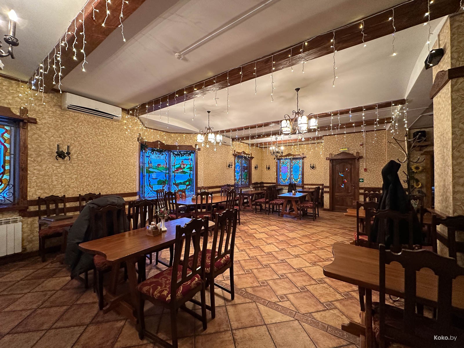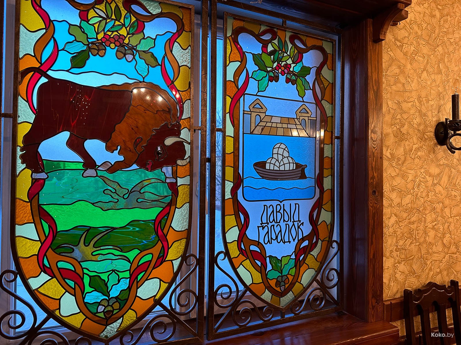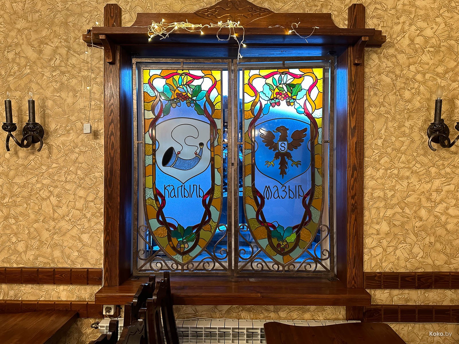 Переступив порог, сразу захотелось накатить! Атмосфера княжеского дома, витражи вместо окон с изображением гербов городов, входящих в состав Турово-Пинского княжества. Пока ждали еду, нам провели экспресс-экскурсию. В конце зала растопили деревенскую печь. Кааайф!