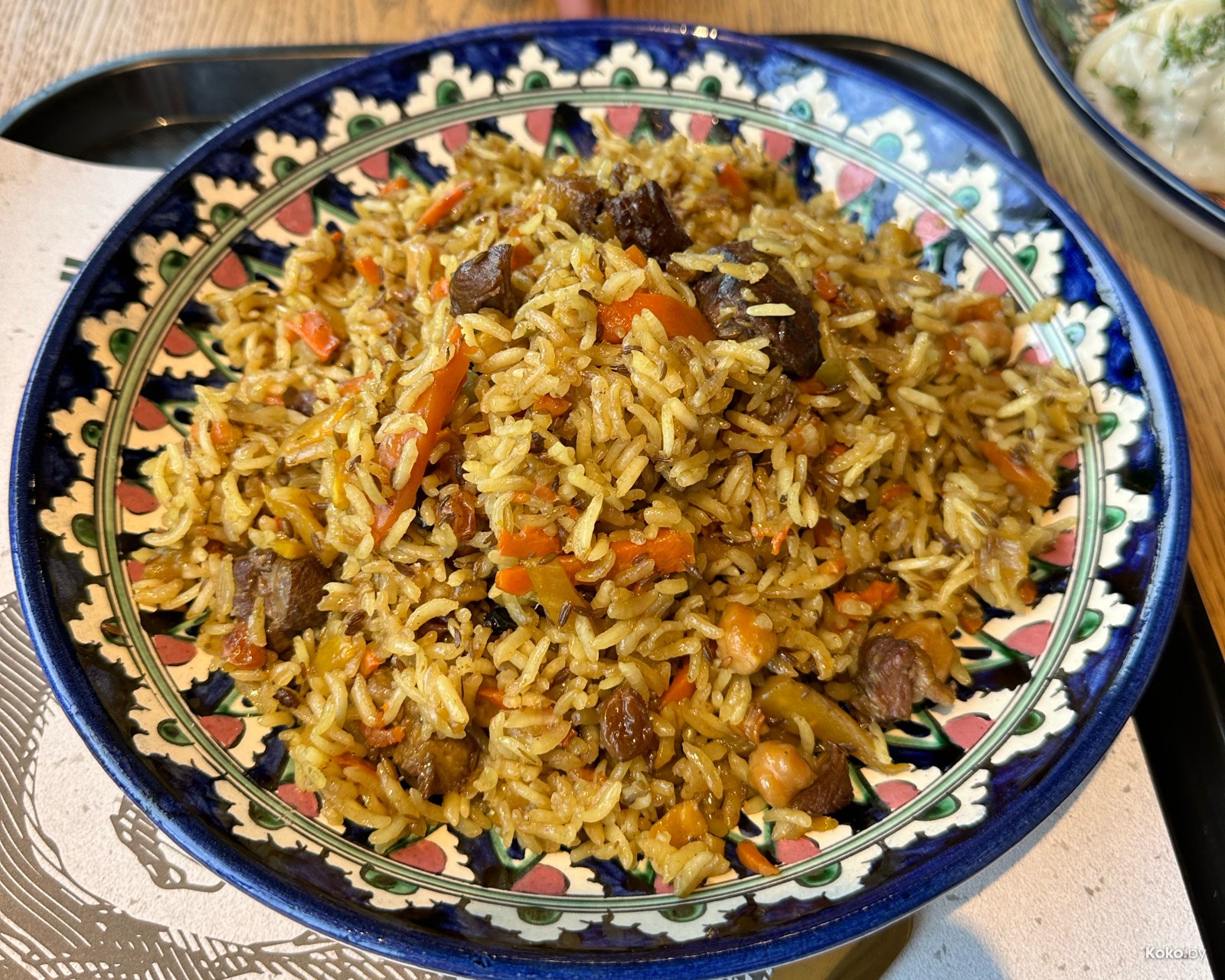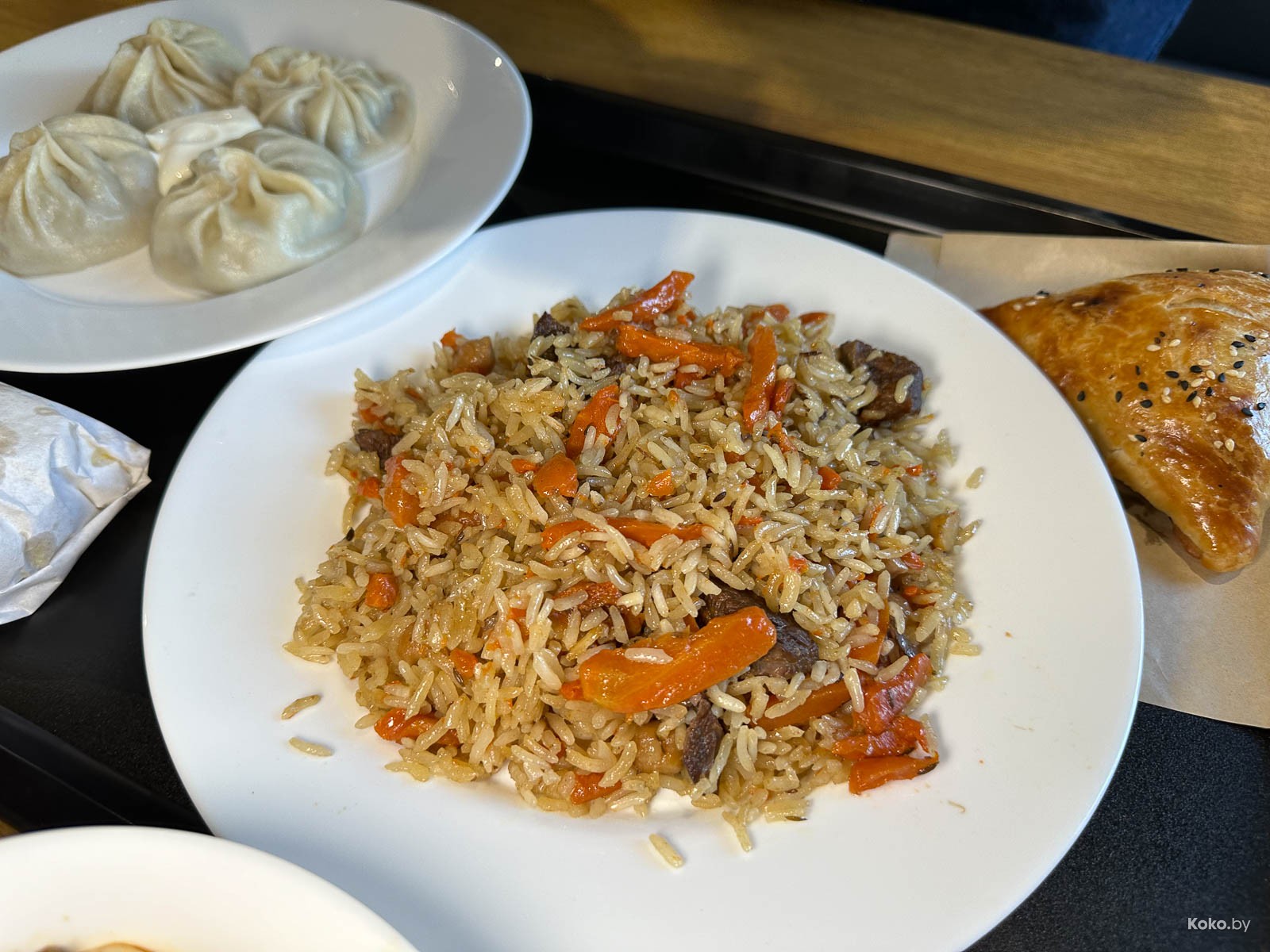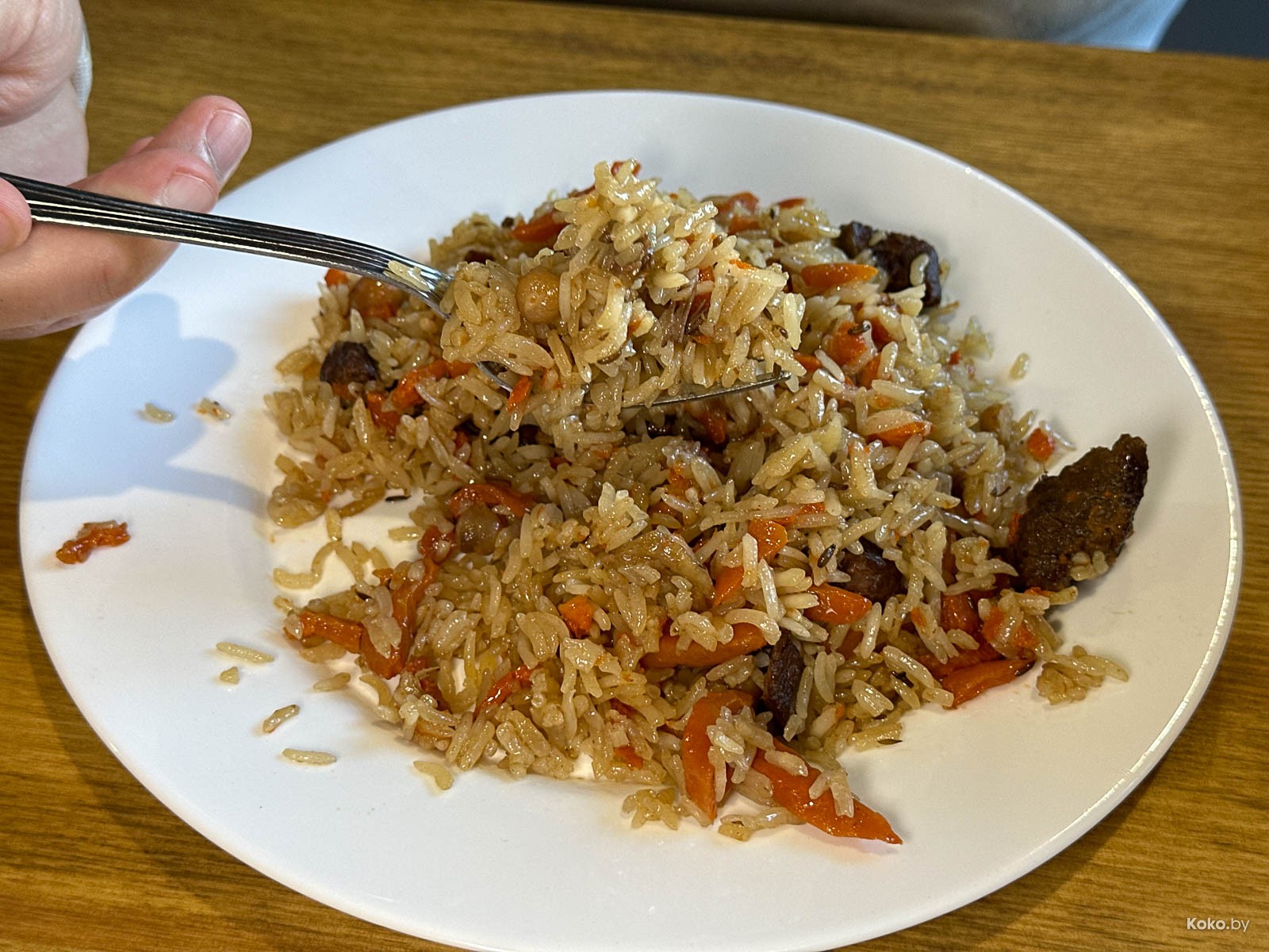 3. Честная тарелка плова с говядиной и нутом за 9р. В меру жирный на губах, удачный баланс специй, ещё горячий. Прям хорошо на душе стало, но желалось бы мяса, не как детям в садике. На 8 кокобаев.