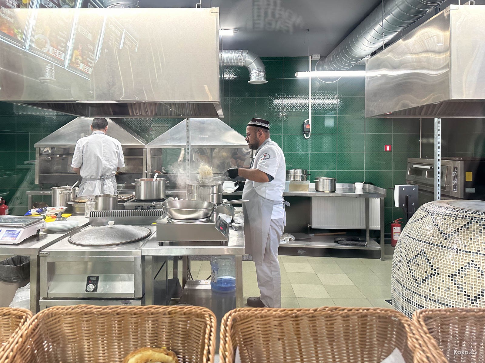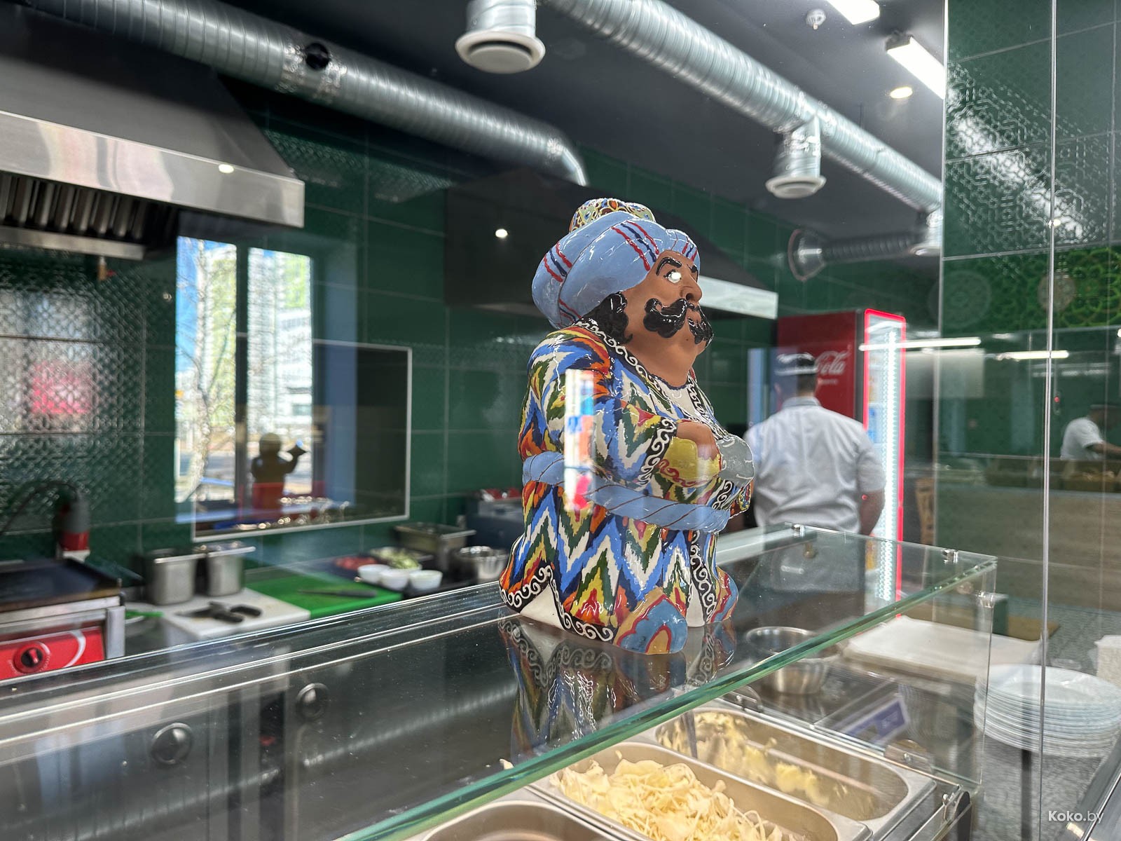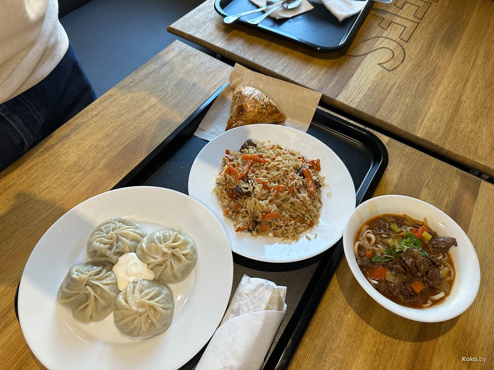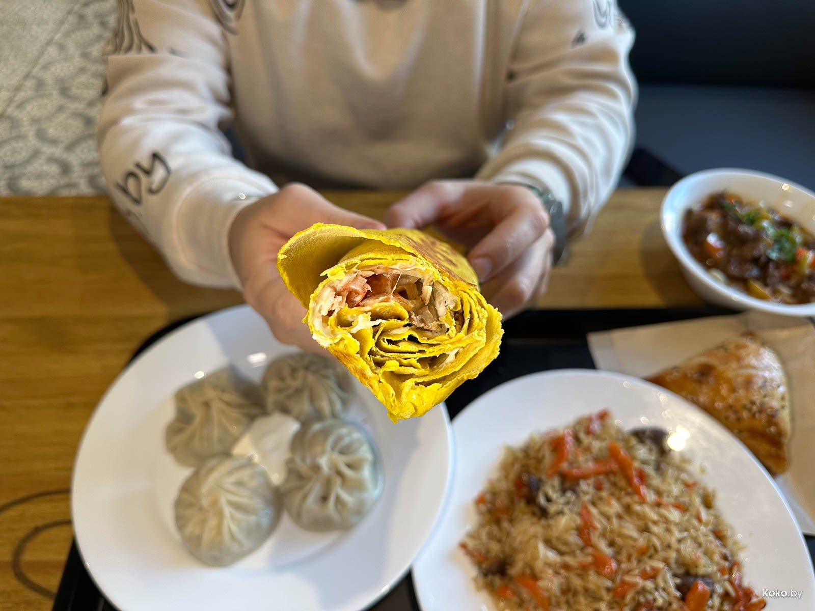 Кроме шаурмы варят лагман, в казане готовят плов, на мангале жарят десять видов шашлыков, пекут лепёшки, запаривают манты, собирают бургеры. Выбор большой, цены комфортные, есть обеденные сеты.