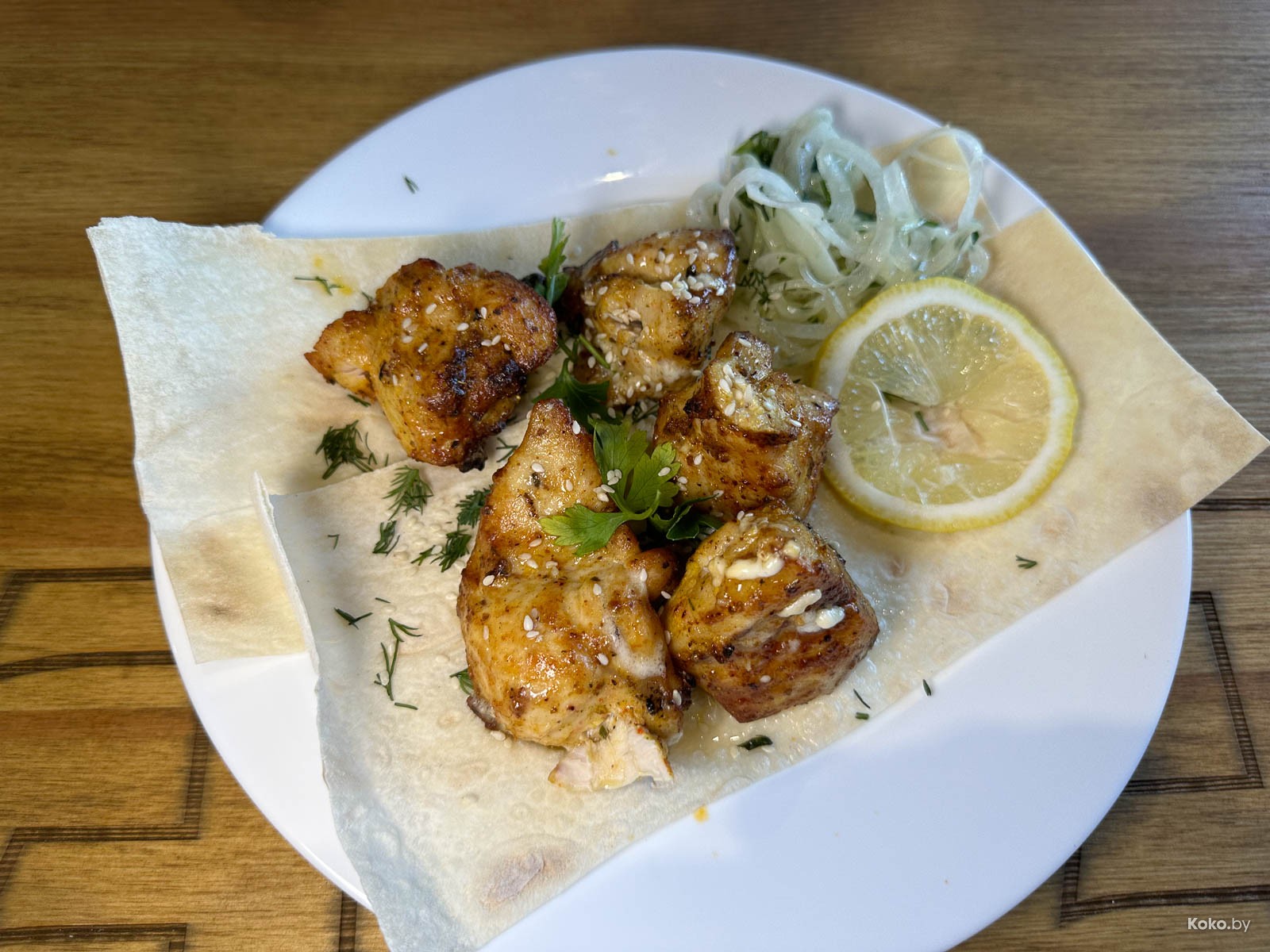 7. В разных гарнирах куриный шашлык под золотистой корочкой весьма сочный. По цене сердечного субпродукта, те же 13р. Берите смело!