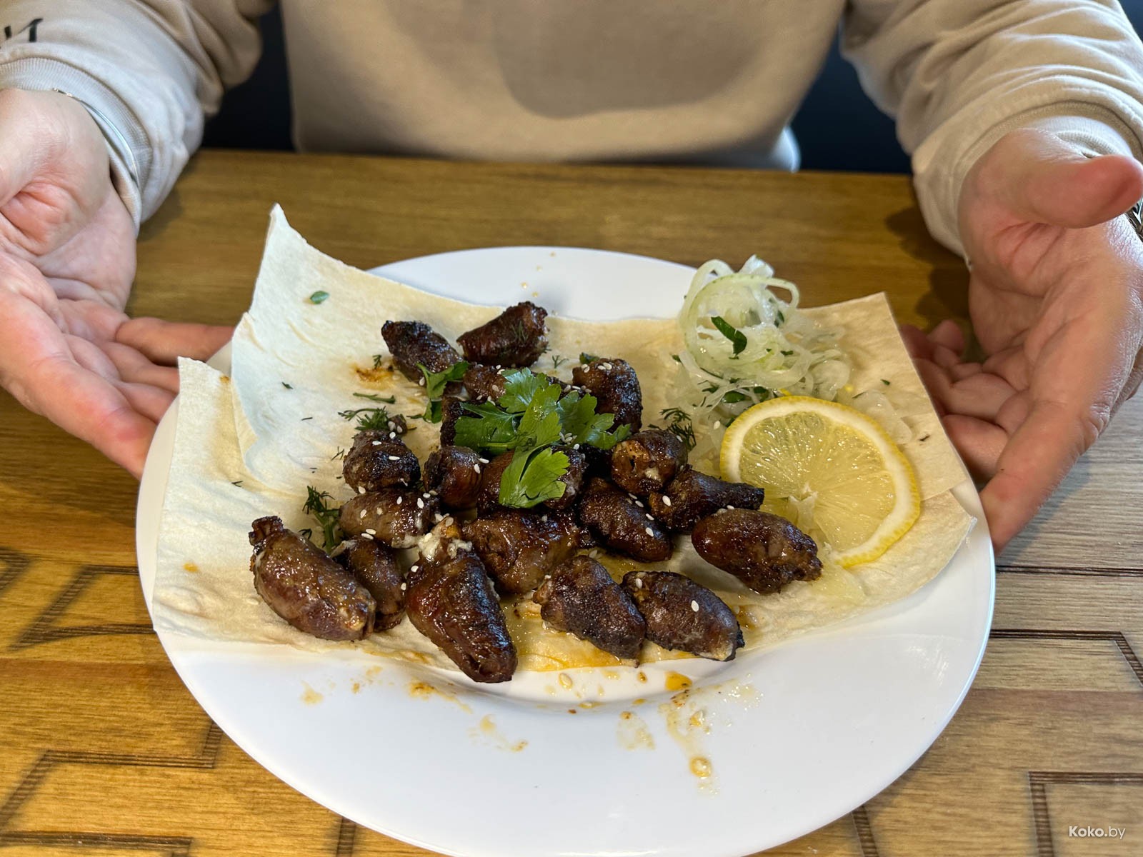 6. Сердечки на гриле или любят или ненавидят. Лично я обожаю, с лёгким ароматом дымка и восточных специй. За 13р подаются с маринованным лимонным луком на сухом лаваше из муки и воды.
