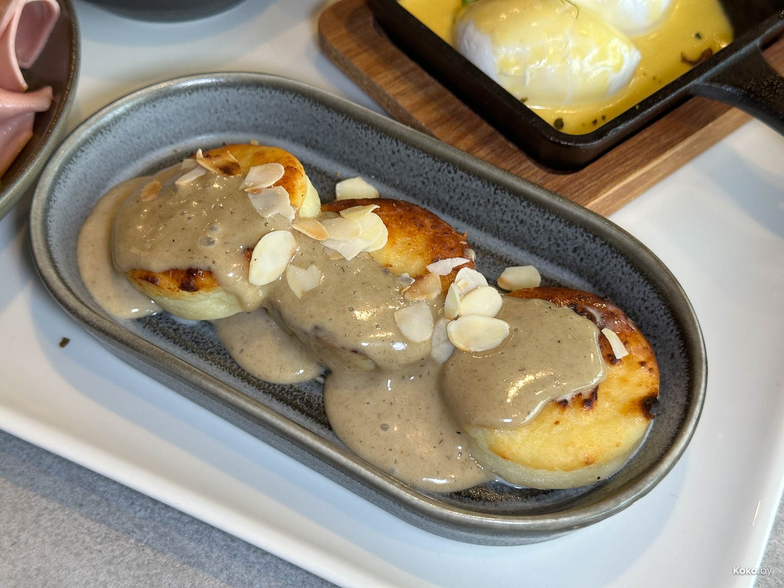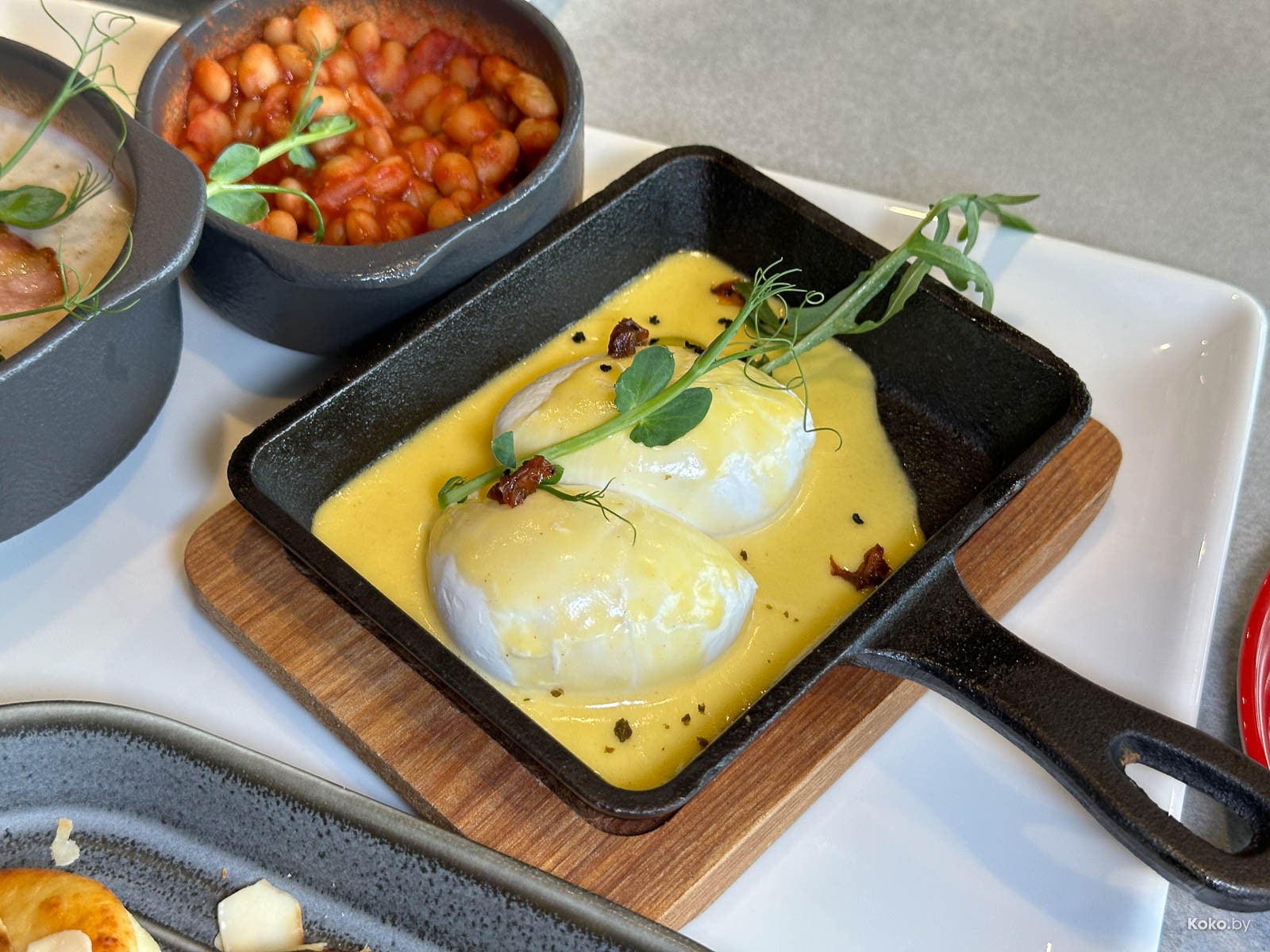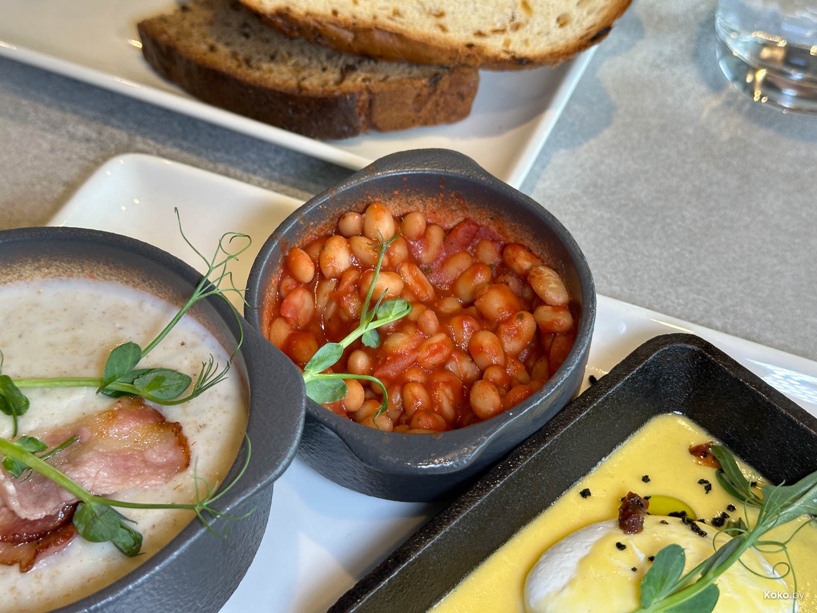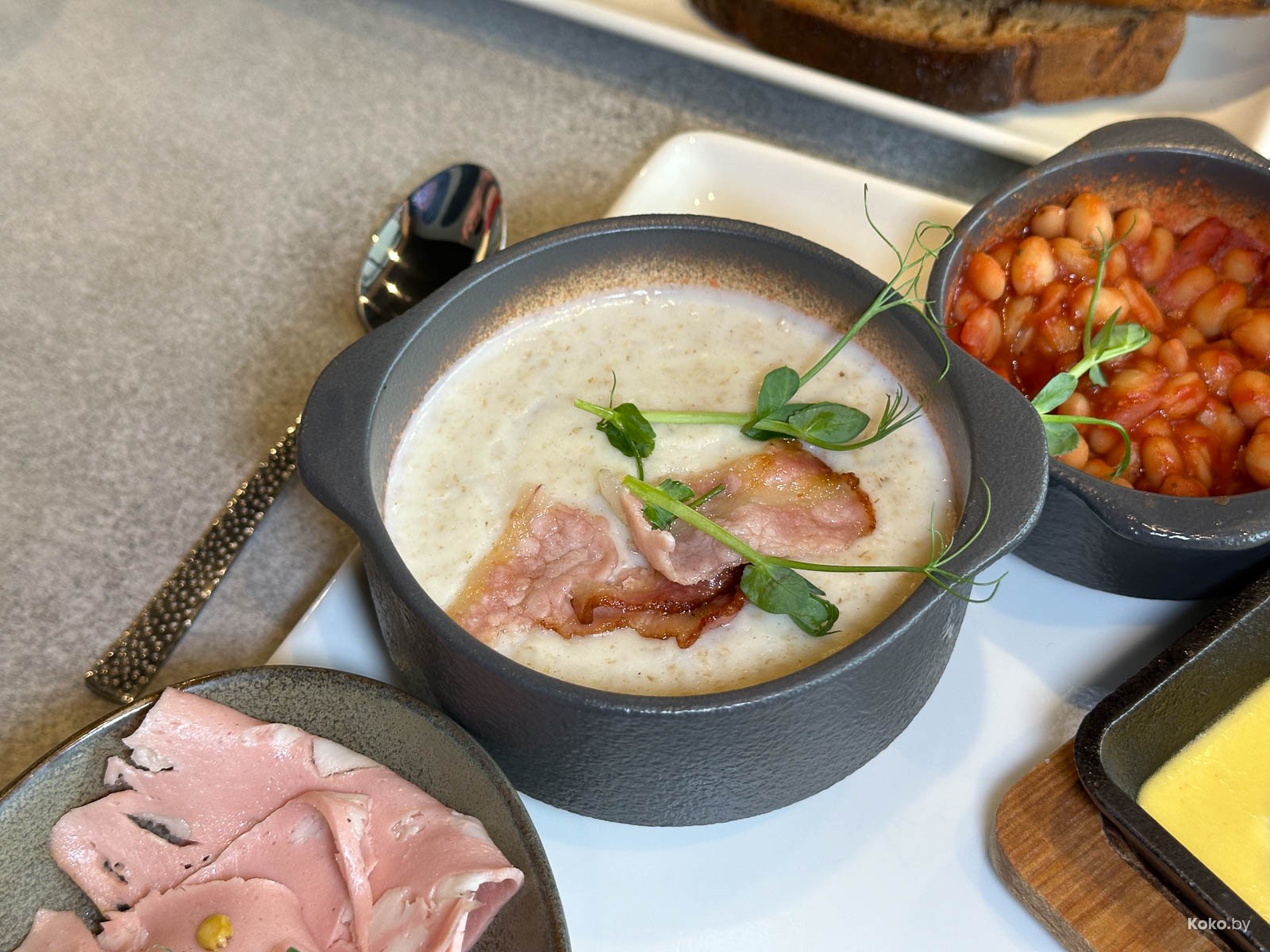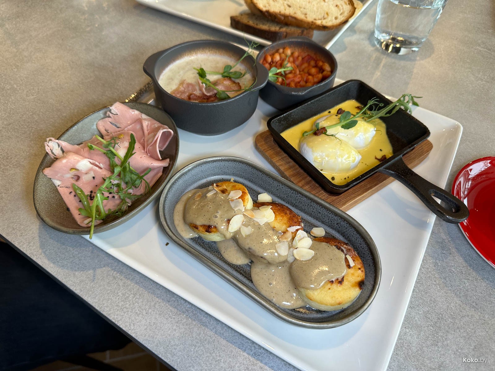 3. На другом подносе два яйца с попаданием в пашот под голландским соусом - кайф. Фасоль из банки, просто нарезанная молодечненская мортадела, странная овсянка с беконом и сырники. Так выглядят 25р.