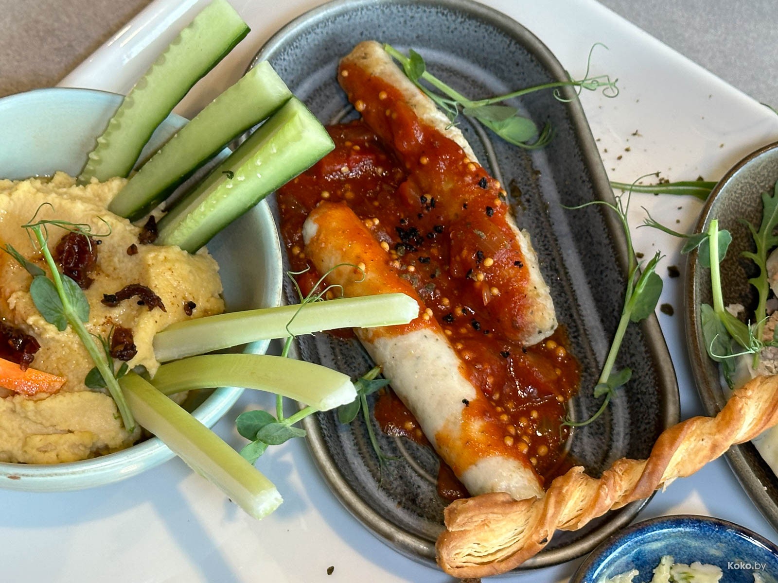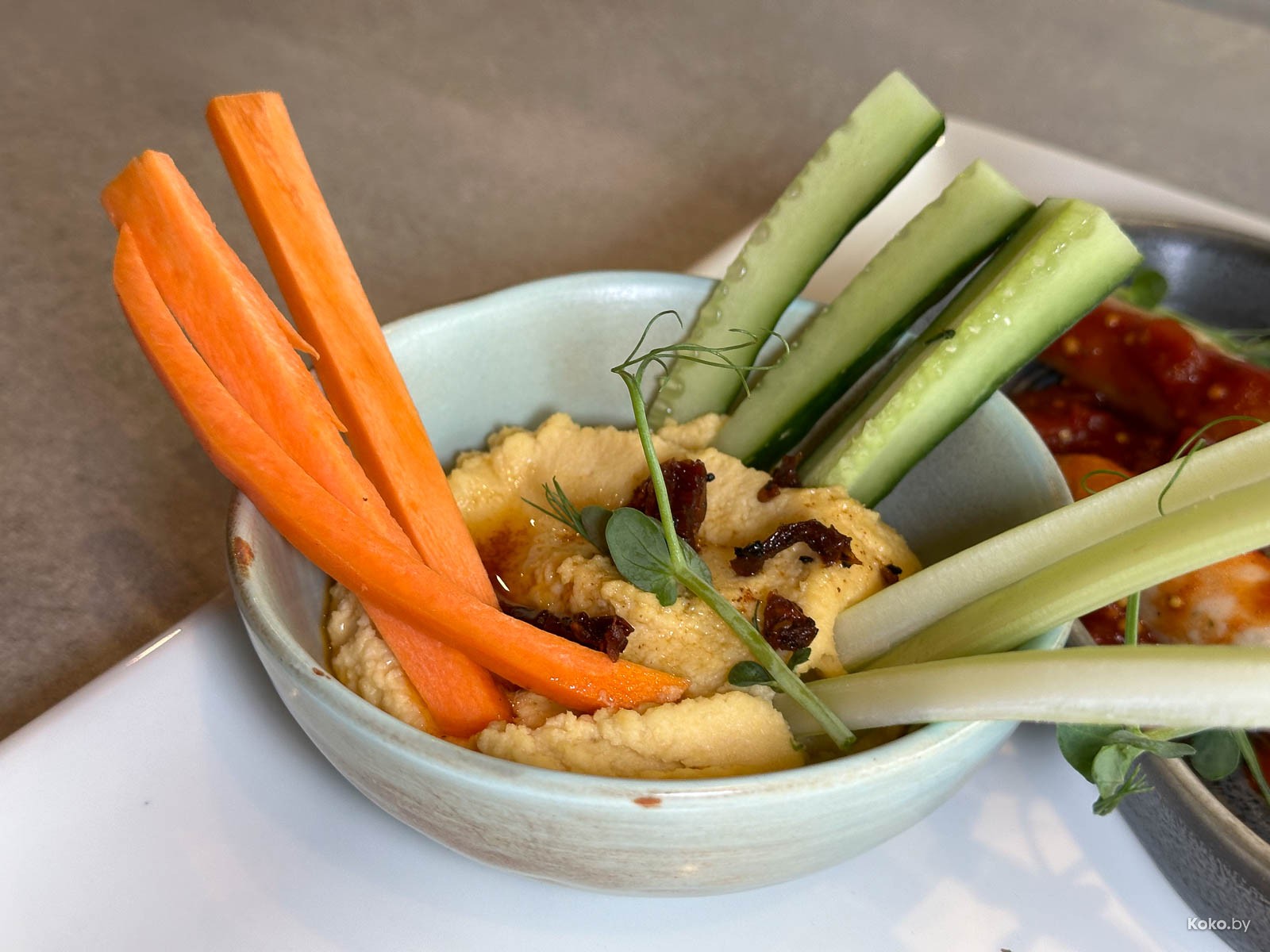 У хумуса полностью нарушена рецептура, он как будто взбит из капусты с овощами. Тхины не чувствуется, как и всего остального. Негодно.