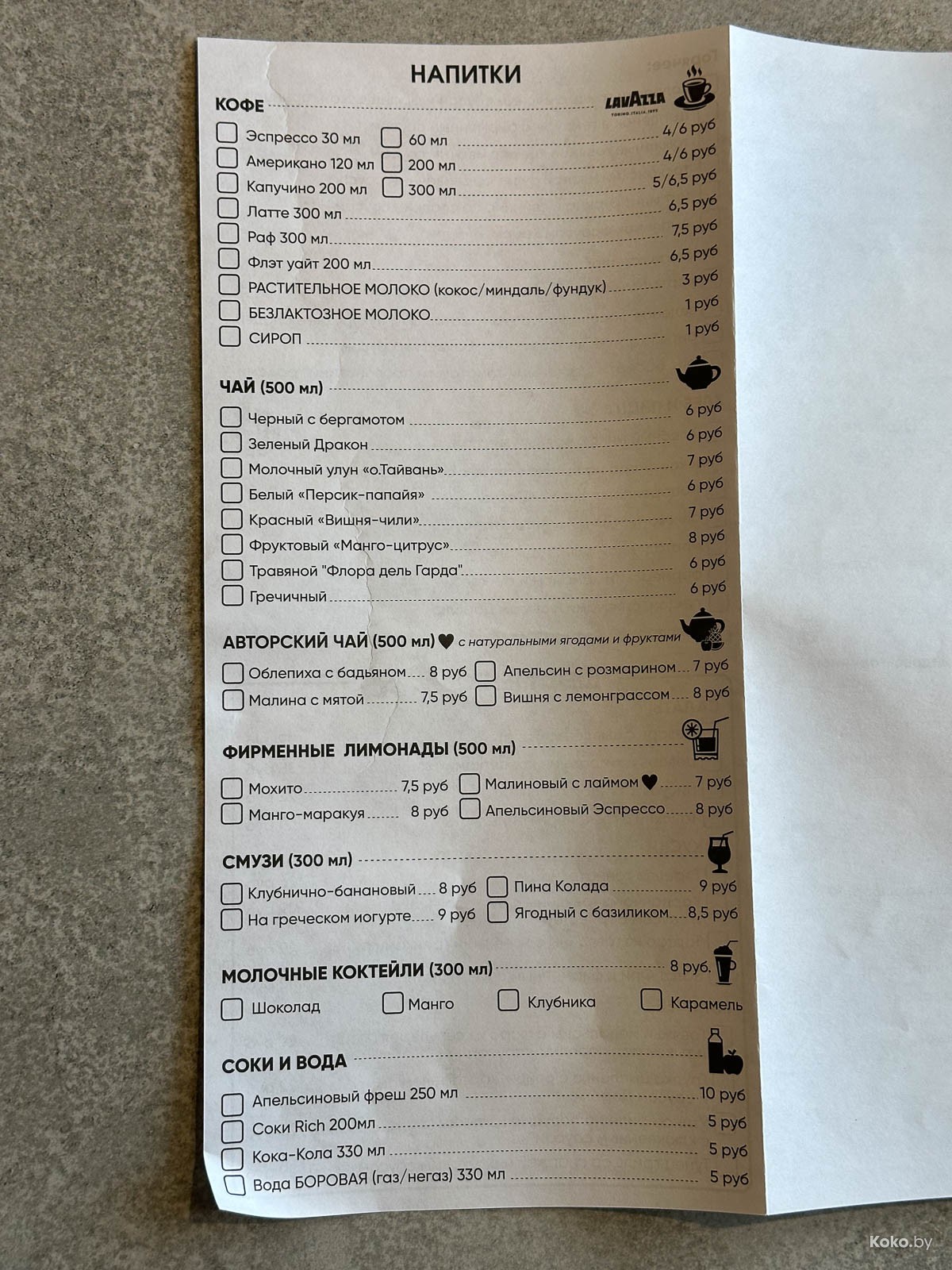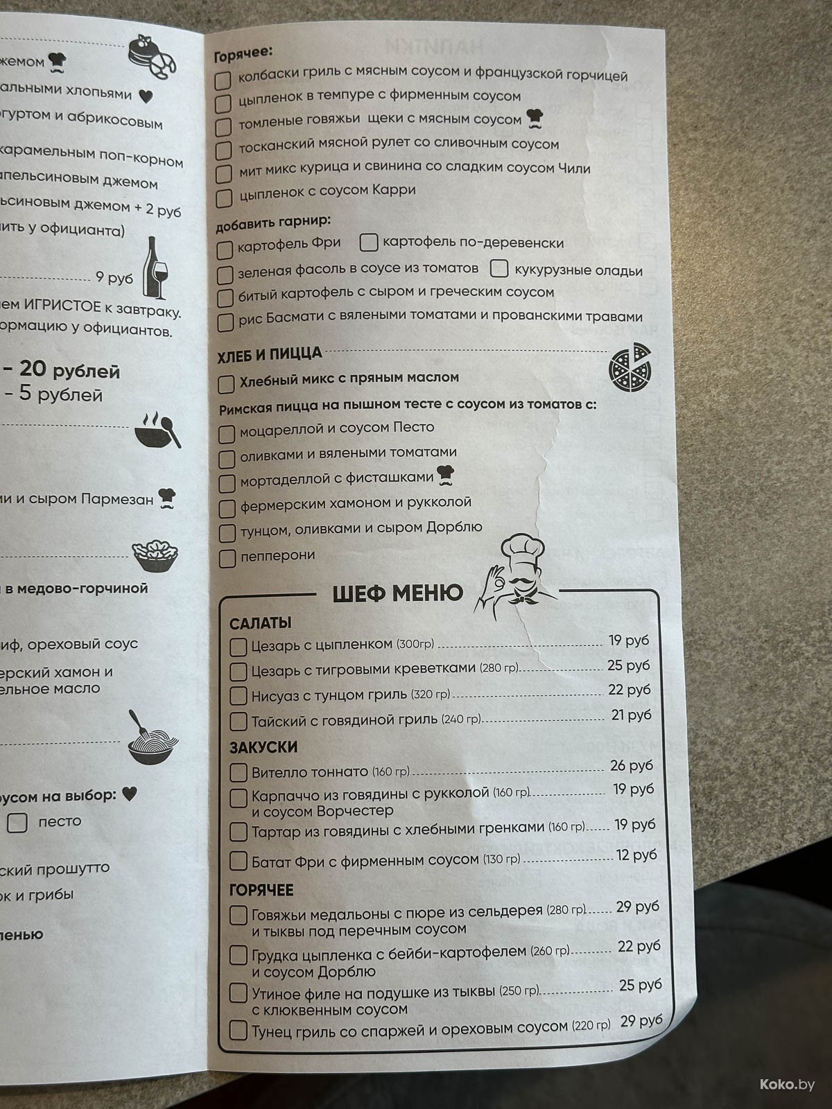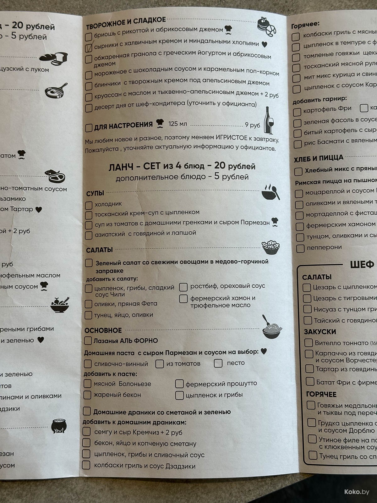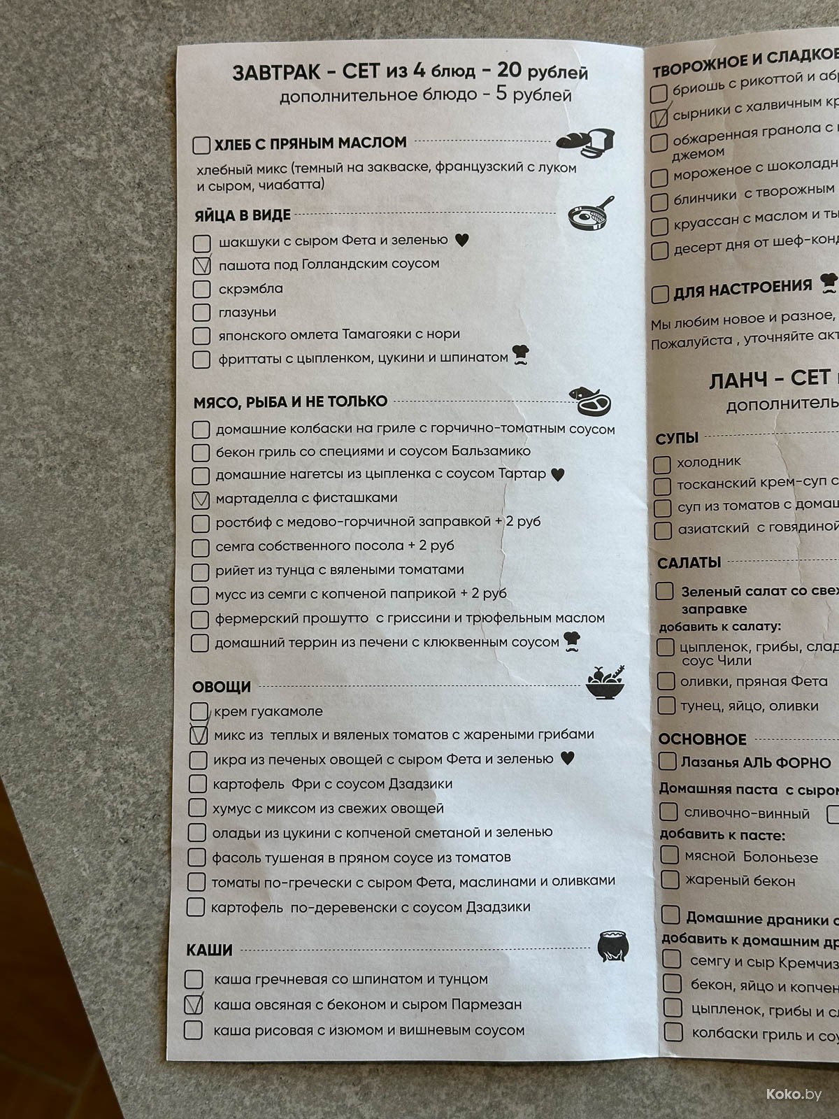Делится оно на завтраки, где можно выбрать из много всего по чуть-чуть, пометив карандашом желаемое блюдо. За 4 тарелочки с едой - 20р, каждая последующая ещё 5р, в «Мон Ном» за 5 тарелочек просят 22р.
