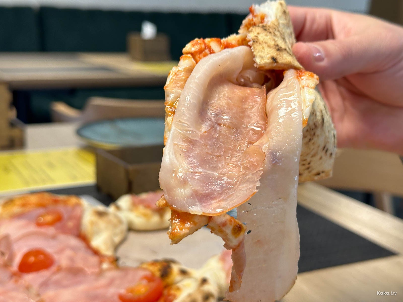 1. Первая у нас Парма за 22р с идеально нарезанным свиным окороком, грешным делом обрадовался, что домашнее сало. Тесто тонкое, воздушное, хорошо пропечённое, промазано сладкой томатной пастой.
