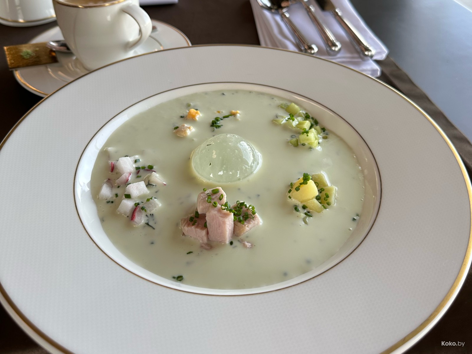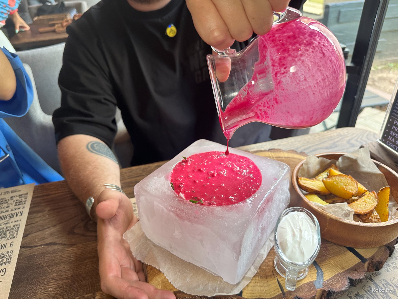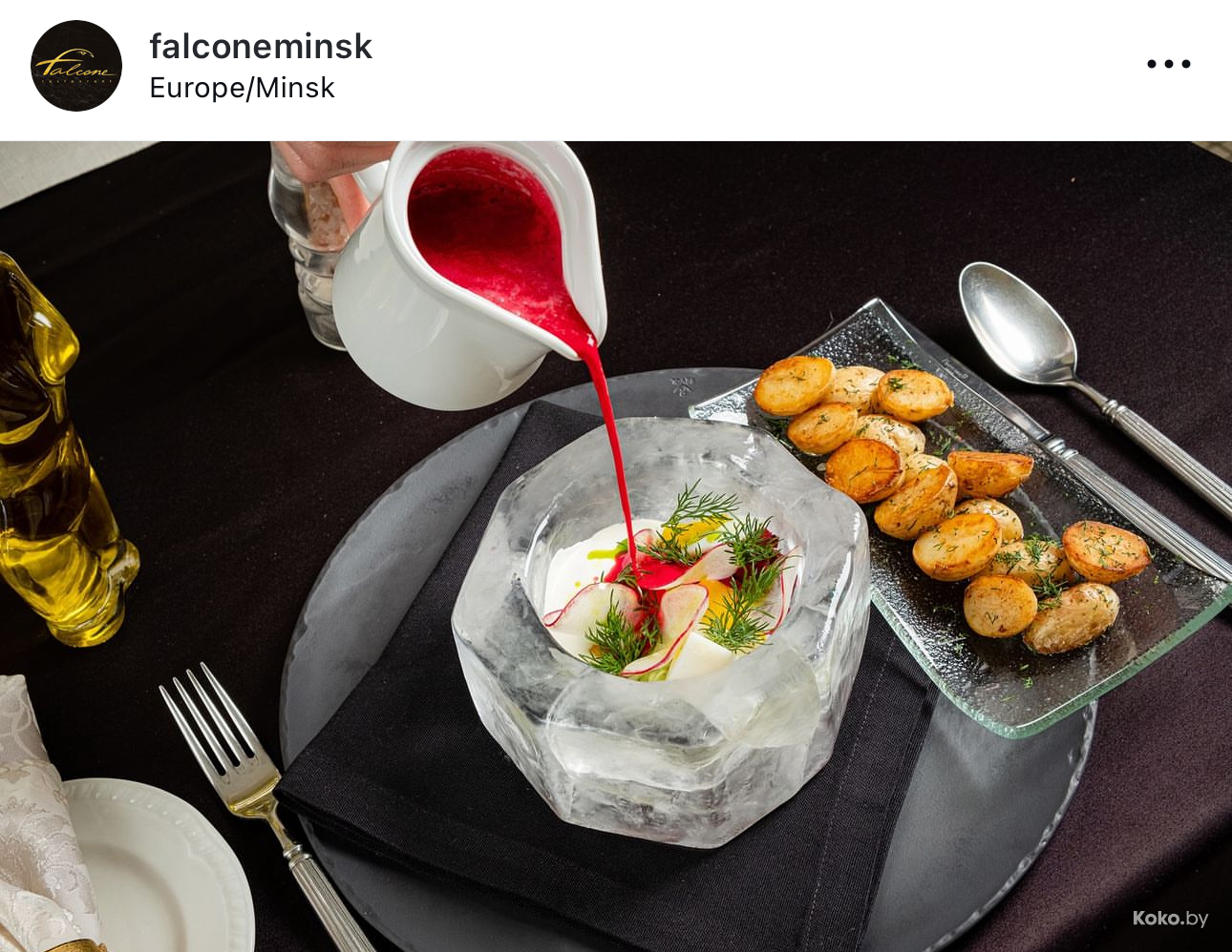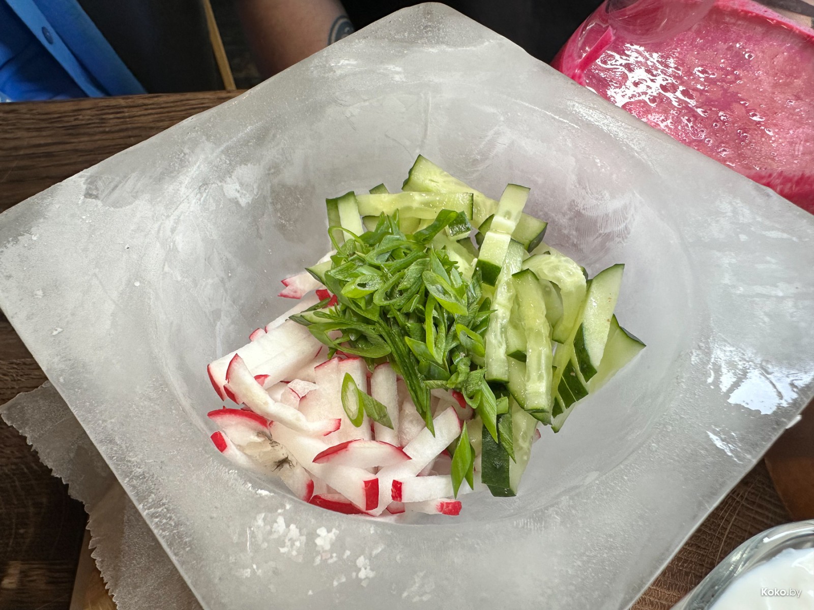 Так холодник подают только тут и в старом «Фальконе» за лютые 25р по предварительной записи на глыбу льда. Ещё красиво делают с индюшиной окрошкой за 19р в ресторане на природе «Лебяжий». Там в овощную тарелку с мясом кладут сферу из замороженной воды, а сверху прям на неё льют кисломолочную смесь. Одна из лучших окрох в городе, не жалко и копилку бахнуть. Мой обзор на почти все холодники Минска этого лета оцените опосля супа по-ледниковски.