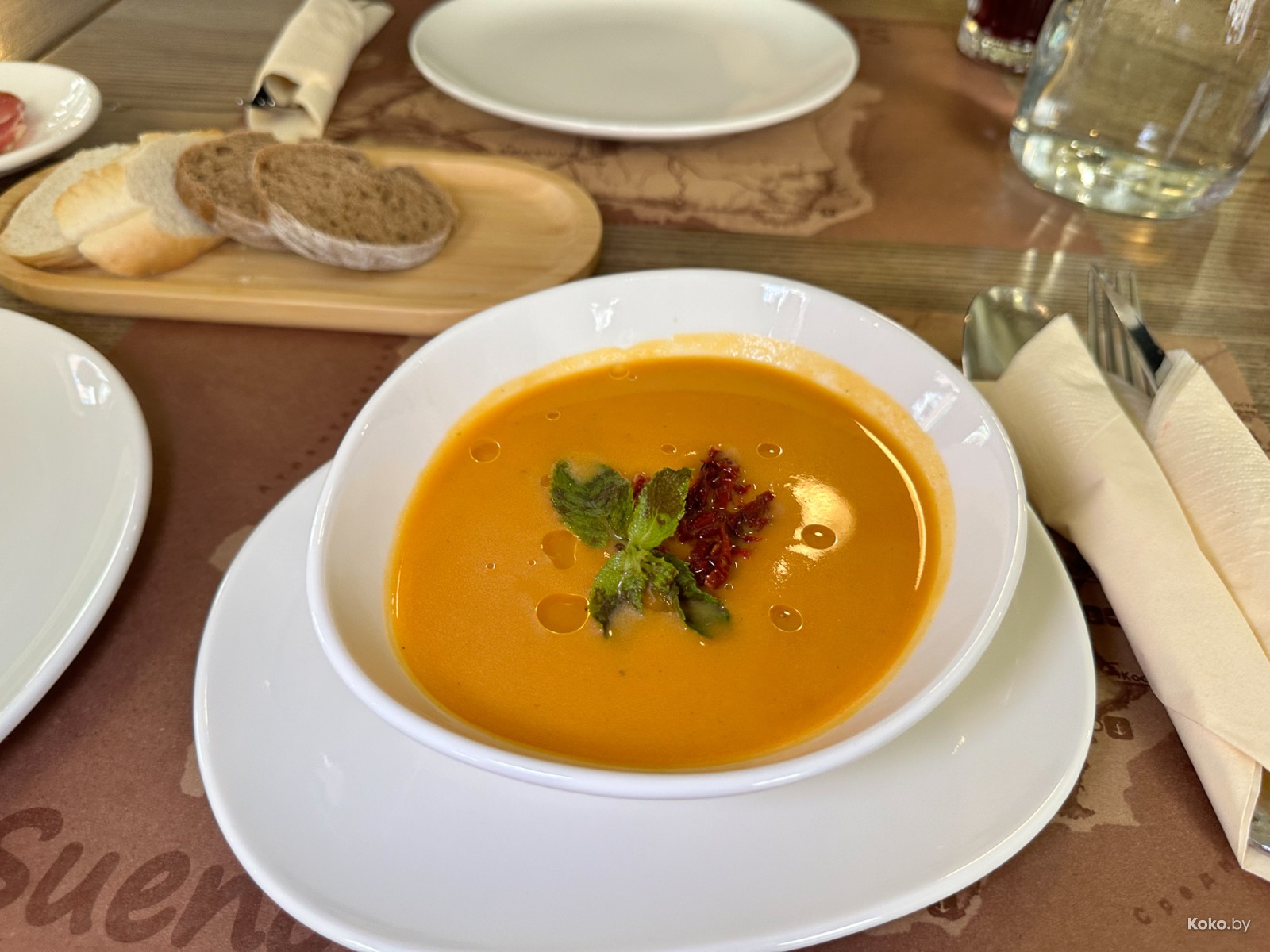 1. Раз, и на столе жёлтое гаспачо, потому что из тыквы. Старый, ты давай состав читай, а то это самое. Элементарный холодный суп из тыквы, в который порубили вяленые томаты. Зря потраченные 15р.