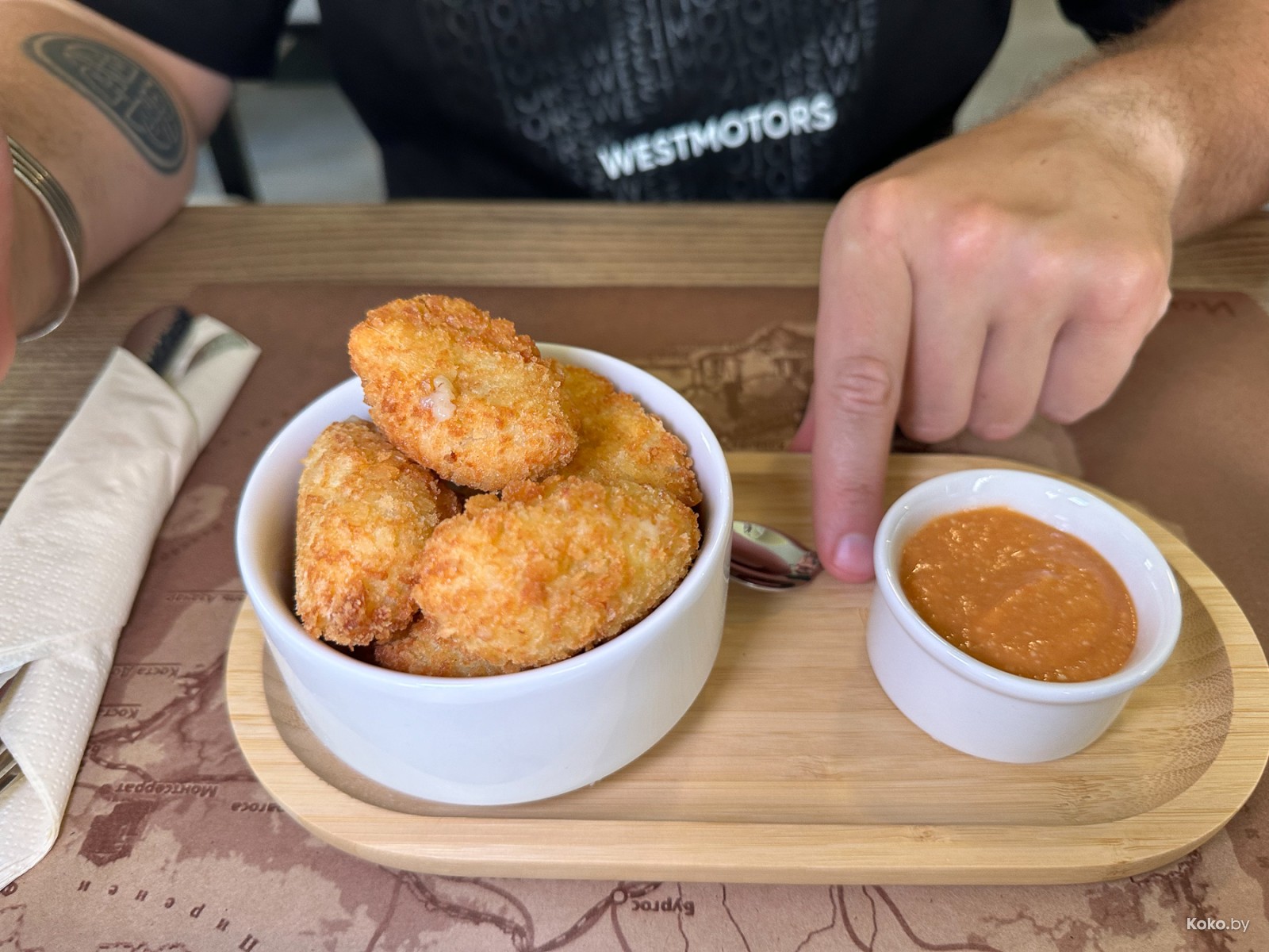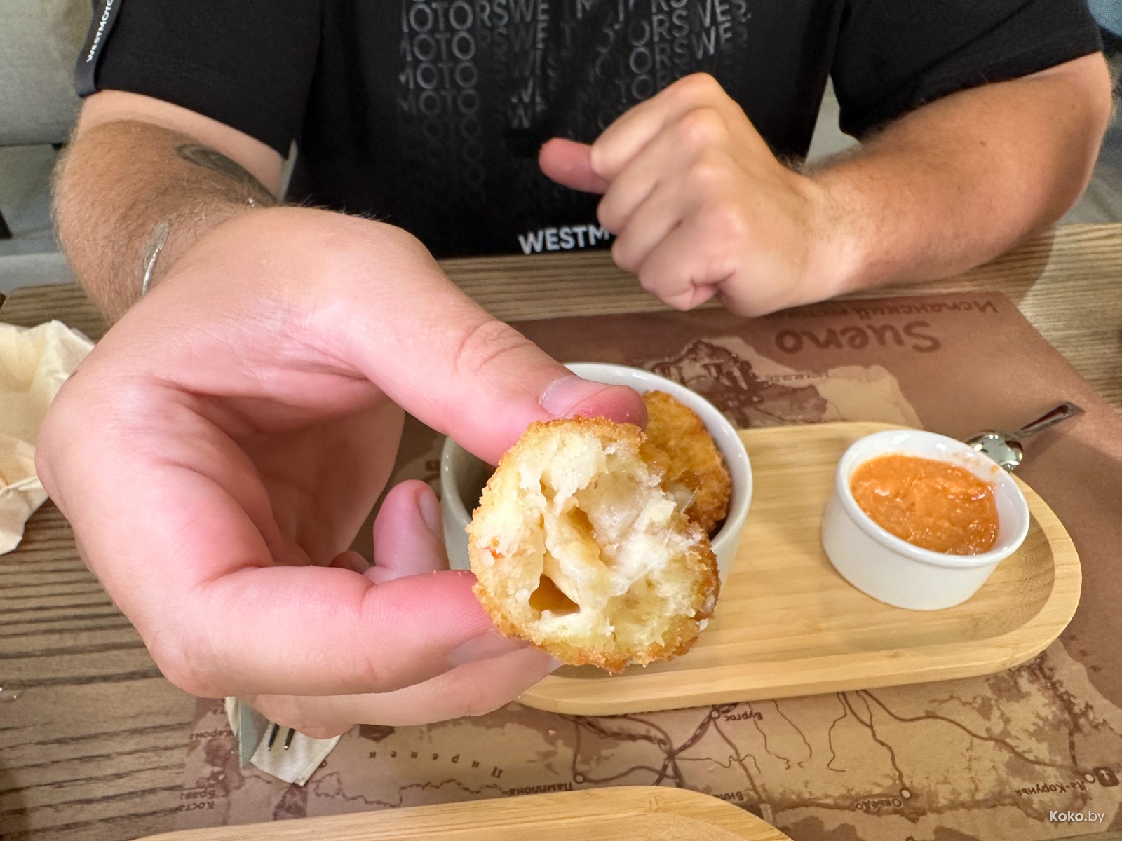 3. За 17р местные сырные крокеты с хамоном внутри с соусом снаружи. Хрустящая панировка, тают во рту, вкусно, когда в соусе.