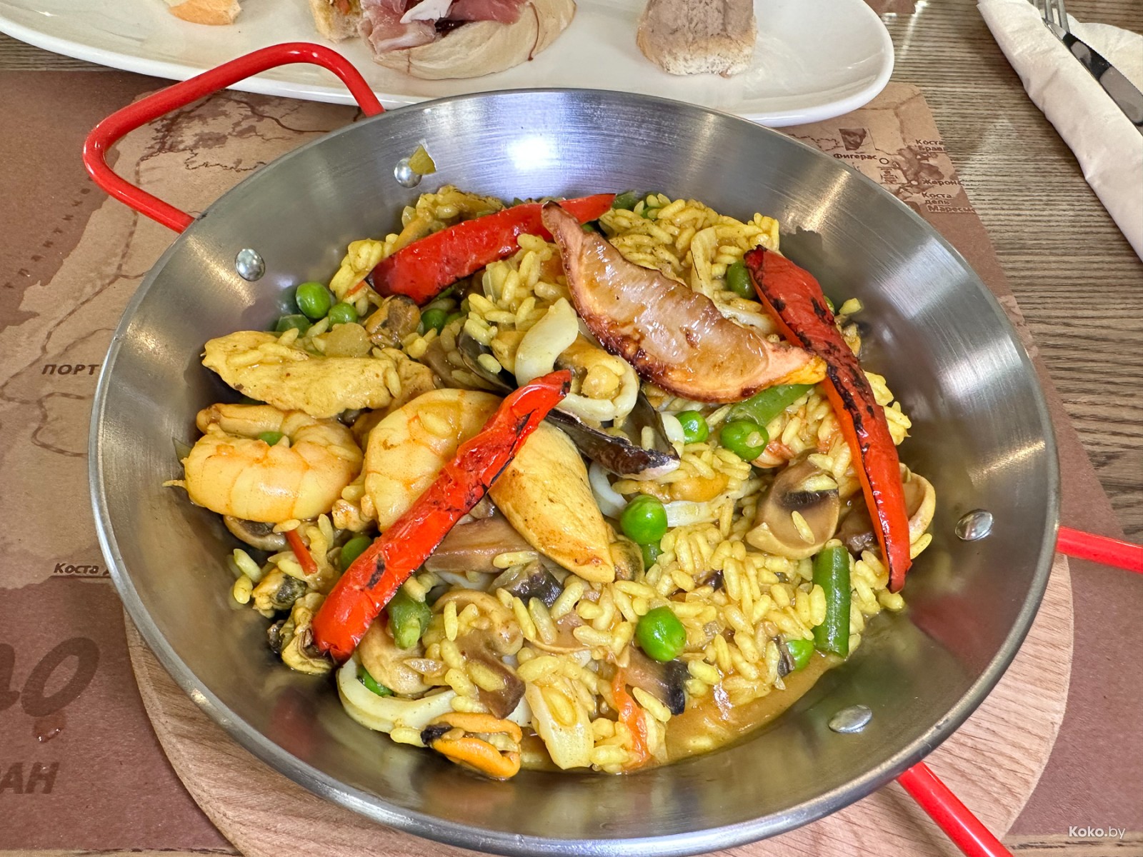 6. Контрольный выстрел - паэлья с мориками за 35р. Эстетичная подача, справедливая порция креветок, кальмаров и мидий, замиксованных с курицей, про шафран не забыли, но паэлья суховата. Мне вкусно!