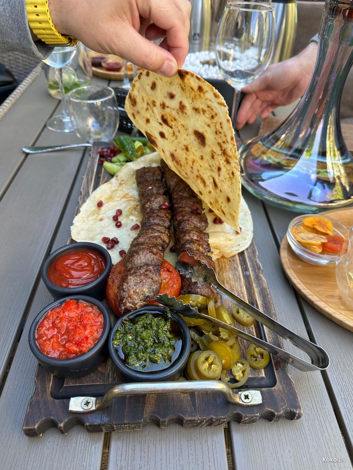 Доска кебабов с мангала в «Гостях», цену не помню, но это топище.