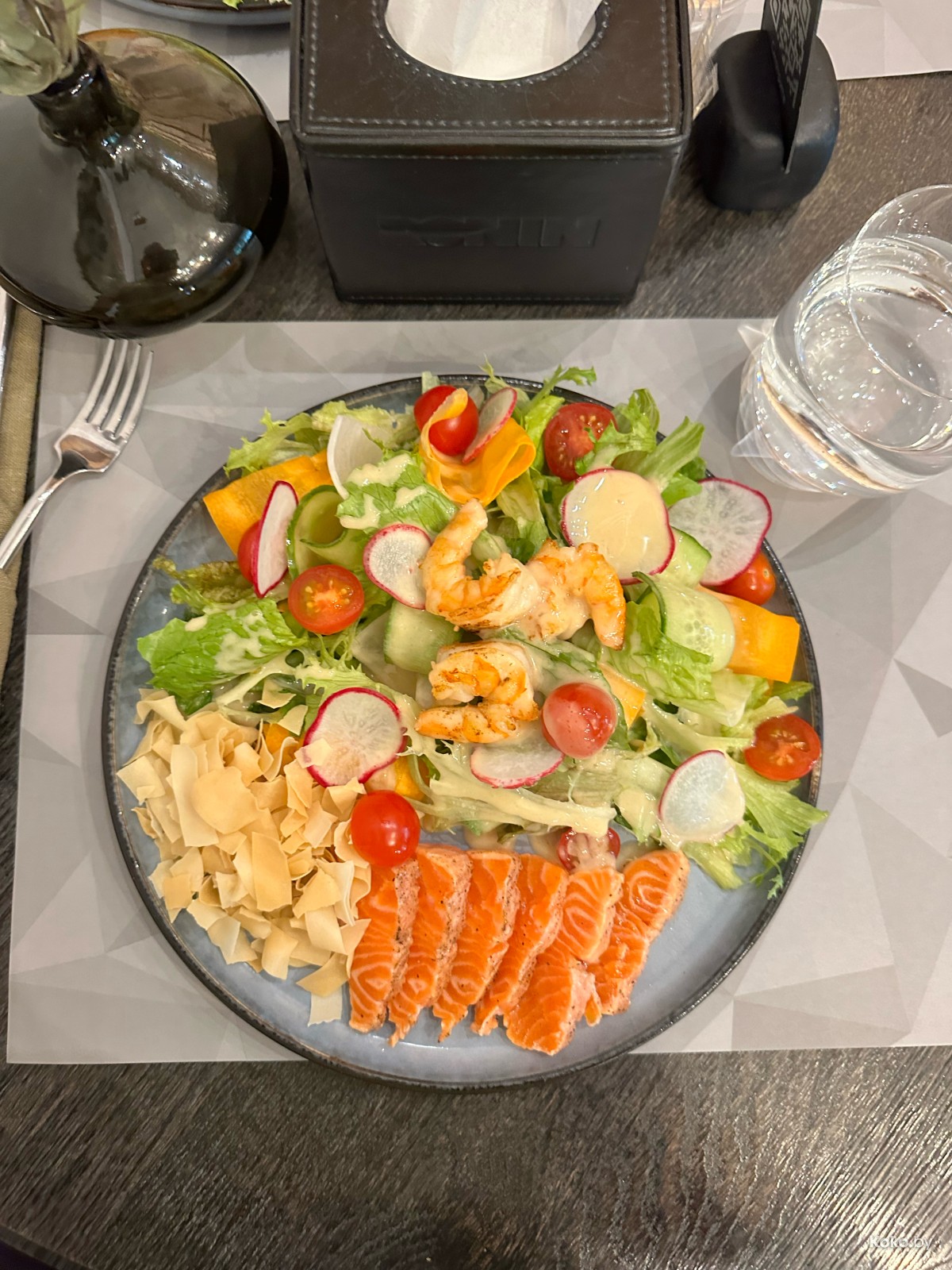 Просто ведро летнего салата с жареными креветками, нежнейшим лососем татаки под цитрусово-сливочной заправкой за 28р в «Ронин».