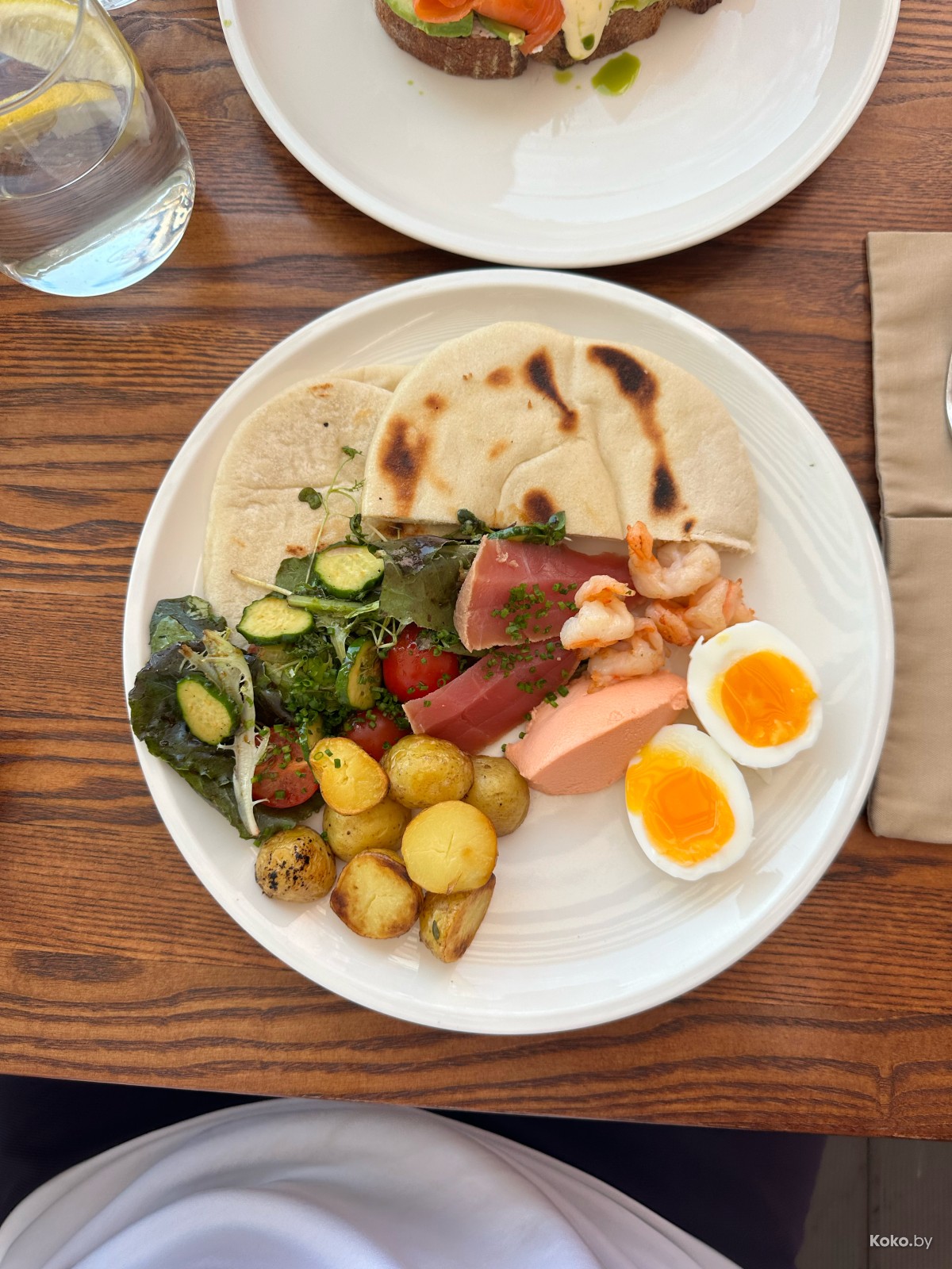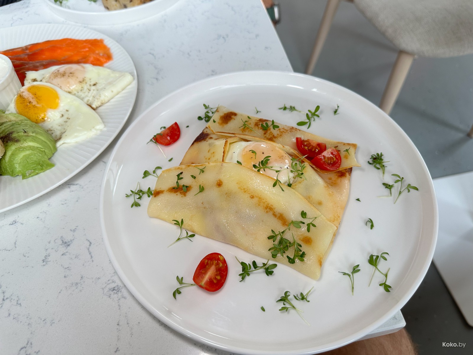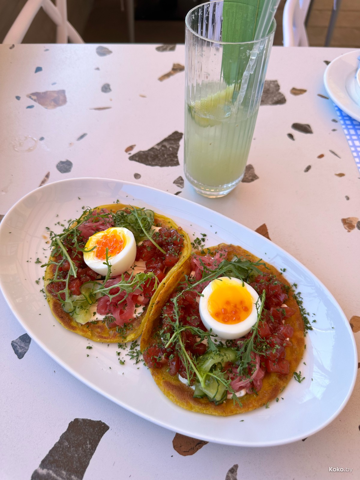 В классом выше рыбном бистро «Солт» на завтрак две индийские лепёшки с тартаром из тунца и красной икрой в яйцах за 23р.