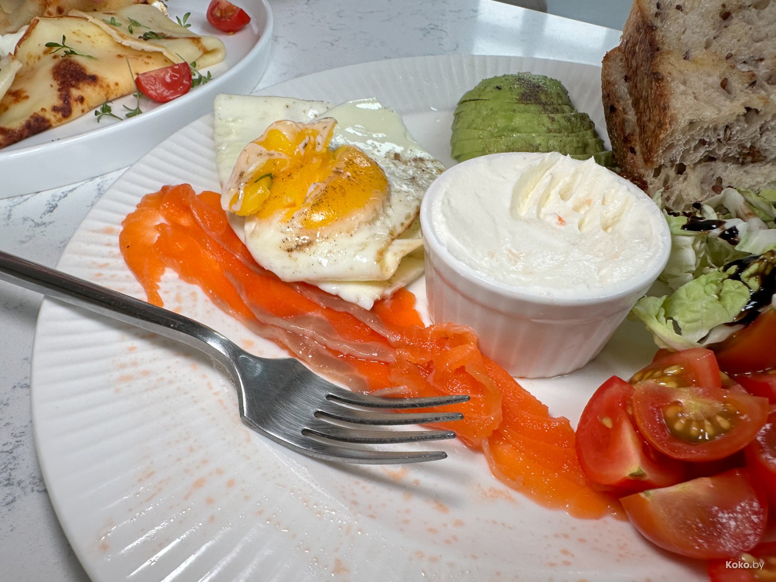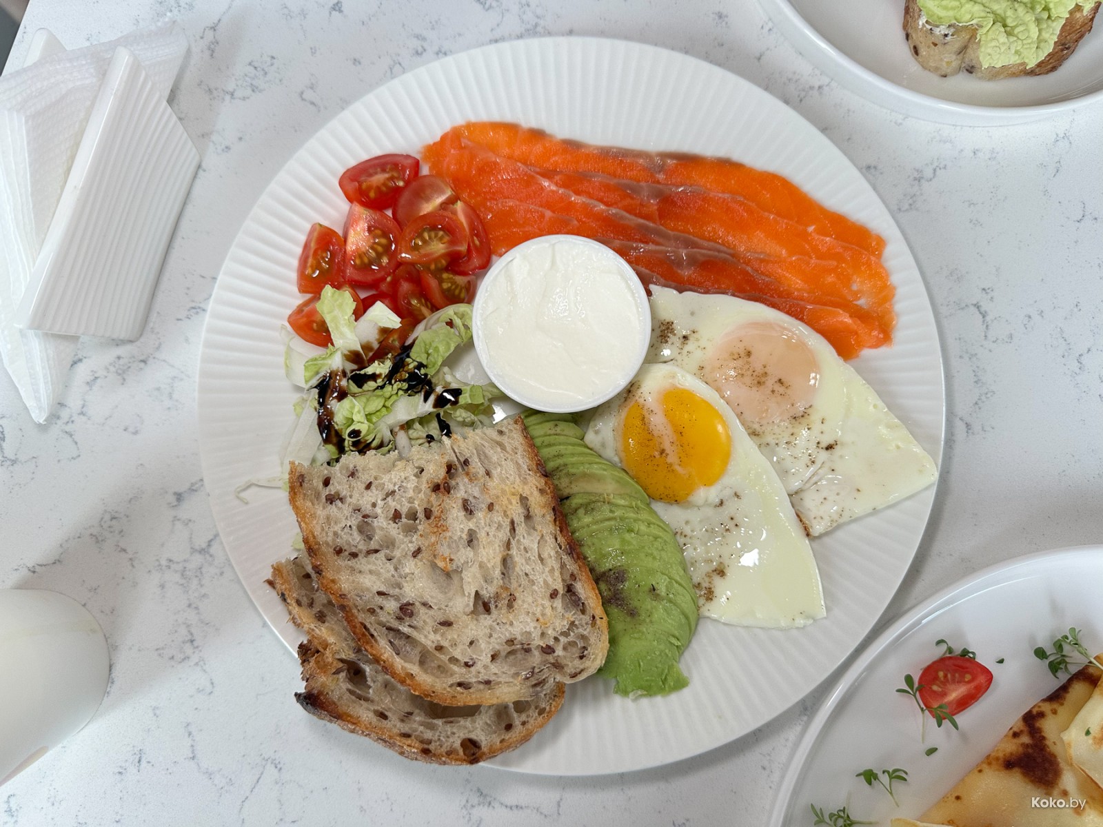 2. Большой лососевый за 25р, как разобранный, авокадо-тост плюс лосось. Но лосось не классический солёный, а перемороженный до состояния снега со вкусом рыбы. В глазунье желтки вкрутую, снова.