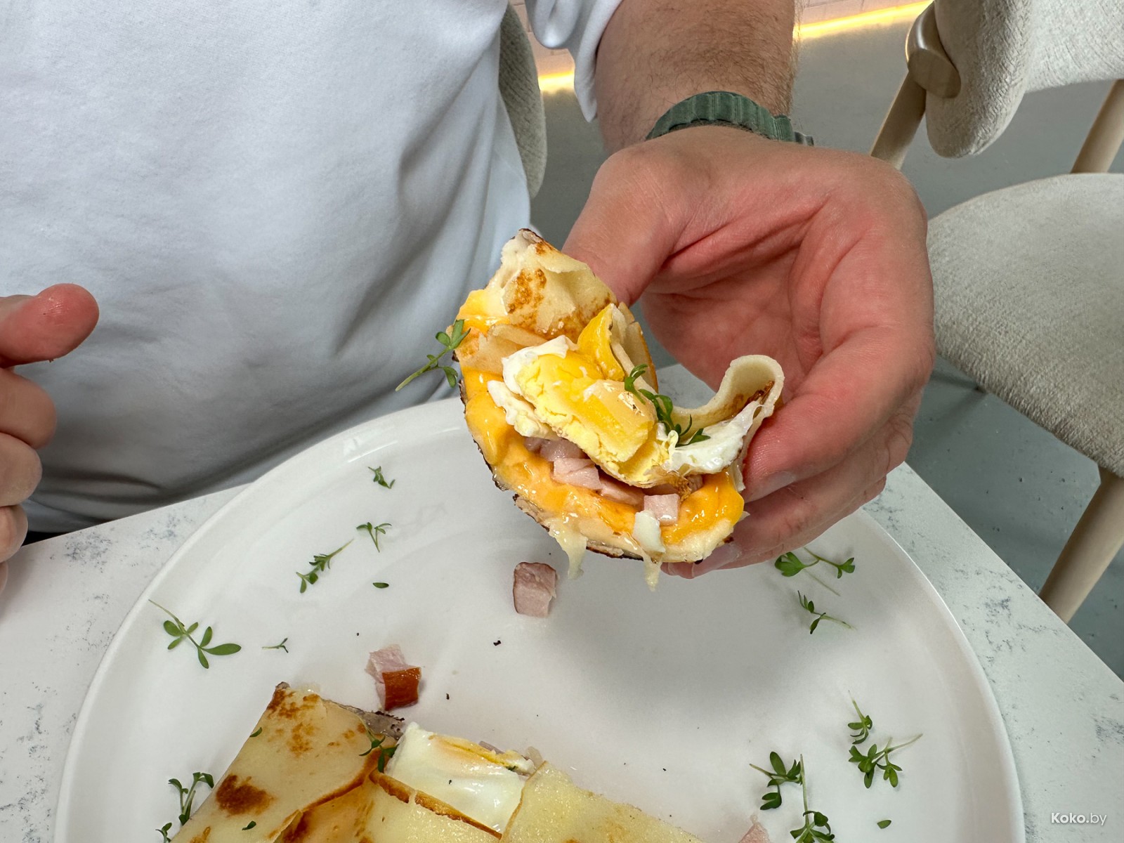 3. За 16р открытый деревенский блин с ветчиной и глазуньей, которую опять запекли. На кухне какие-то проблемы с яйцами. Сам блин нежный, внутри честная порция колбасы и двух видов сыра. Без эмоций вкусно.