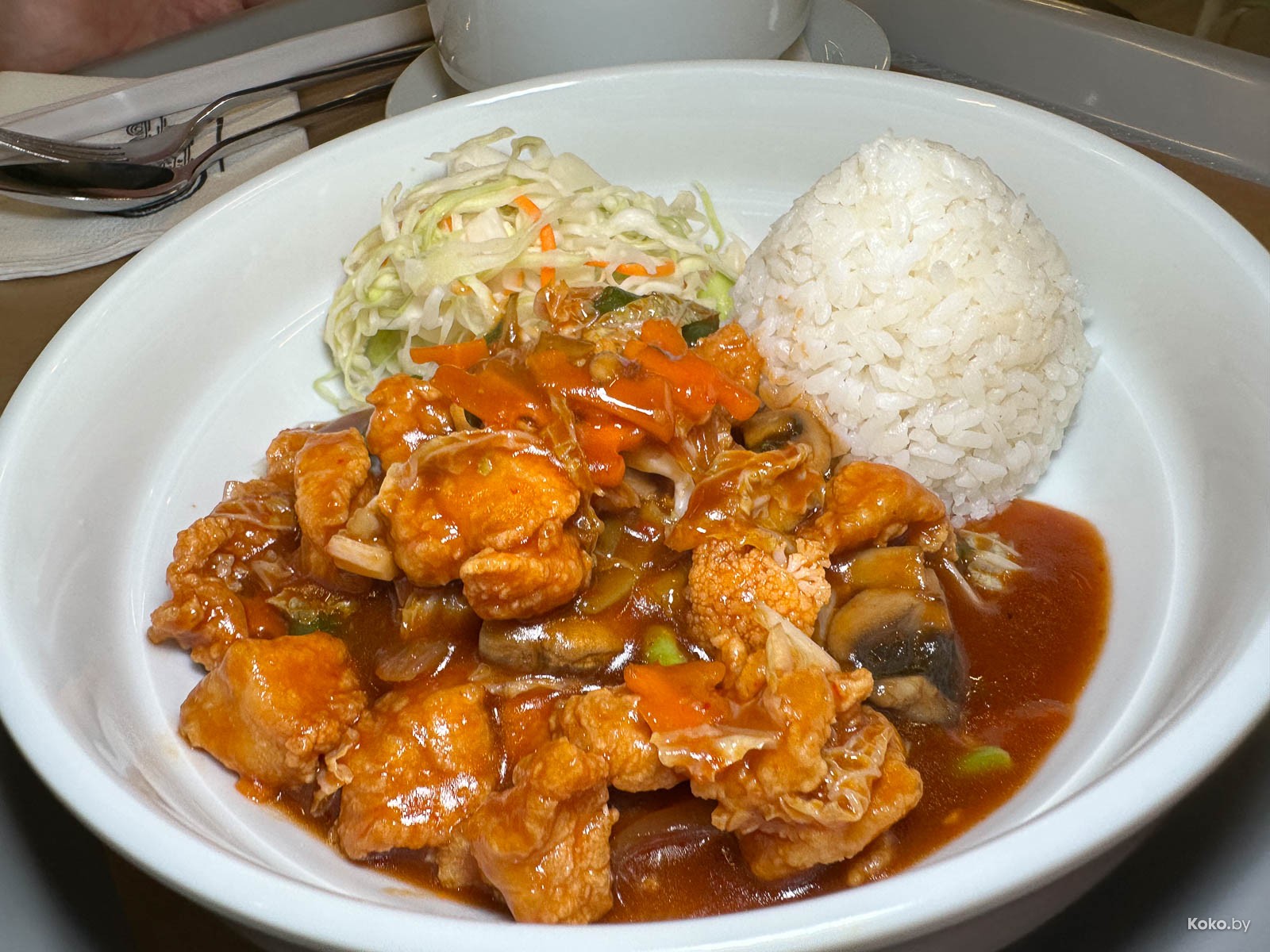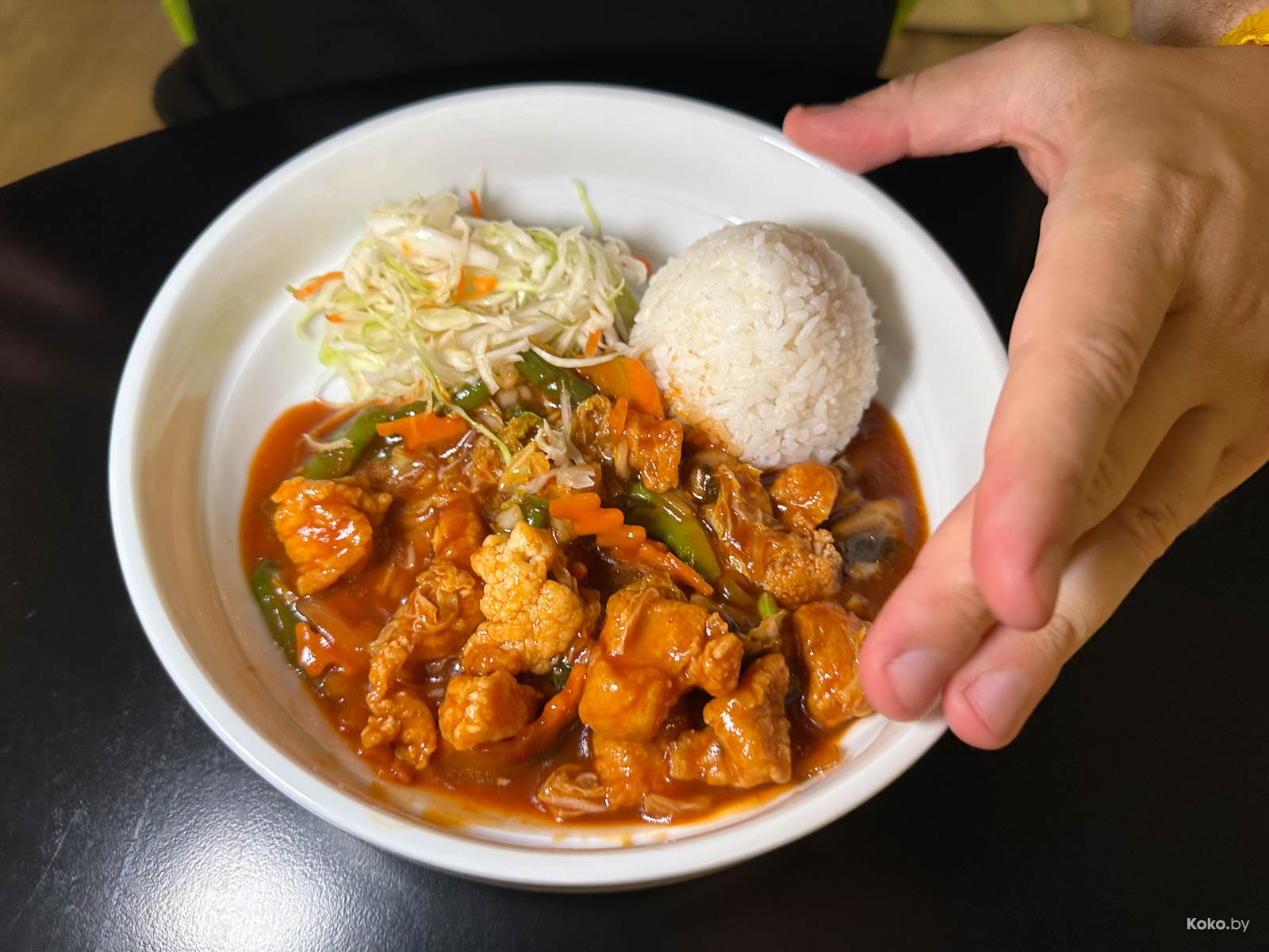 2. Курица, не факт, что филе, как остатки от «KFC» в кисло-сладком соусе, гармонично сочетается с салатом и сухим рисом. Усилители вкуса?