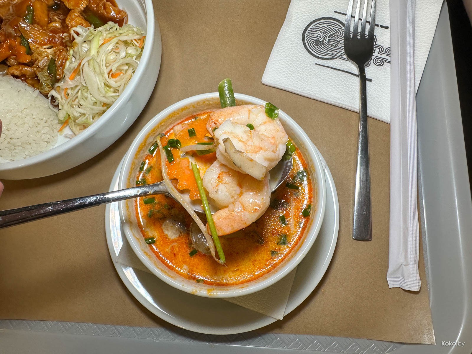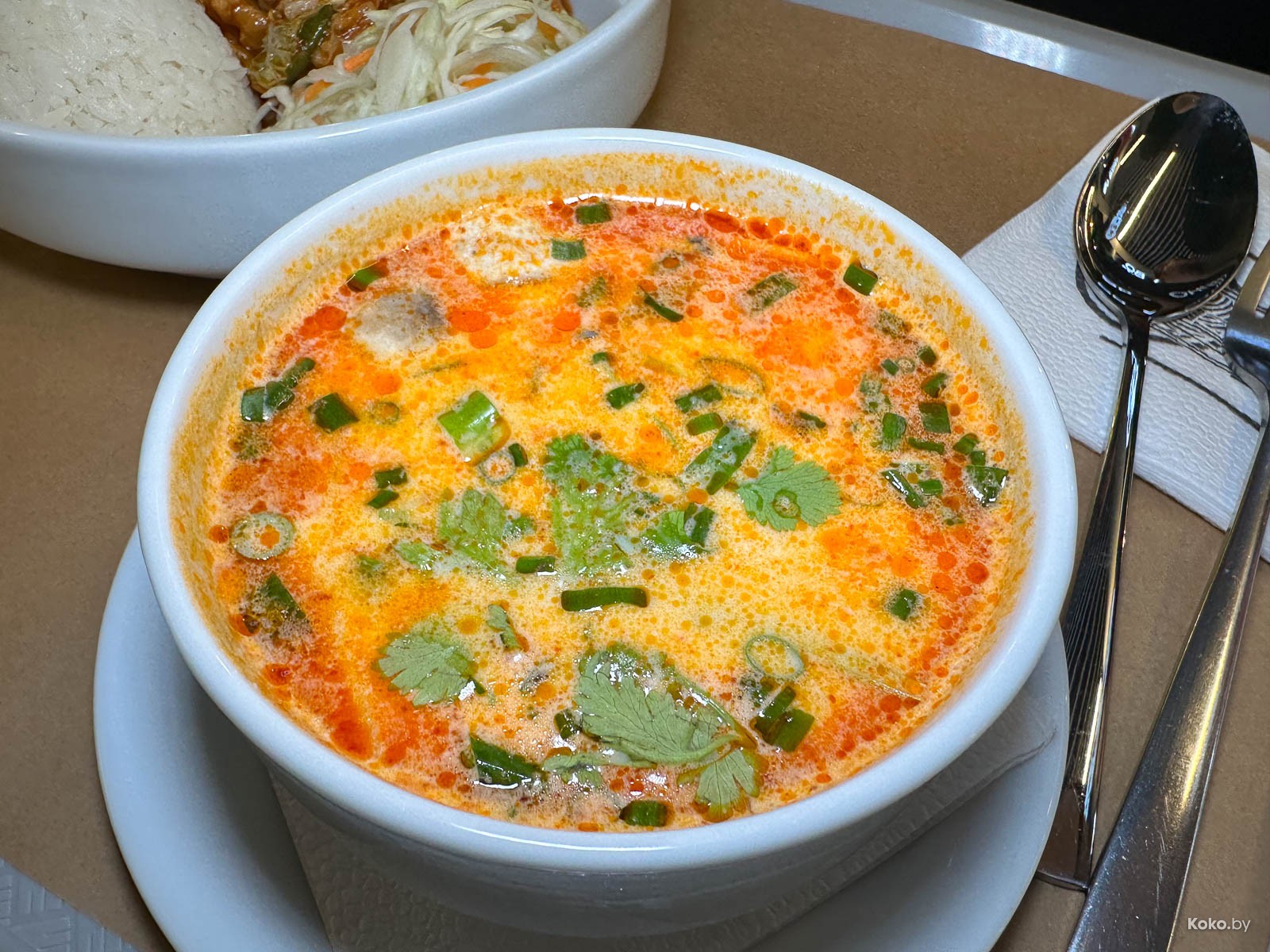 Бульон, насыщенный ароматной креветочной пастой, слегка сладкий, почти не кислый, вообще не острый, как из детского меню. Вкусно.