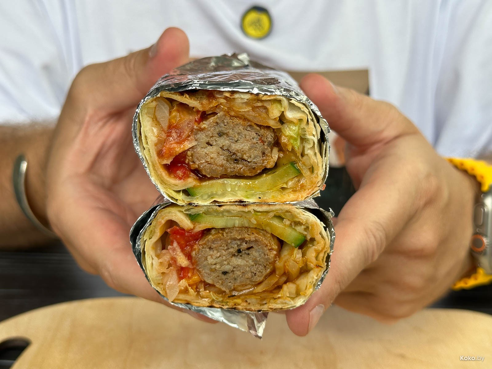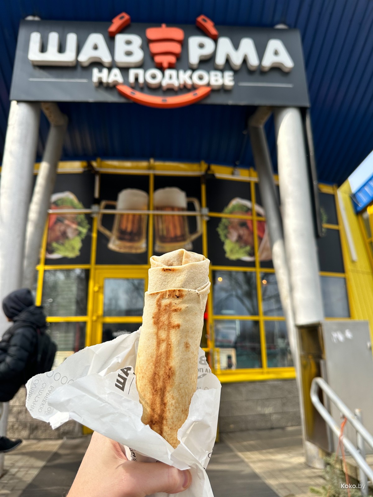 1. Шаурма с говядиной за 12р скручена грамотно, внутри оказался кебаб. Непривычное дело, рассчитывал на тонко нарезанное мясо с шишки.
