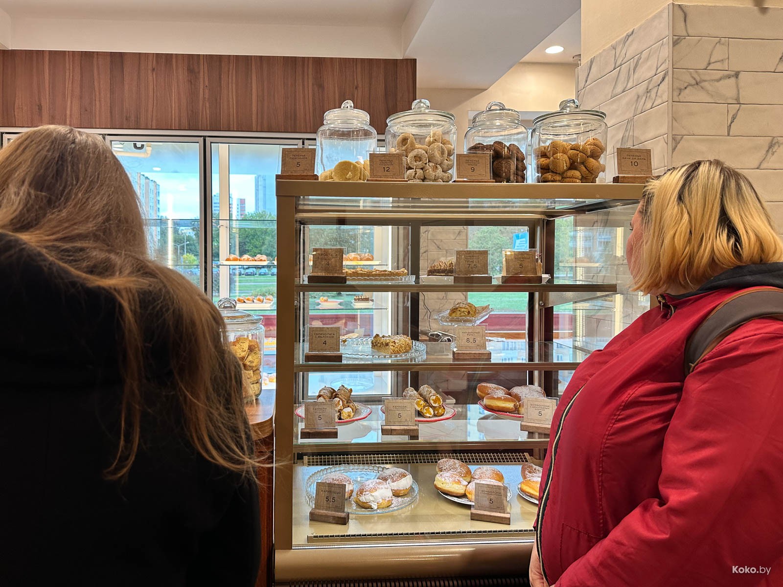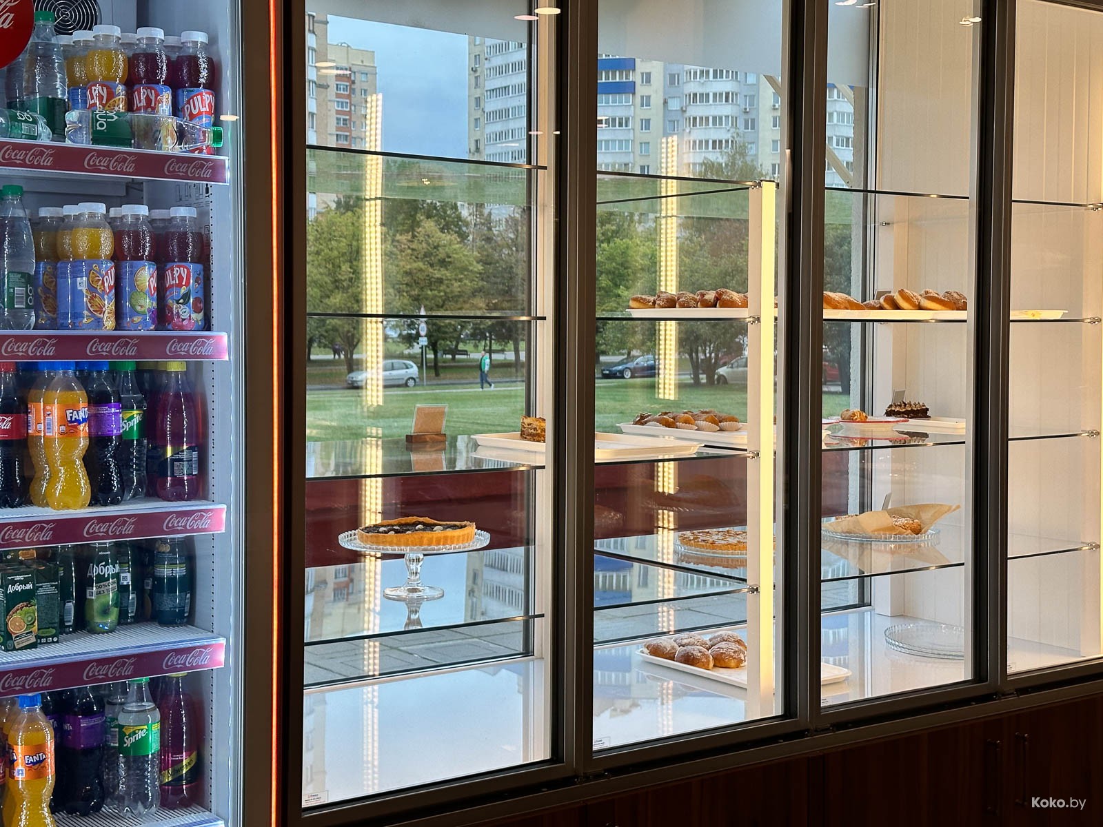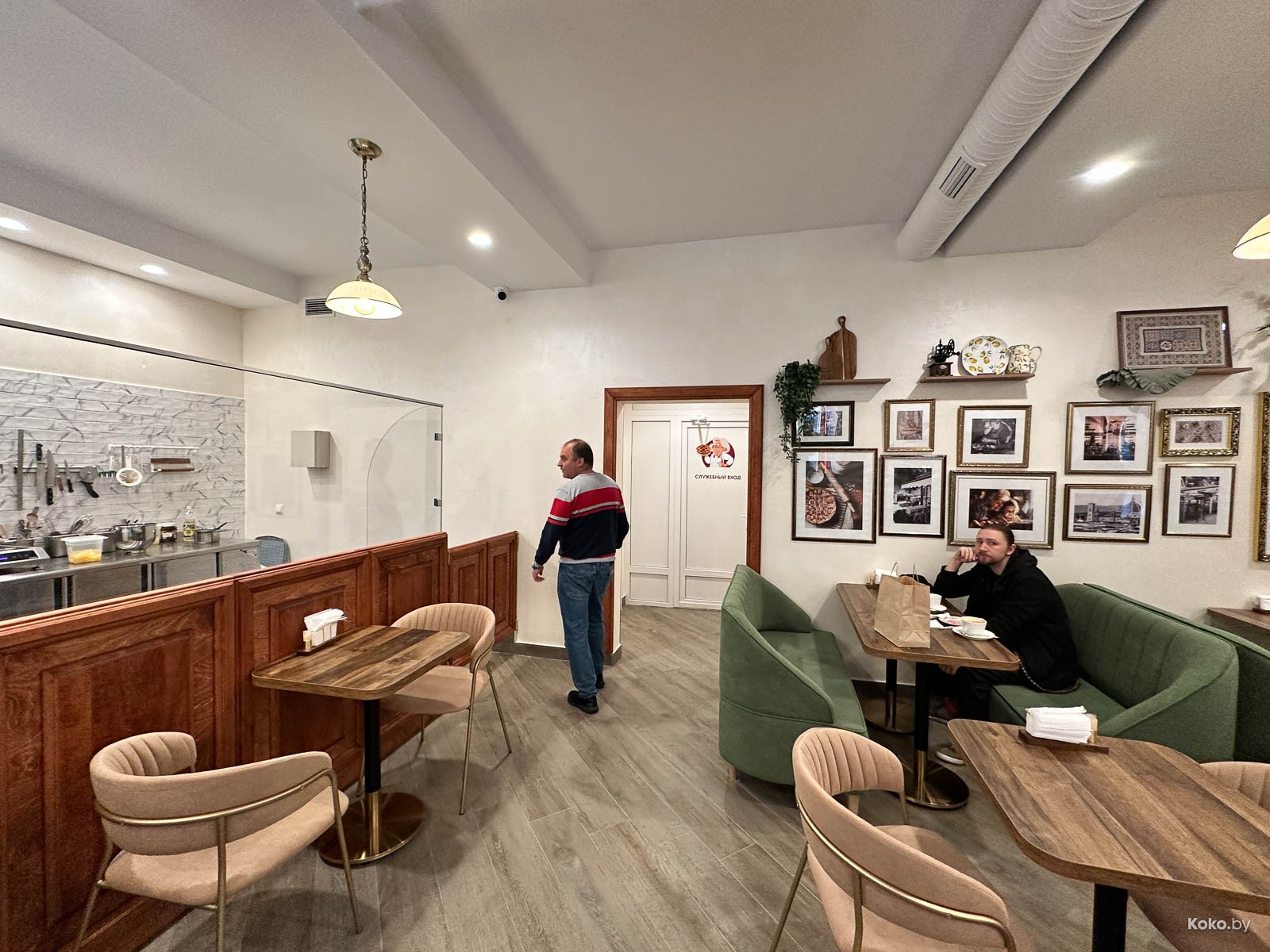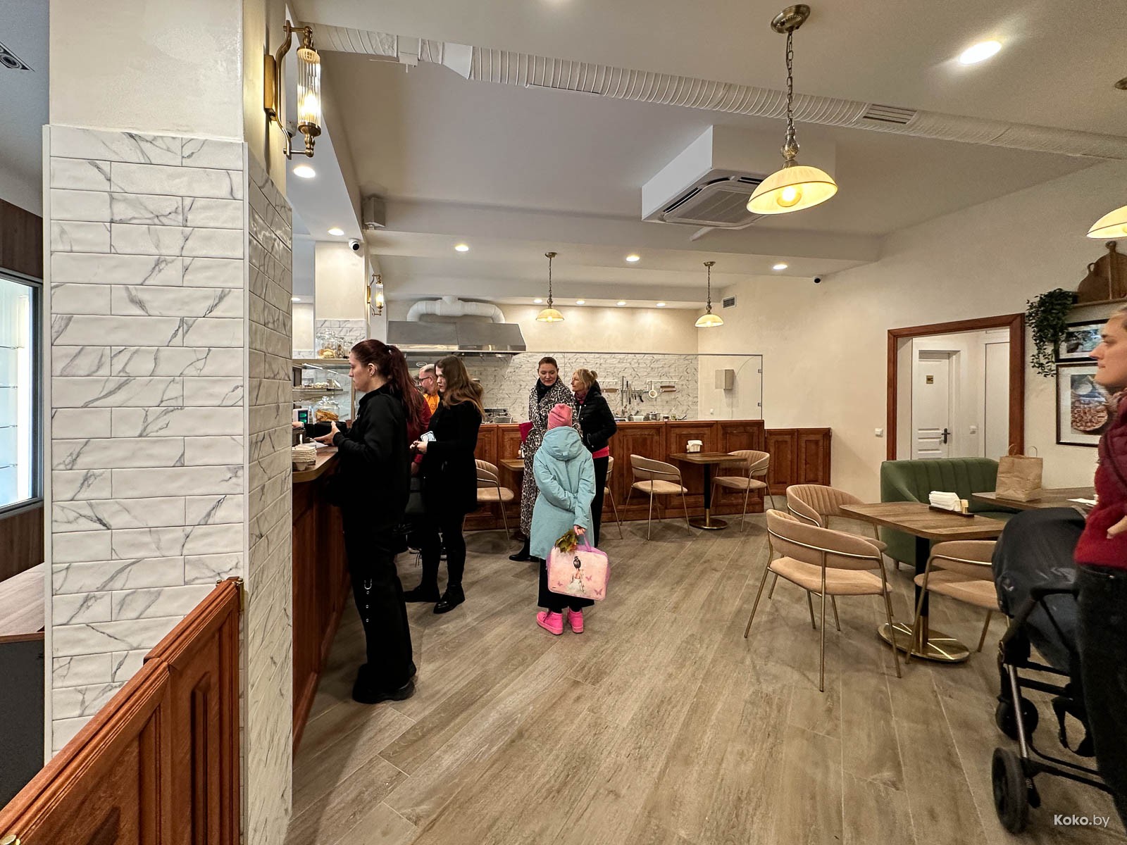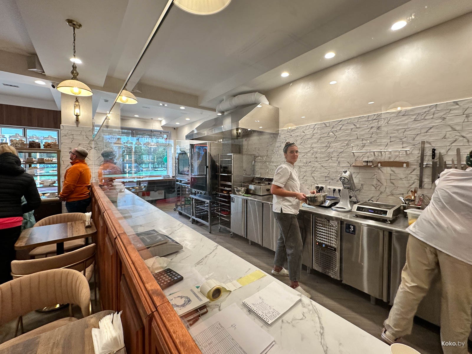 Пара столов, четыре мягких дивана, с десяток стульев, за стеклом полностью открытая кухня, концепт похож на уважаемое место про завтраки и хлеб «Лет ит би». Средняя степень уютности, между бабушкиной квартирой и полумодной кофейней на Октябрьской. Этакая пекарня с дегустационной площадкой, укусил, запил и домой.