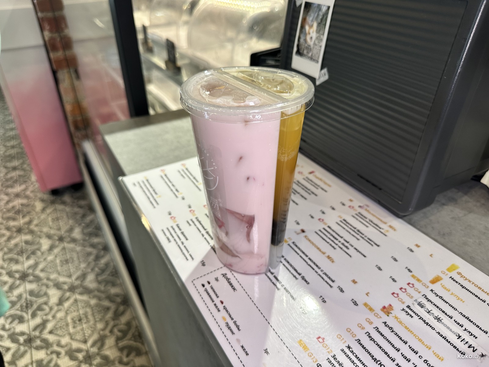 Тут берите кокосовое молоко со сладкими лепестками роз и зелёный чай с кисленькой маракуйей, тапиокой и кокосовым желе. Топ за 16р.