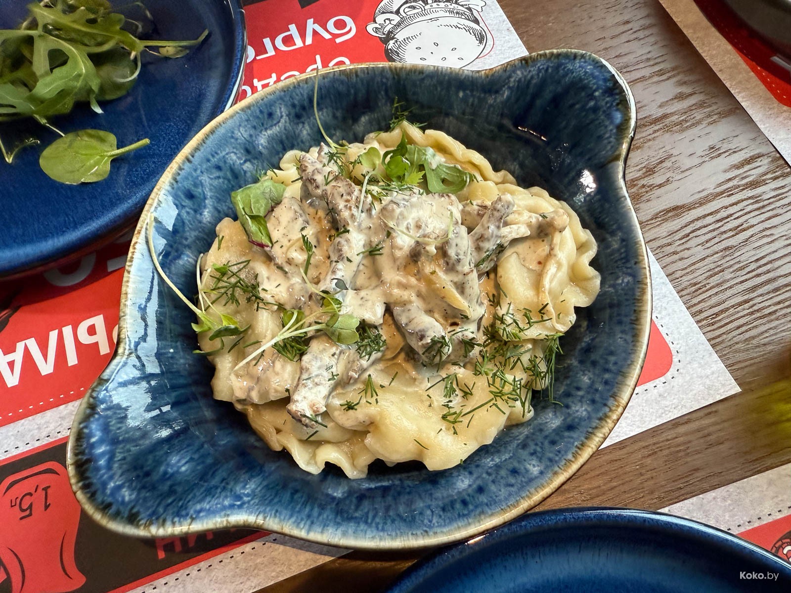 Вареники ручной лепки под сливочным соусом с мягкой говядиной. Сытно, вкусно, за 18р, на фото в меню порция выглядит щедрее.