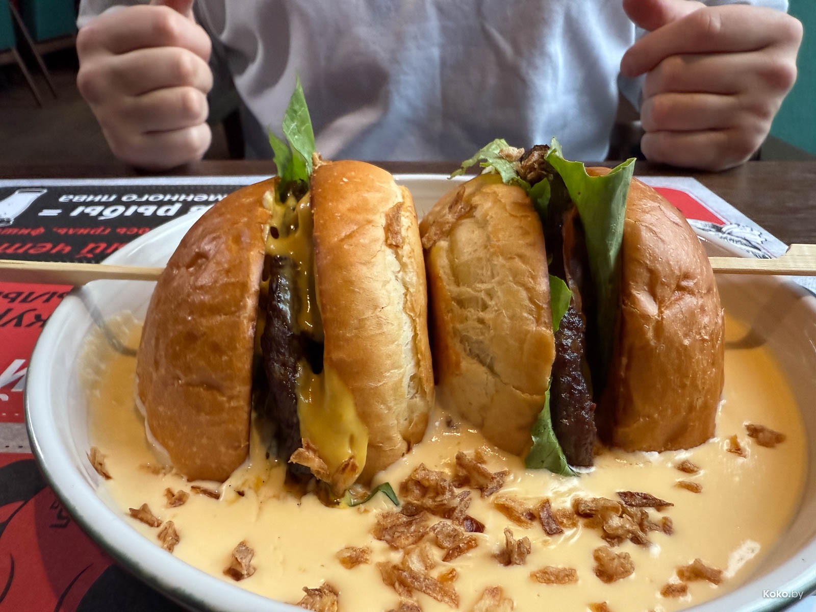 Булка воздушная, котлета тонкая, не сочная, внутри маринованный огурчик и помидор. Могли бы чуть картошки кинуть, да, вкусно макать бургер в сырный соус, особенно по средам , когда 2 по цене 1.