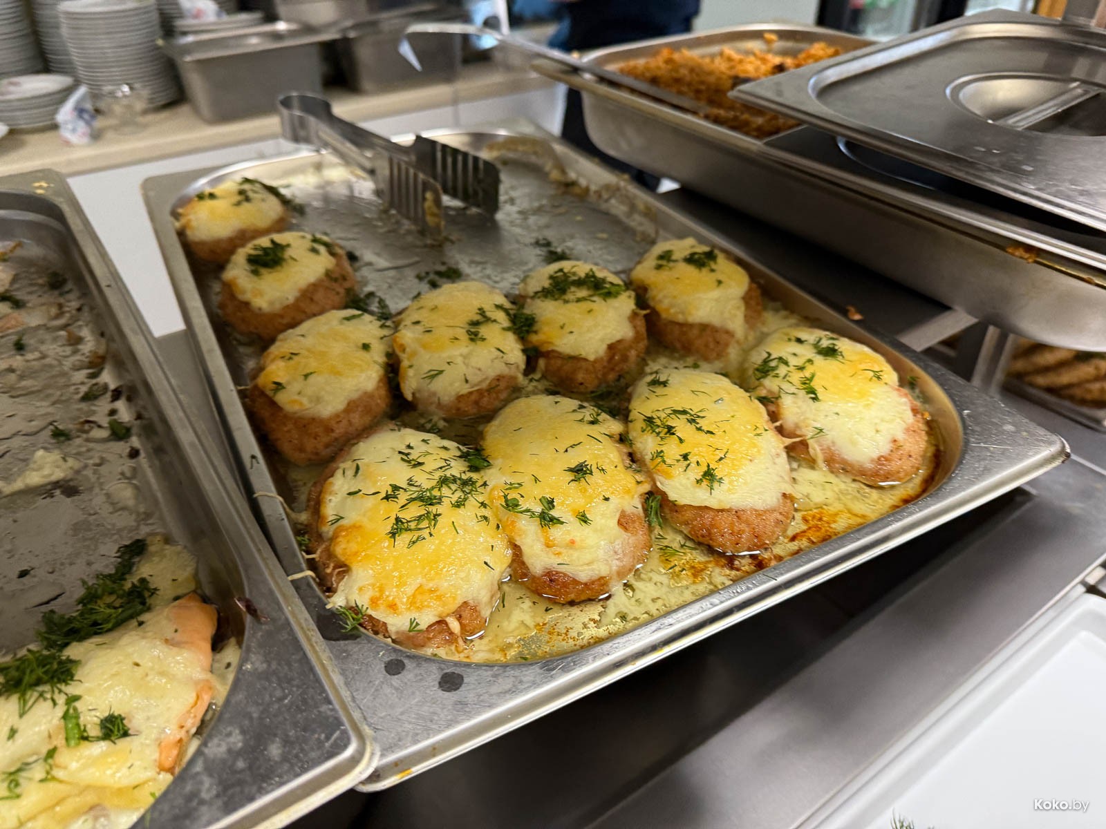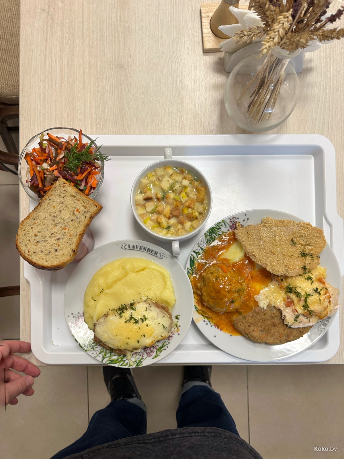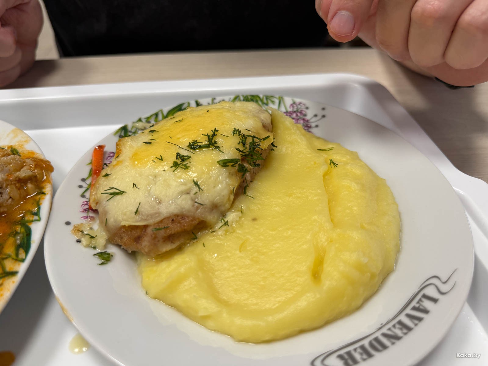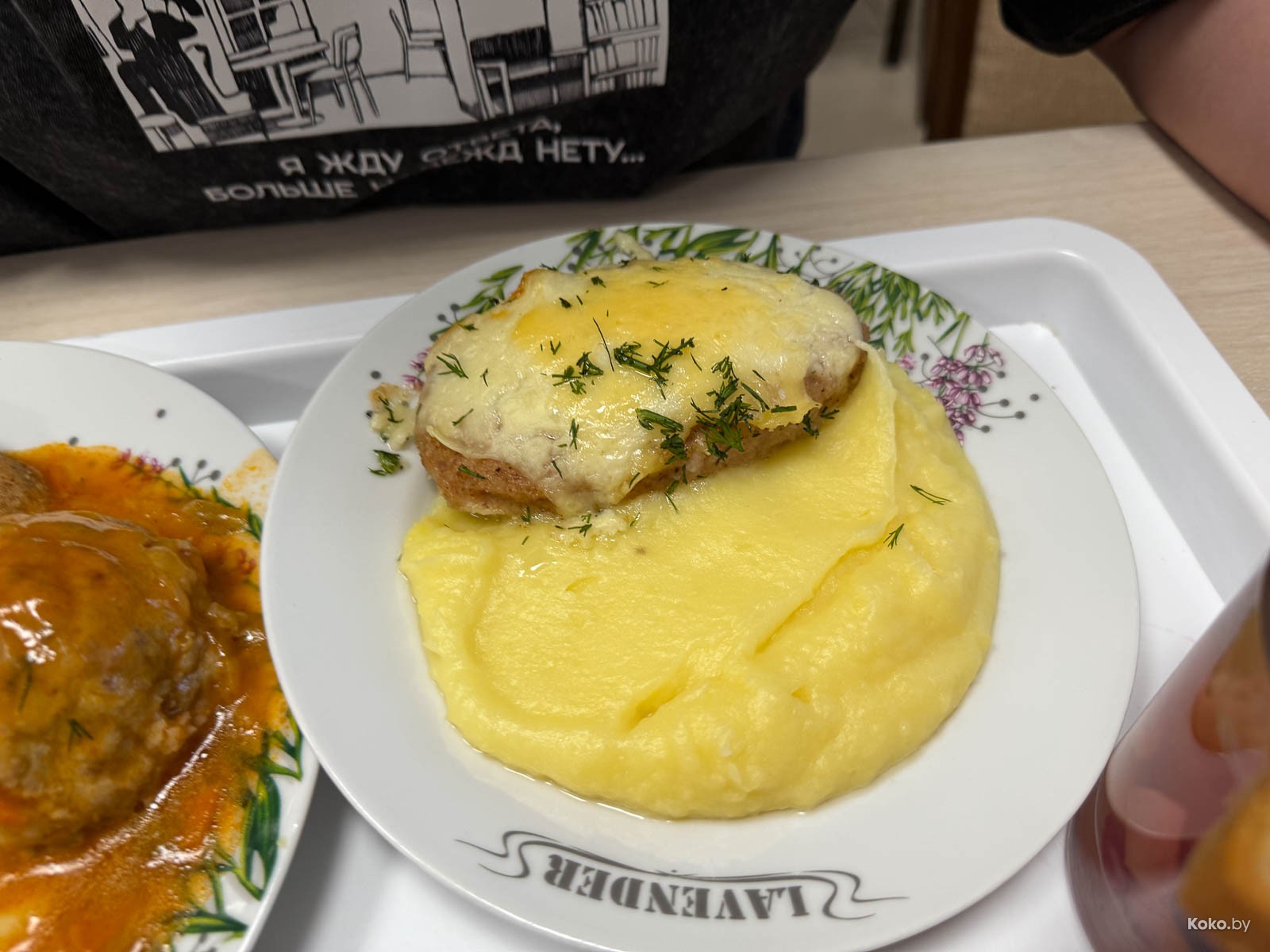2. Подают на добрушском фарфоре, коллекция «Лаванда». Прям топ воздушная котлета из курицы за 3,51р с молочным соусом под сыром.