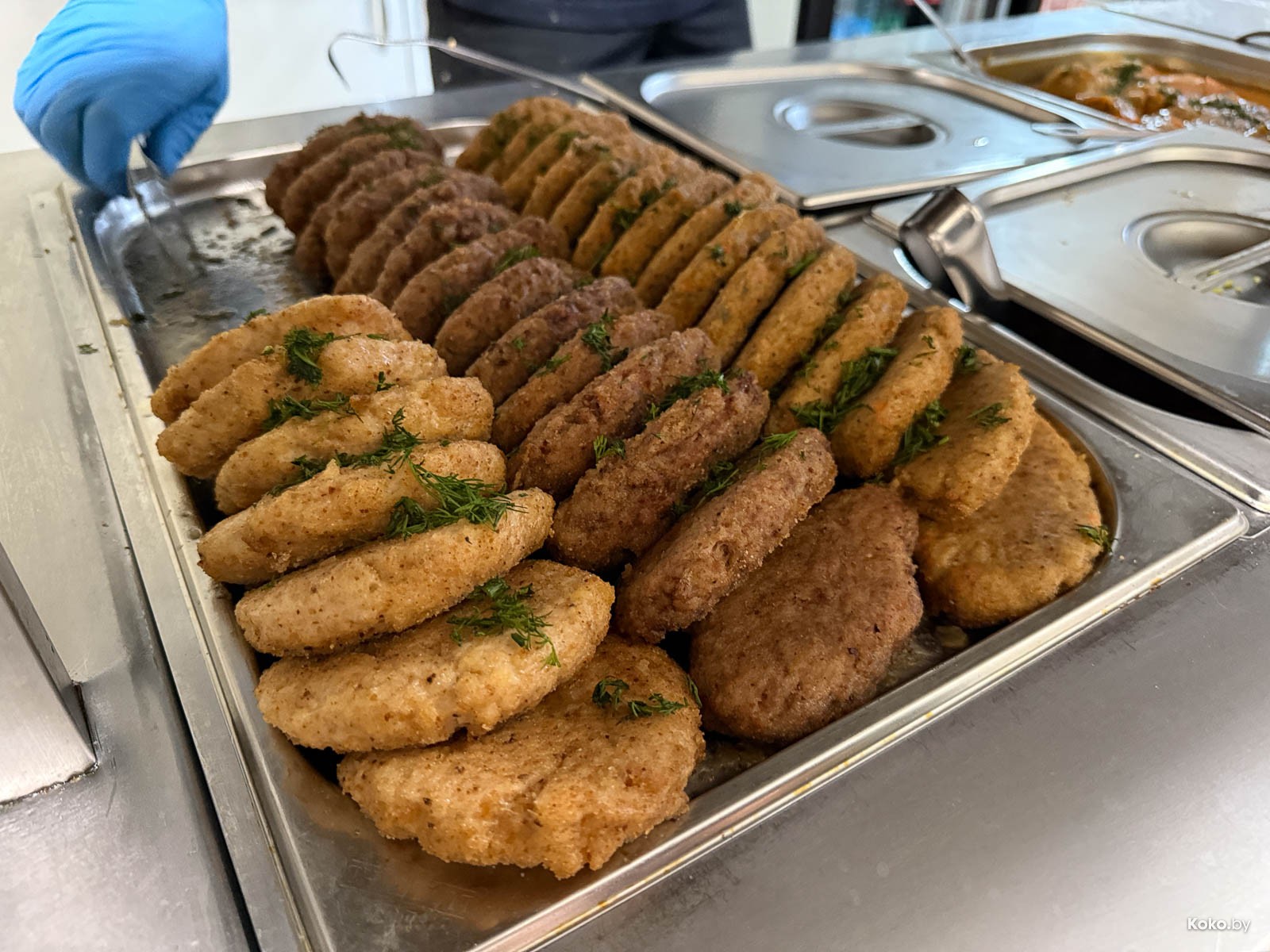 Очередь не стоит на месте, на кассе принимают наличку или физическую карту, пришлось сходить в тачку. За поднос обеда на двоих с пятью видами мяса вышло всего 32р, это по 16р с человека, как один двойной Воппер с сыром в «Бургер Кинге». Дешевле только бесплатно.