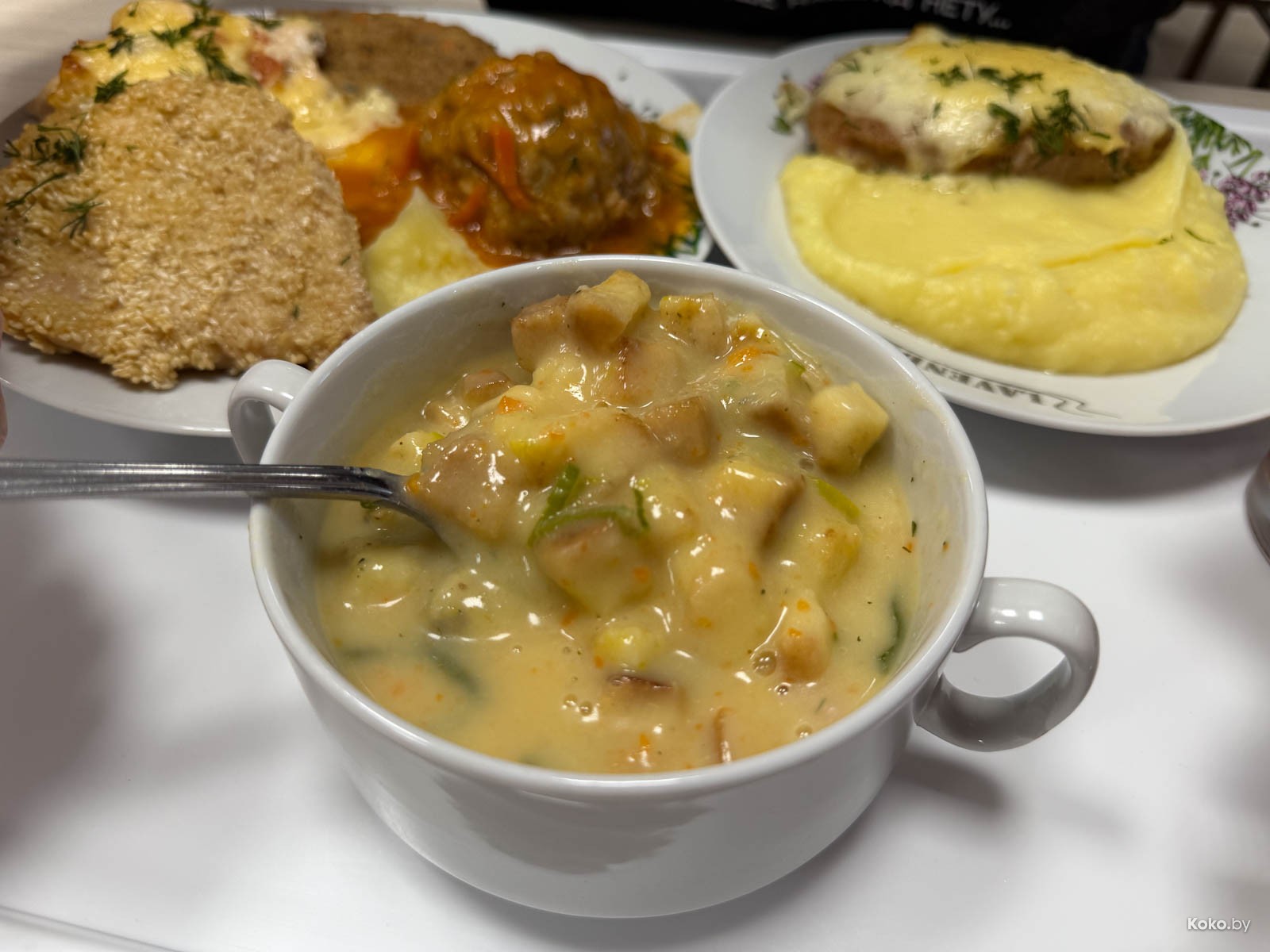 1. Люблю крем-супы, люблю лук, люблю сухарики, поэтому насыщенный пореем супец за 2,86р автоматом на 9 кокобаев. Фото не обманет.