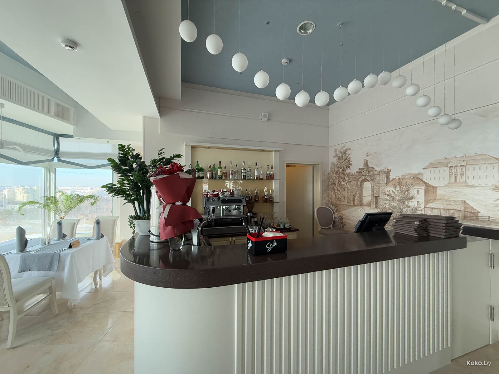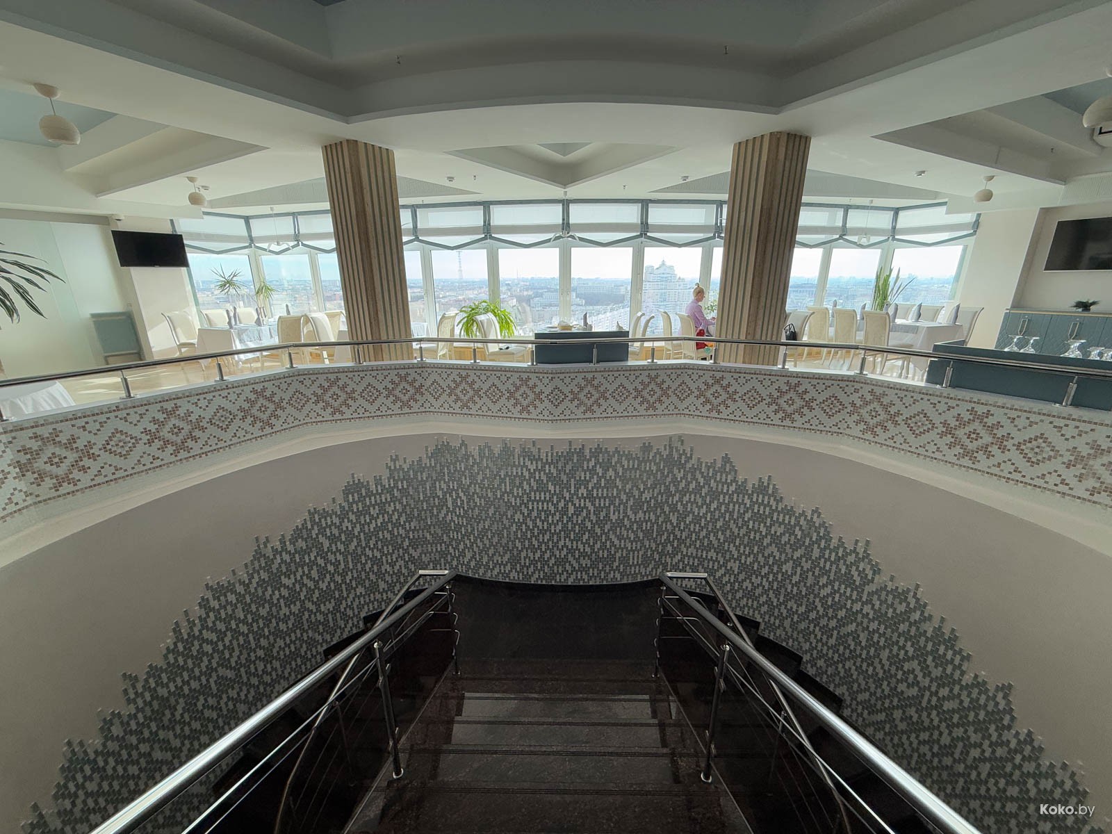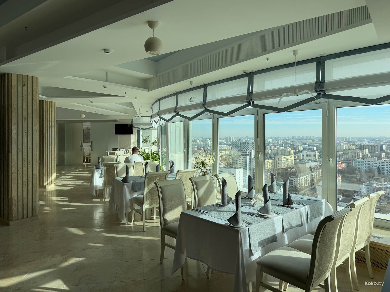 Немногие осведомлены о ресторане в гостинице «Беларусь», который недавно обновили. Кроме него такой панорамой может похвастаться лишь «Зь Вью» на 28 этаже центра бизнеса «Роял Плаза». С четвёртой попытки удалось добраться до обедов, т.к. каждое наше намерение его затестить пресекалось спец. обслуживанием, заведение пользуется лютым спросом под разные торжественные мероприятия. Пришло время заценить новый ремонт и разбить копилку об обеды.