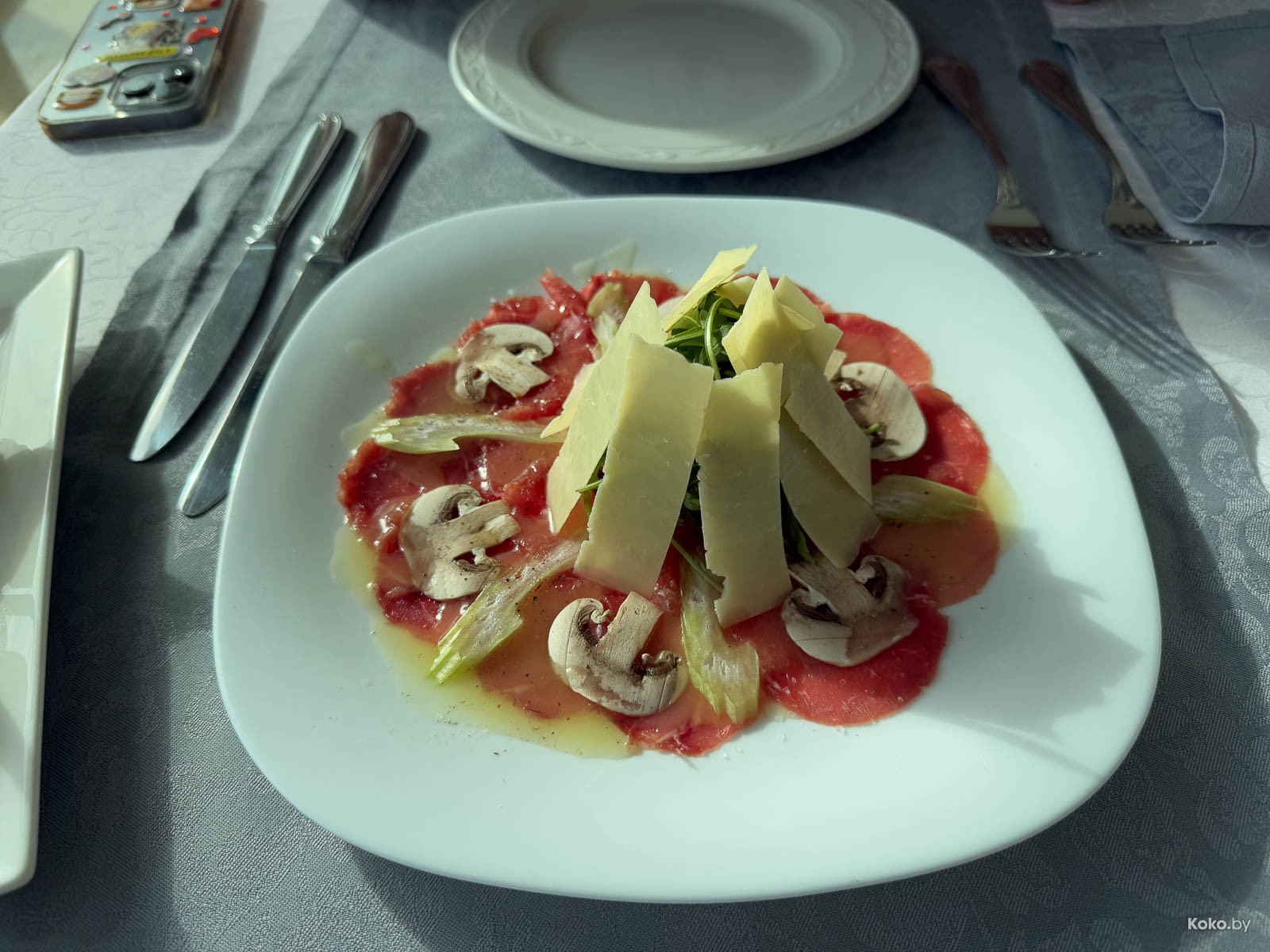 3. Карпаччо из говядины за 35р, как в любом ресторане - вырезка, филе шампиньонов , сок лимона, оливковое масло, рукола и пармезан.