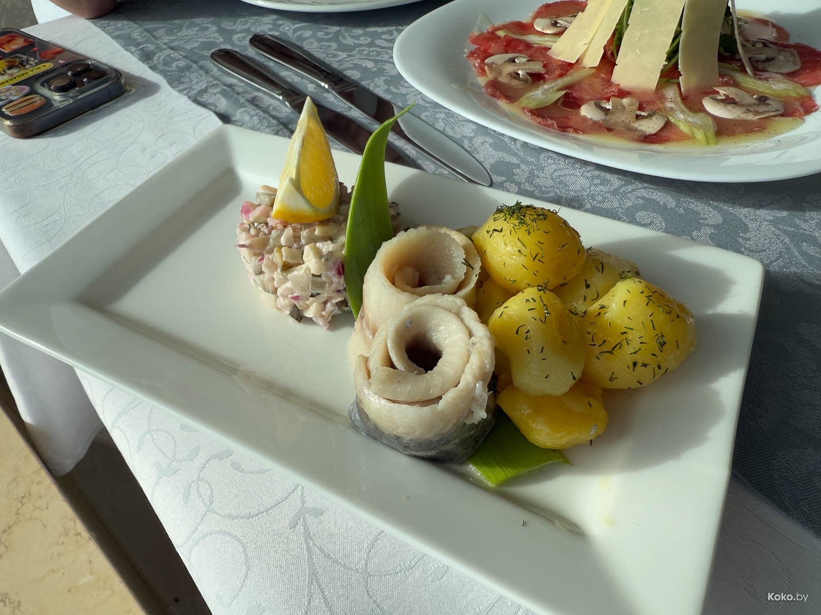 1. Раз, и на столе по морсу, следующим по старшинству подали закуску - скрученное филе сельди лёгкого посола с молодым картофелем в укропе и микс салата из маринованного огурца с луком.