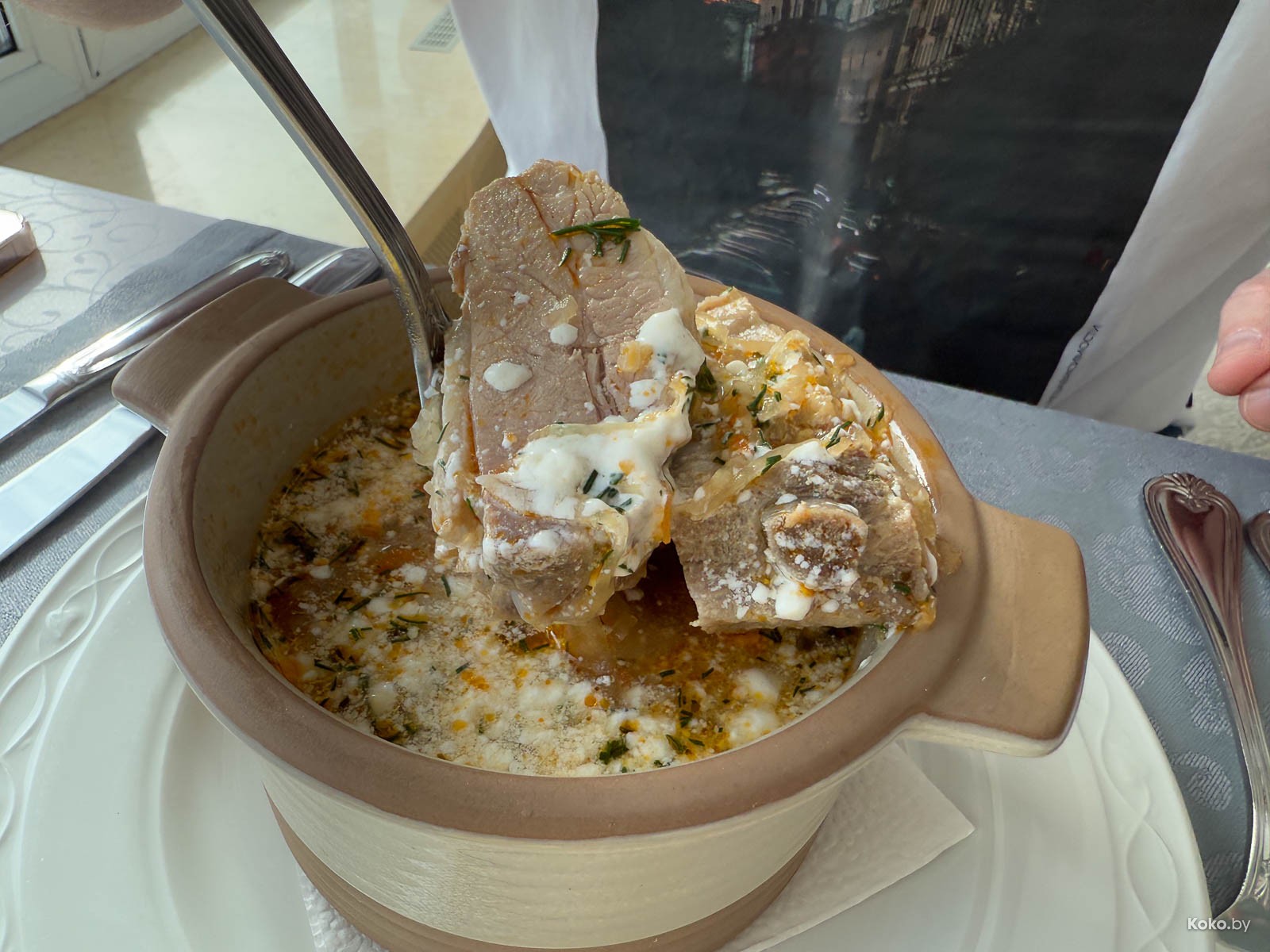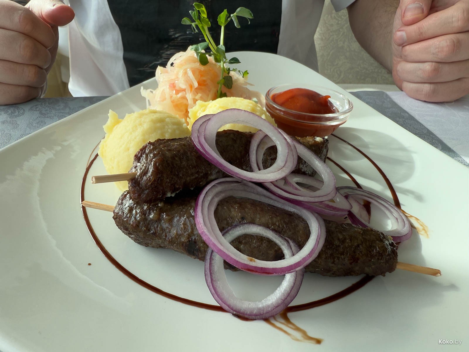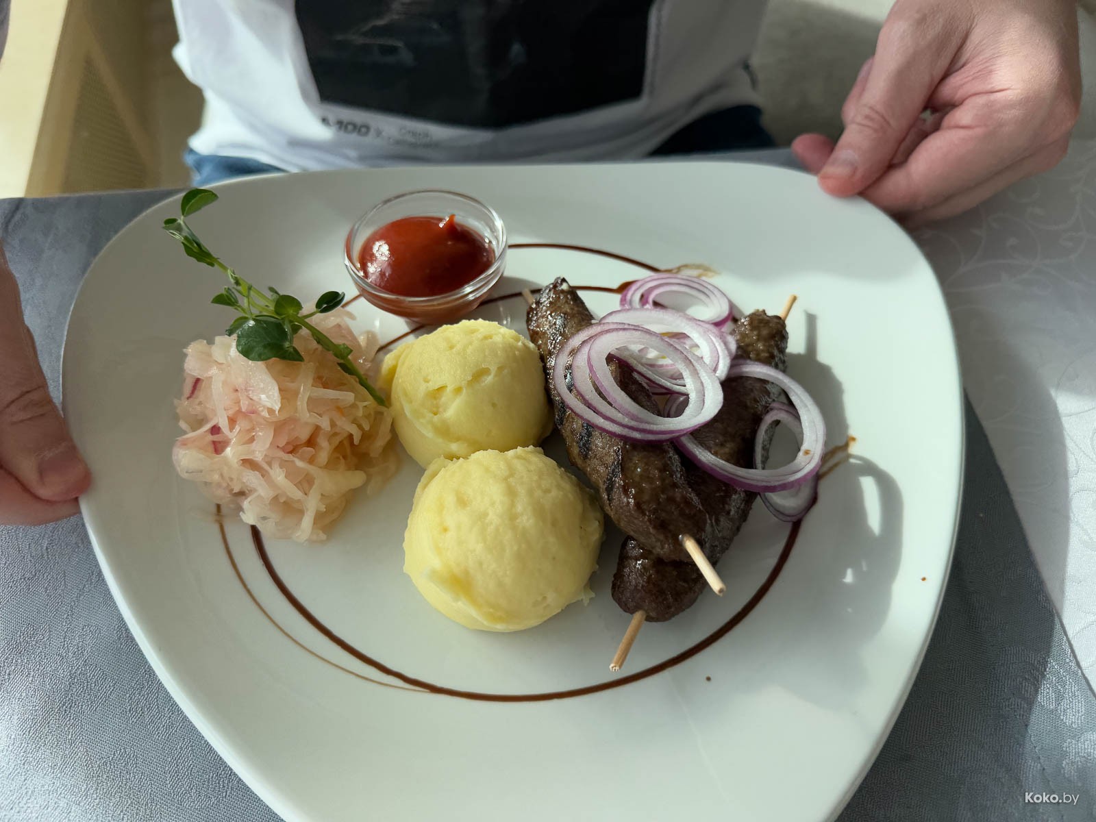 3. Не лучшее блюдо для фото - двойной кебаб из говядины на палочке с шариками из корнеплода и квашеной капустой за дополнительные 3р.