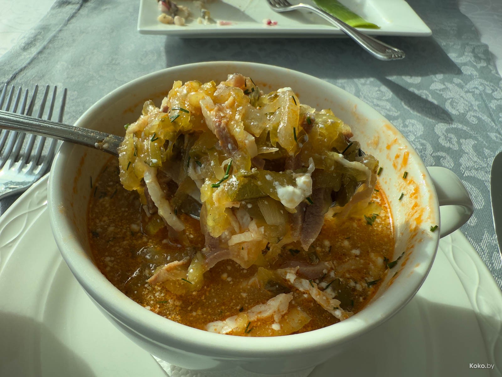 2. Щи из квашеной капусты по заветам деревень с мягкой кислинкой и тремя мясными рёбрышками парсучка, ох, чую, барсук в гнезде. Вкусно.