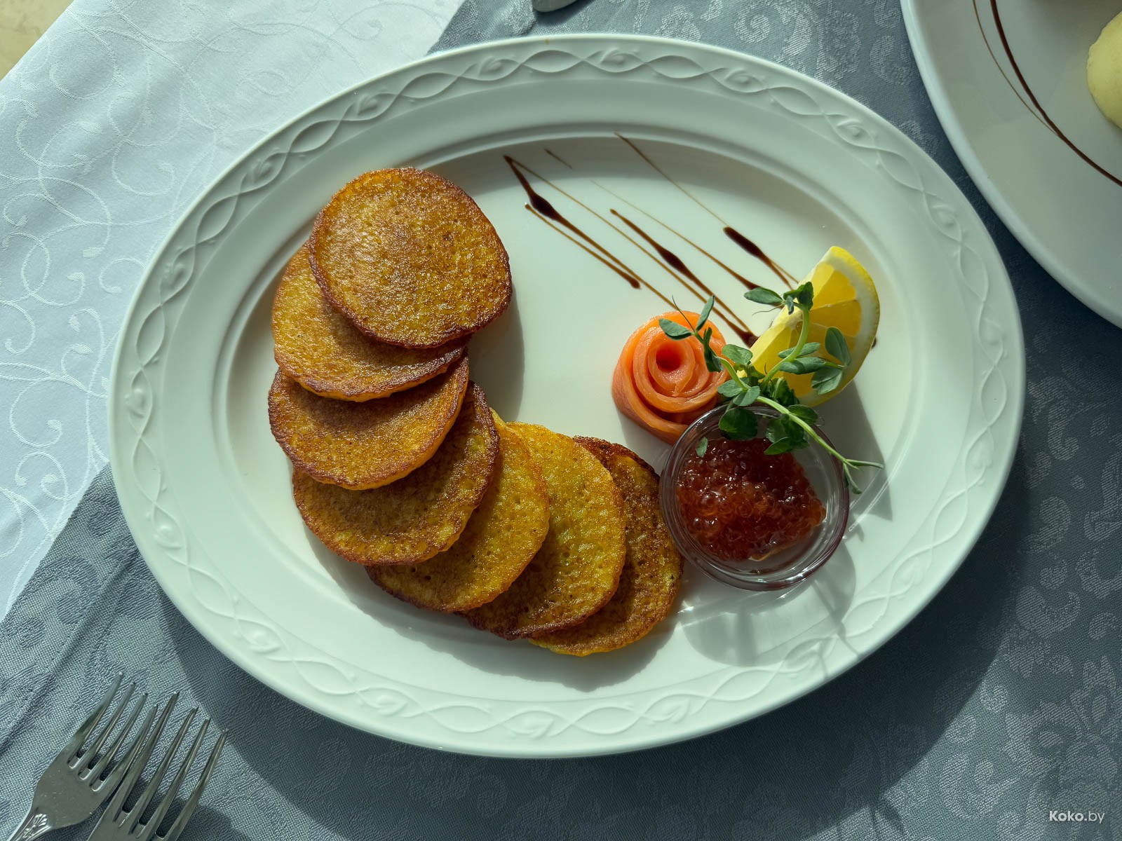 2. Панкейки из картошки цвета солнца по-царски с икрой красной рыбы и сёмгой мягкой соли, но где сметана? Драники без сметаны - 20р на по ветру, но картошку тёрли не напрасно, бабушка бы одобрила.