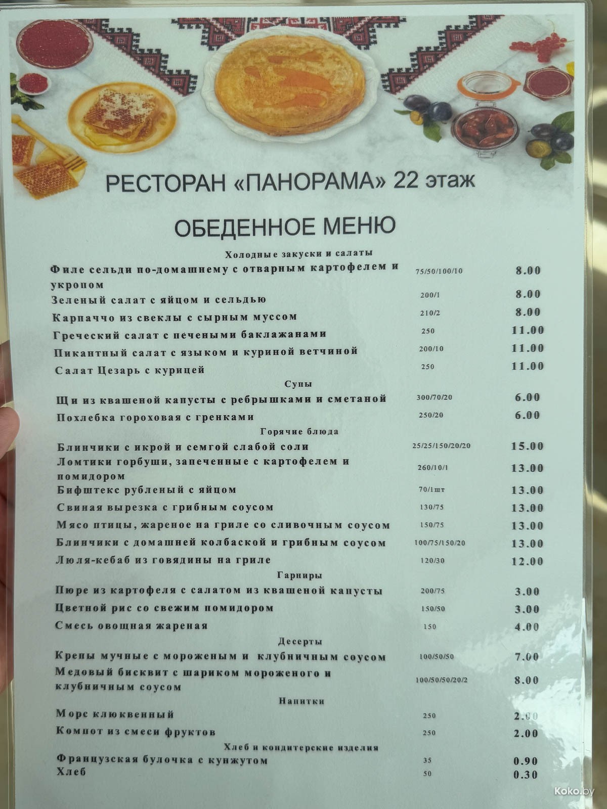 Проверяем стоимость обеденного меню в ресторане «Панорама» с завораживающим видом на Минск с 22 этажа