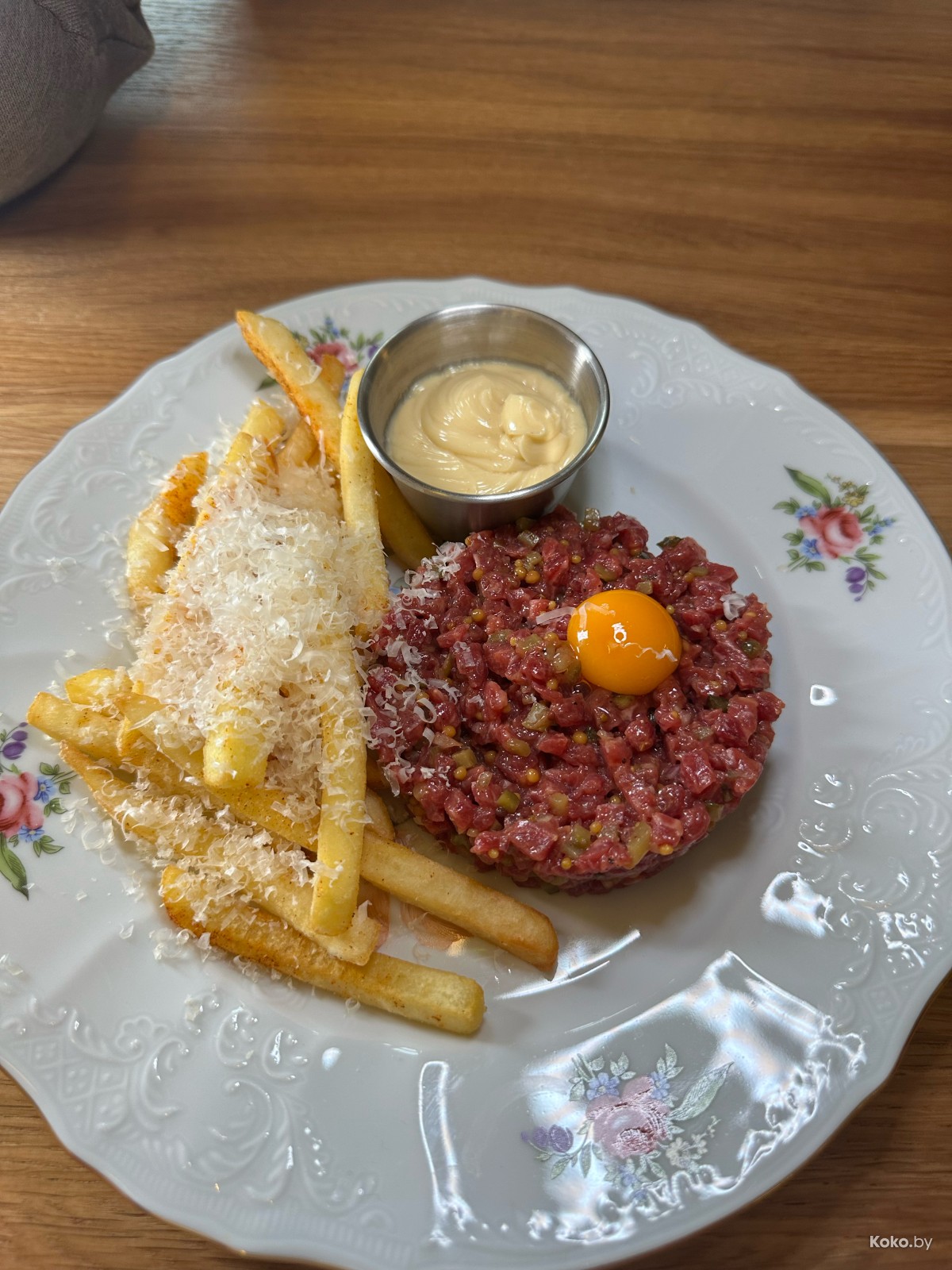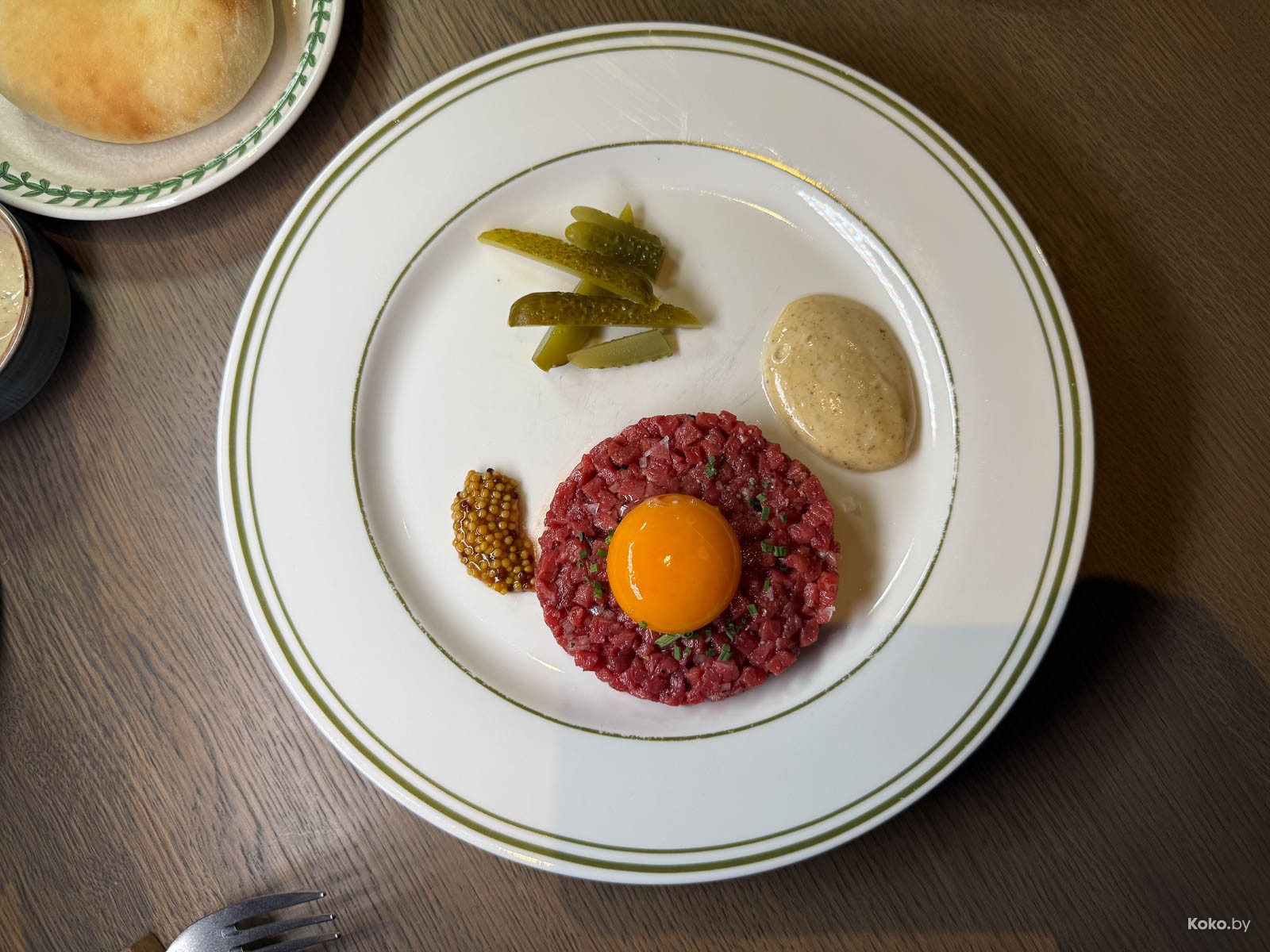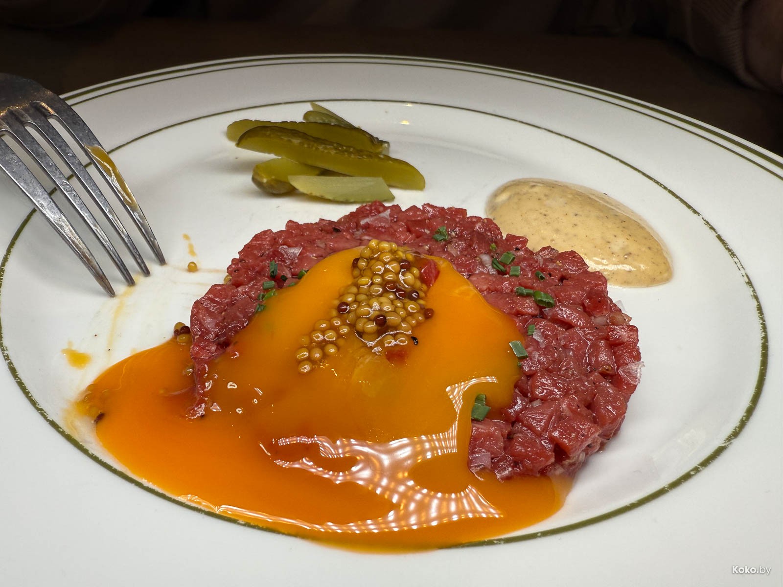 1. Лихо нарубили тартар из говядины с фри за 28р, огурчик, чтобы занюхнуть? Как с картинки, гармоничная заправка, мелкий прохладный кубик, на размер куриного желтка нужно больше мяса. Вкусно.