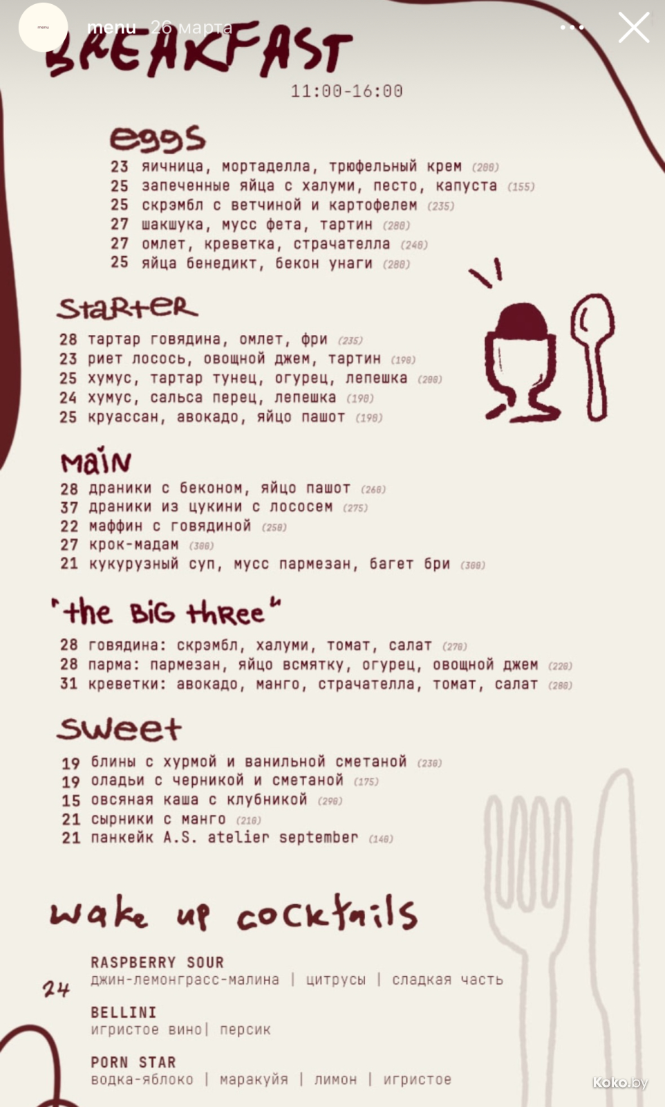 С 11:00 до 16:00 - собирают поздние завтраки, час перерыв на отдохнуть, и с 17:00 готовят основное меню. Без выхода по весу, цены, как у всех.