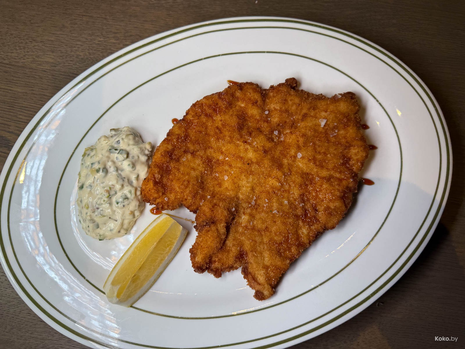 5. Шпицель из индейки с соусом тартар, и вон лимон! Отбит, корочка хрустящая, за 25р могло быть и больше. Вкусно, и это до шота текилы.
