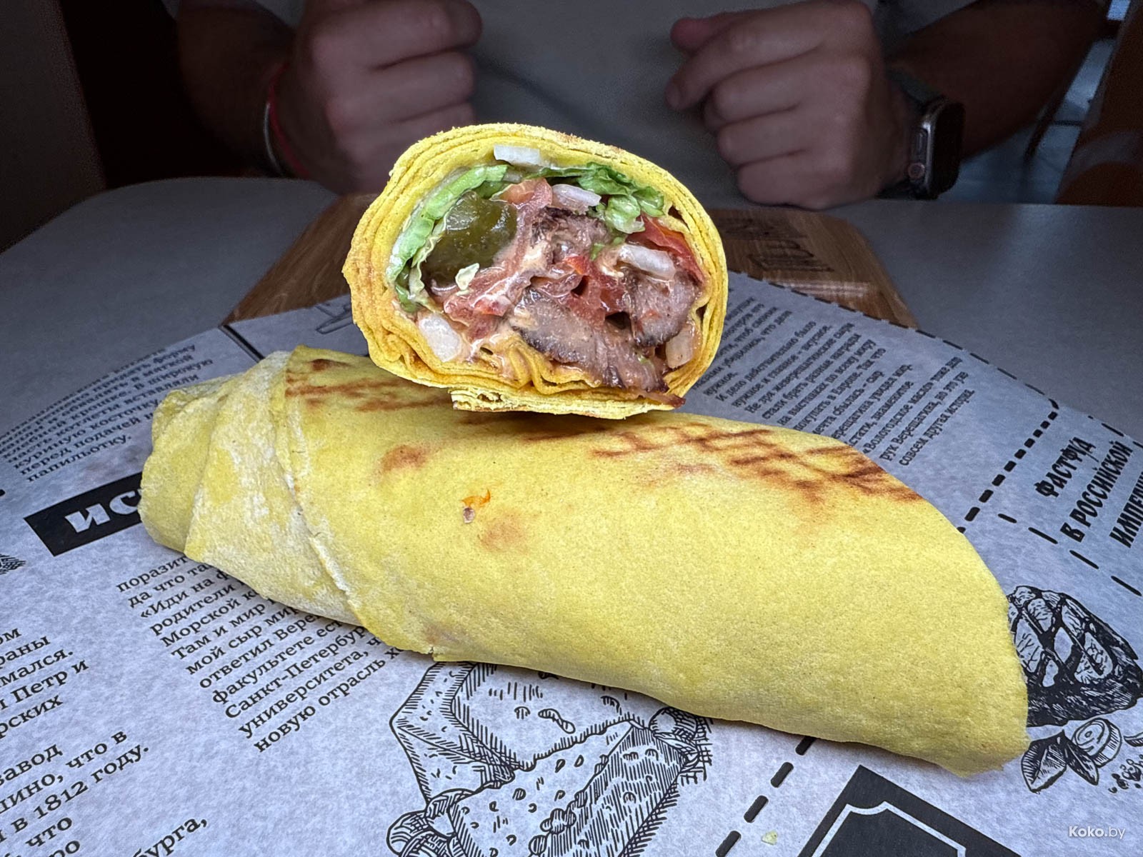 2. Самая дорогая с заранее приготовленной говядиной завесила на 17,50р. Мяса от души, оно сочное, мягкое, чутка овощей, а лаваша, как линолеума в несколько слоёв. Для такой цены шаурма выглядит детской.