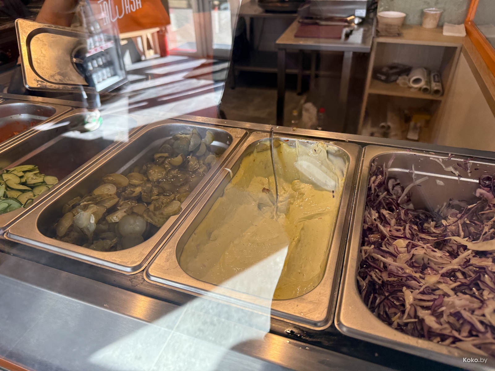 На открытой кухне ловко крутят кебабы один за одним, любо смотреть, что из всех капуст мира выбрали сладенькую краснокочанную. В остальном стандарт, соусы бутылочные, кроме густого чесночного.
