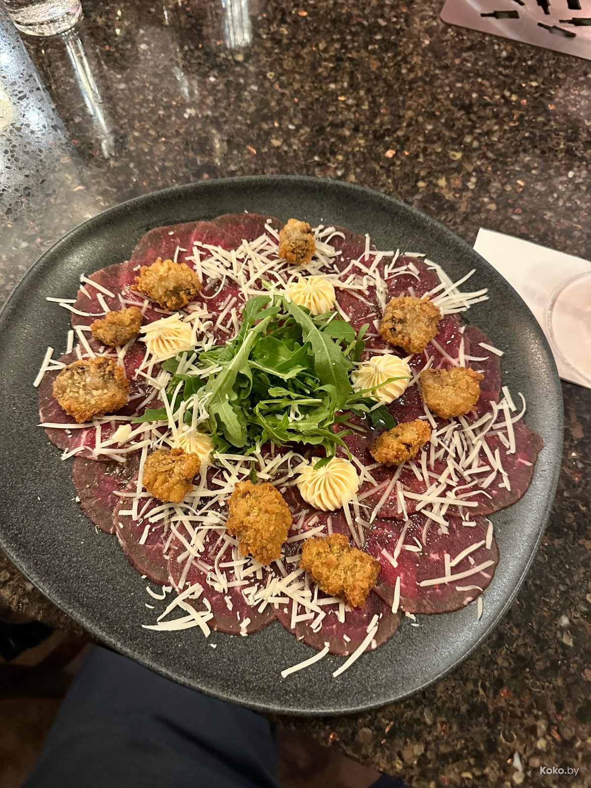 2. Она же, но порезанная, под муссом из копчёного сыра с наггетсами из вешенок на 2р дешевле тартара. Классика закусок из свежей говядины.