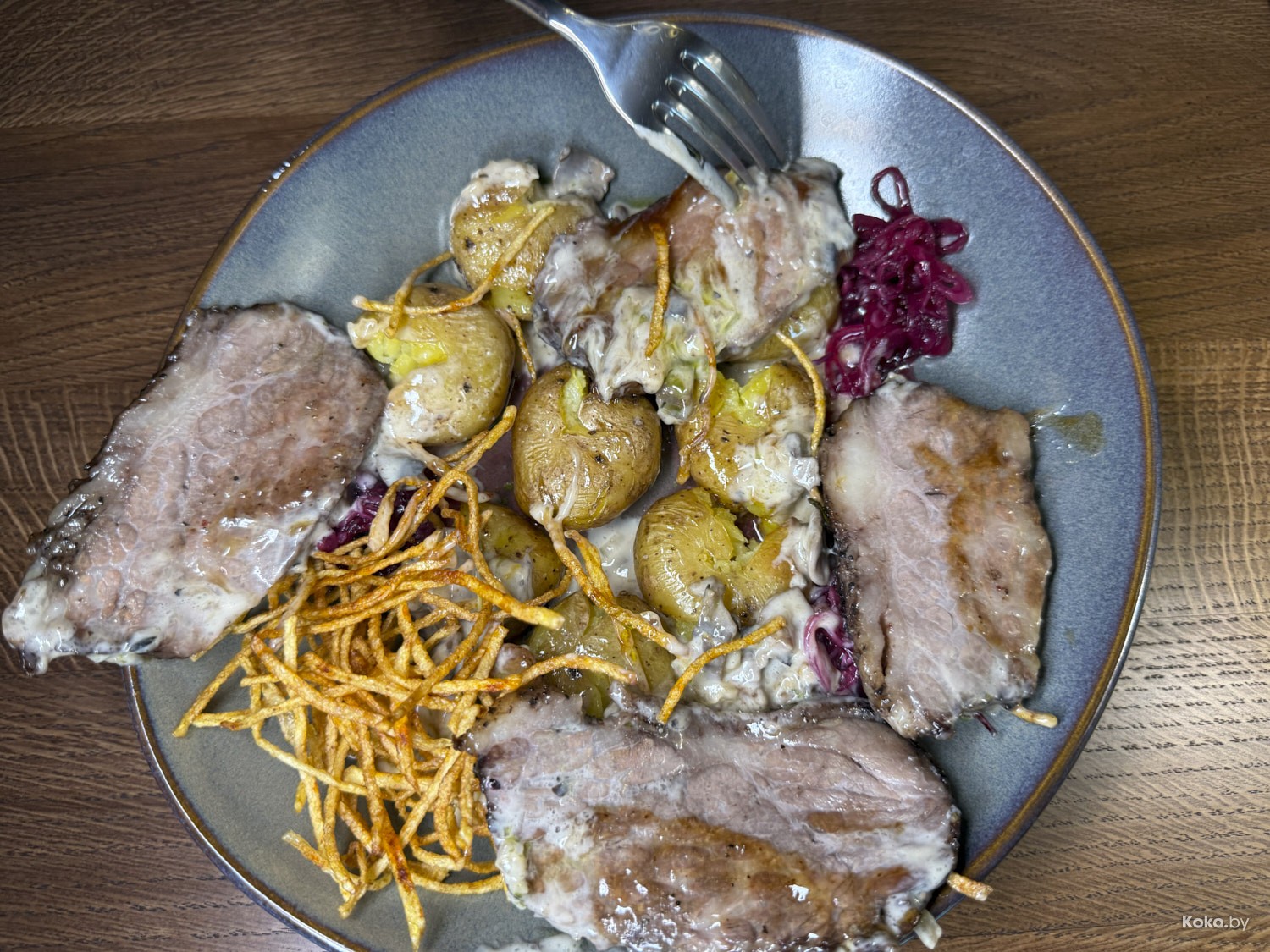 Нежнейшая, точно томлёная говяжья грудинка с изумительным нашим запечённым клубнем, который любое блюдо делает на 9 кокобаев. Перфектное сочетание с соусом и маринованным сладким луком.