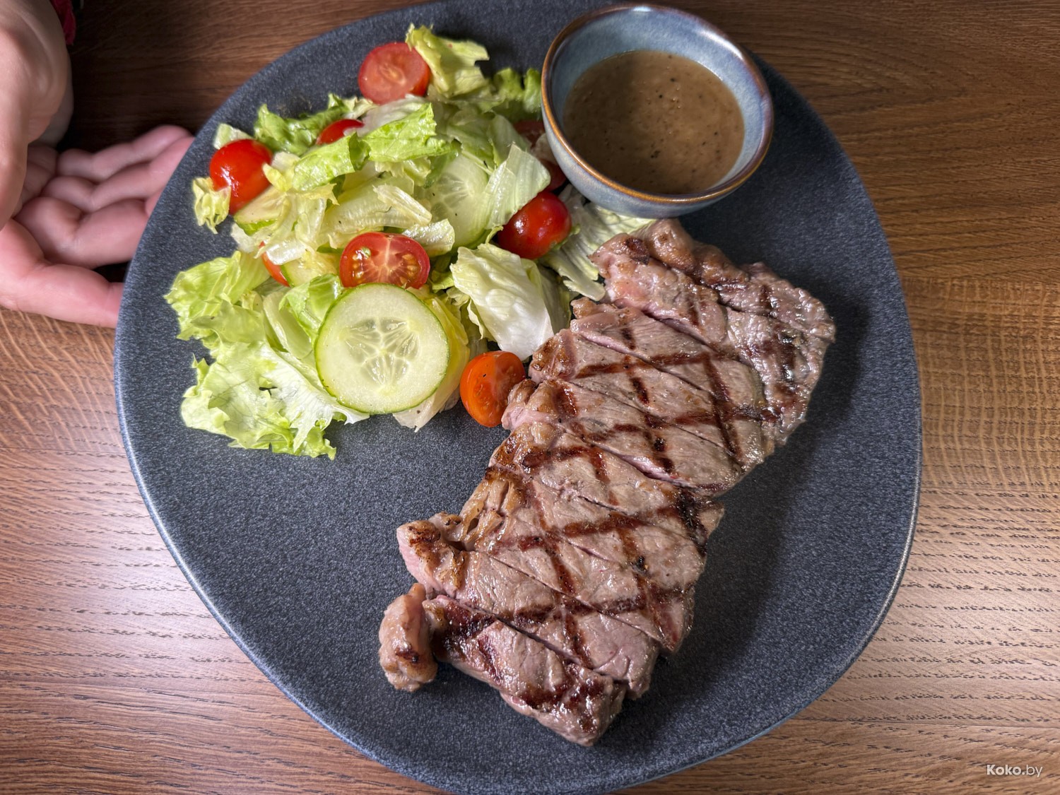 3. Ну и самое дорогое из меню - стейк Нью-Йорк за 88р с салатом из трёх овощей и, на всякий, перечный соус. Живём во времена, когда лосось дешевле говядины, 46р против 88р за Миньон и вырезки.