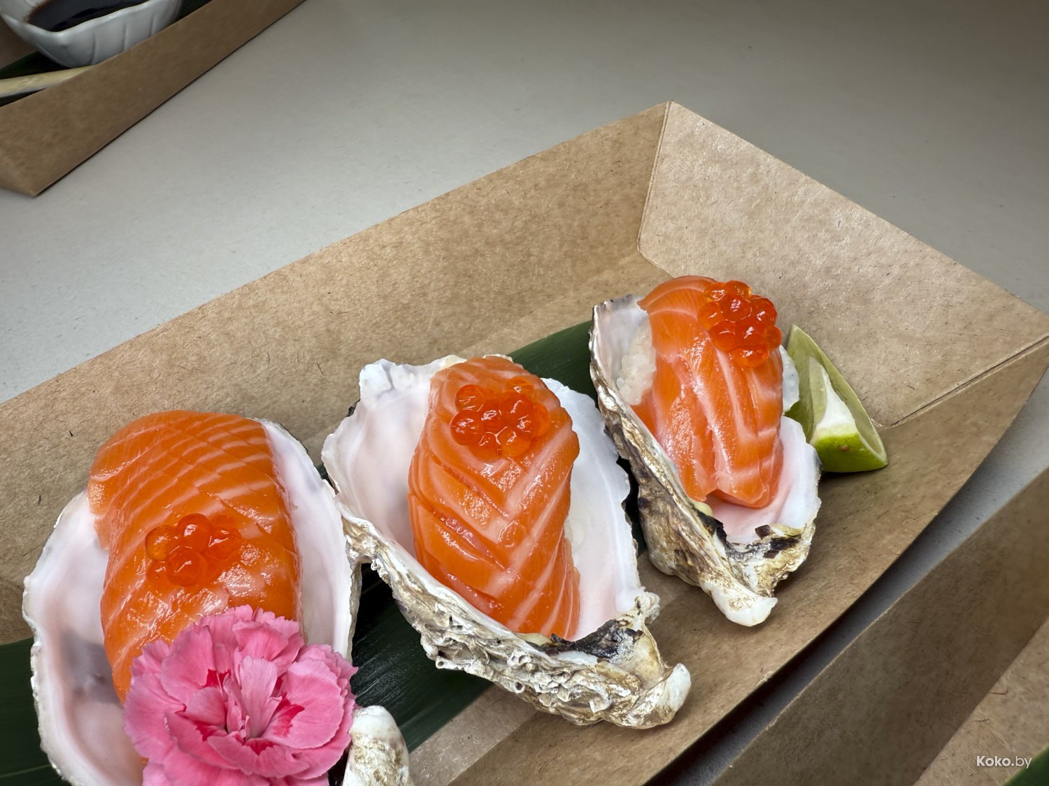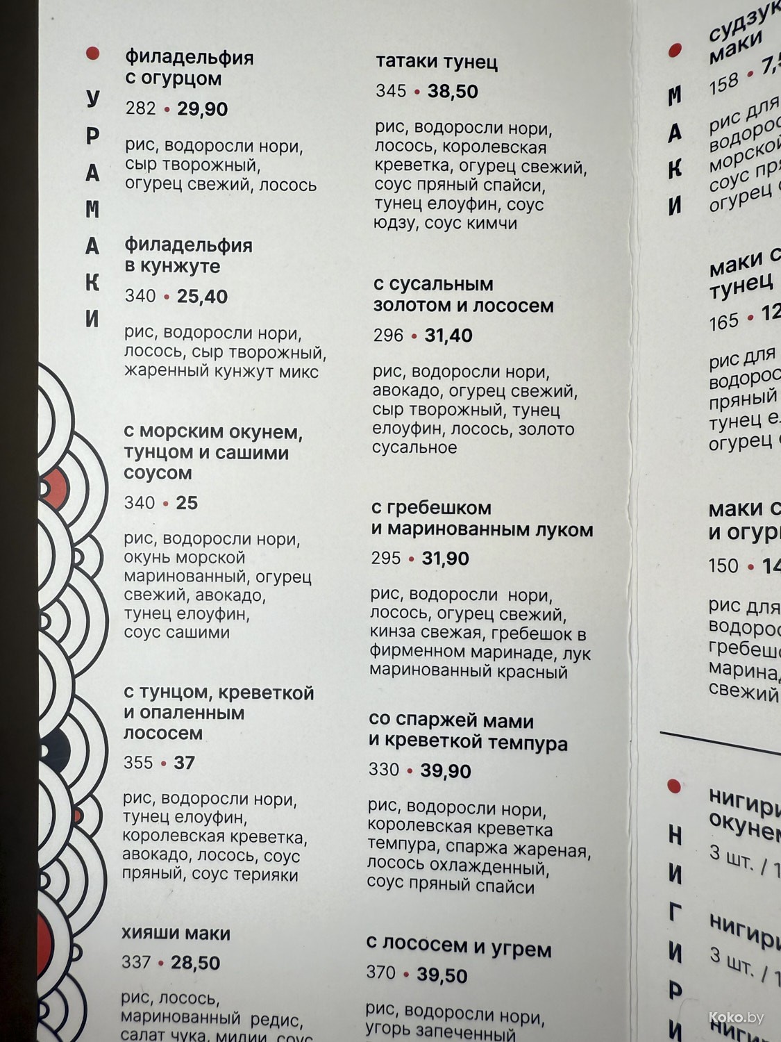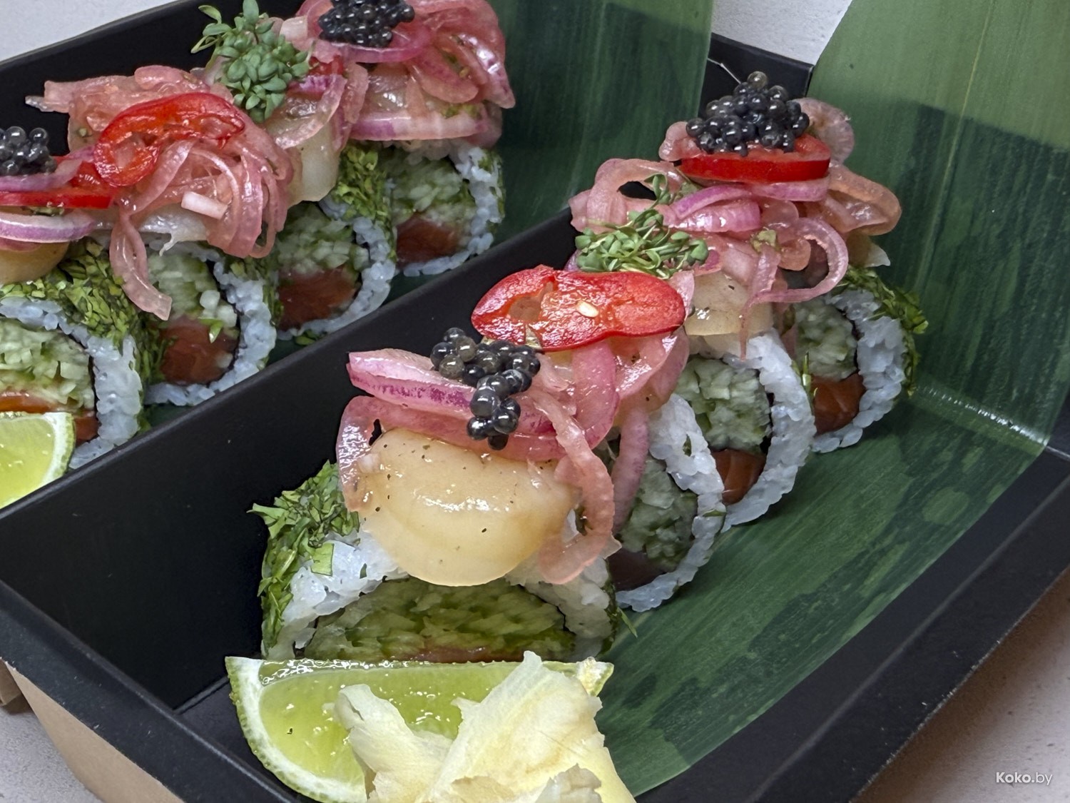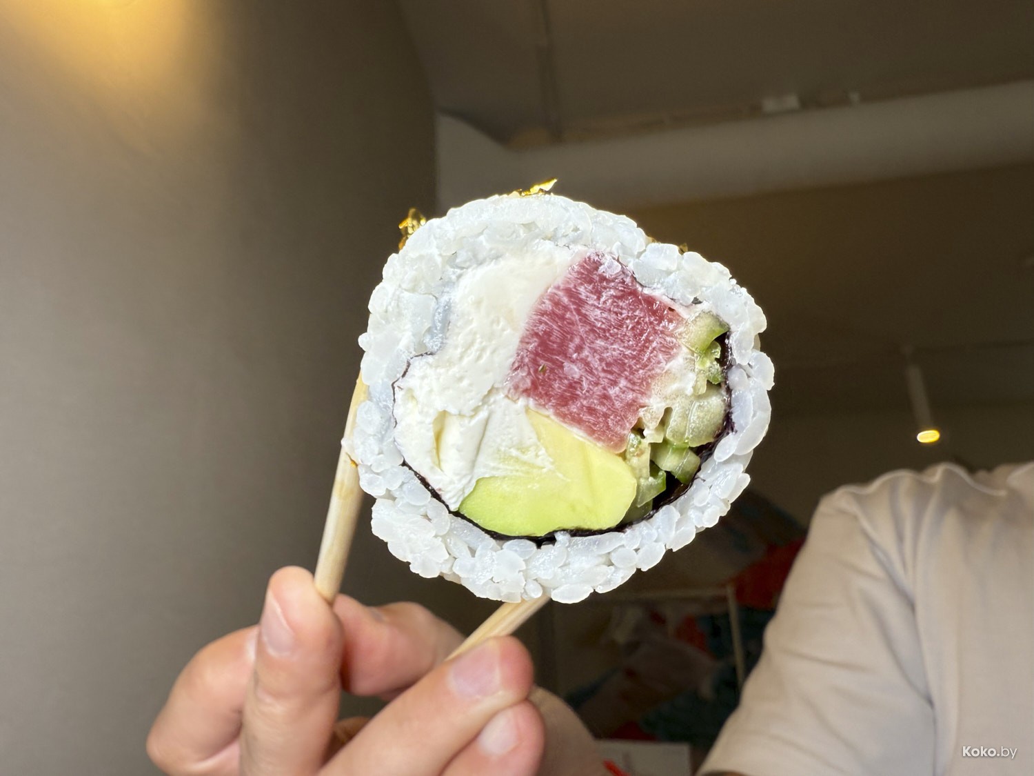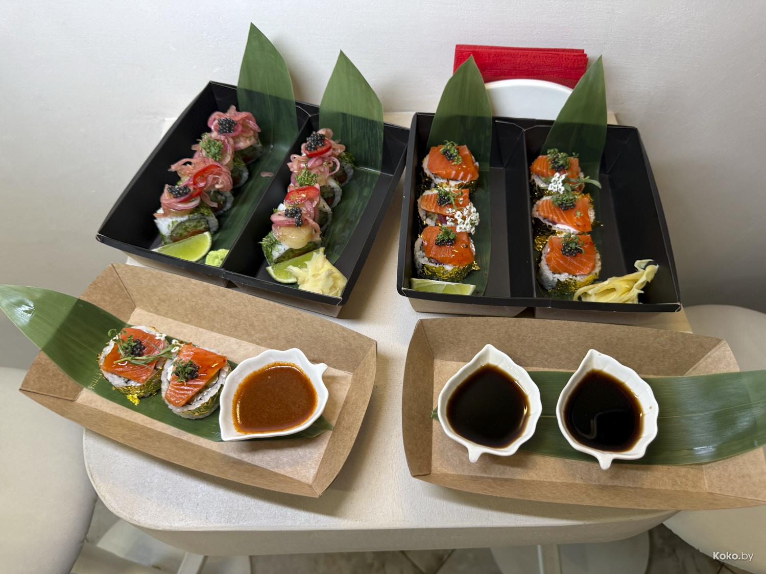 1. Роллы по-самурайски скручены в тонкий рис, минимум кремчиза, много свежей рыбы, как следствие, такая дикая для Гродно цена.