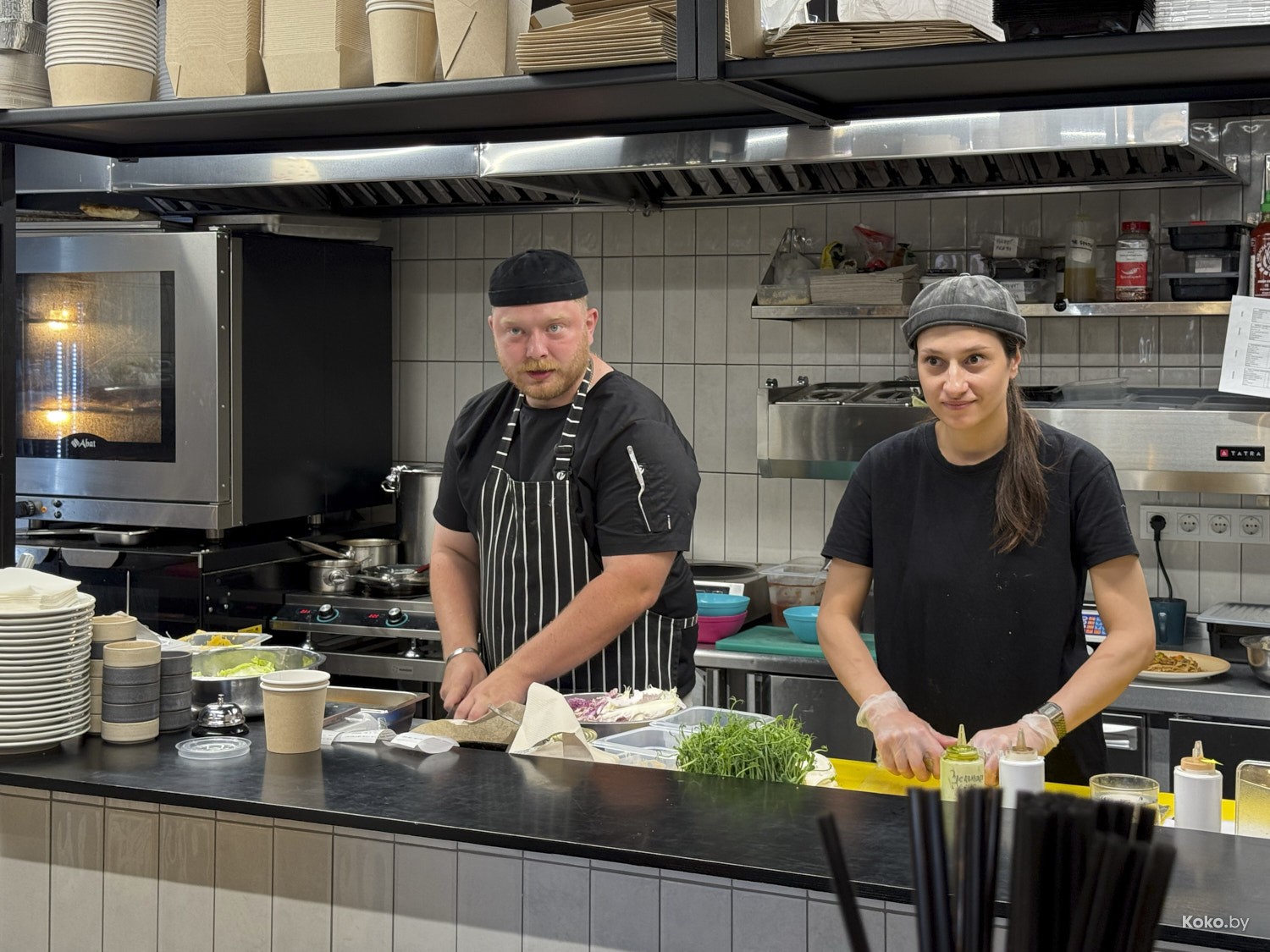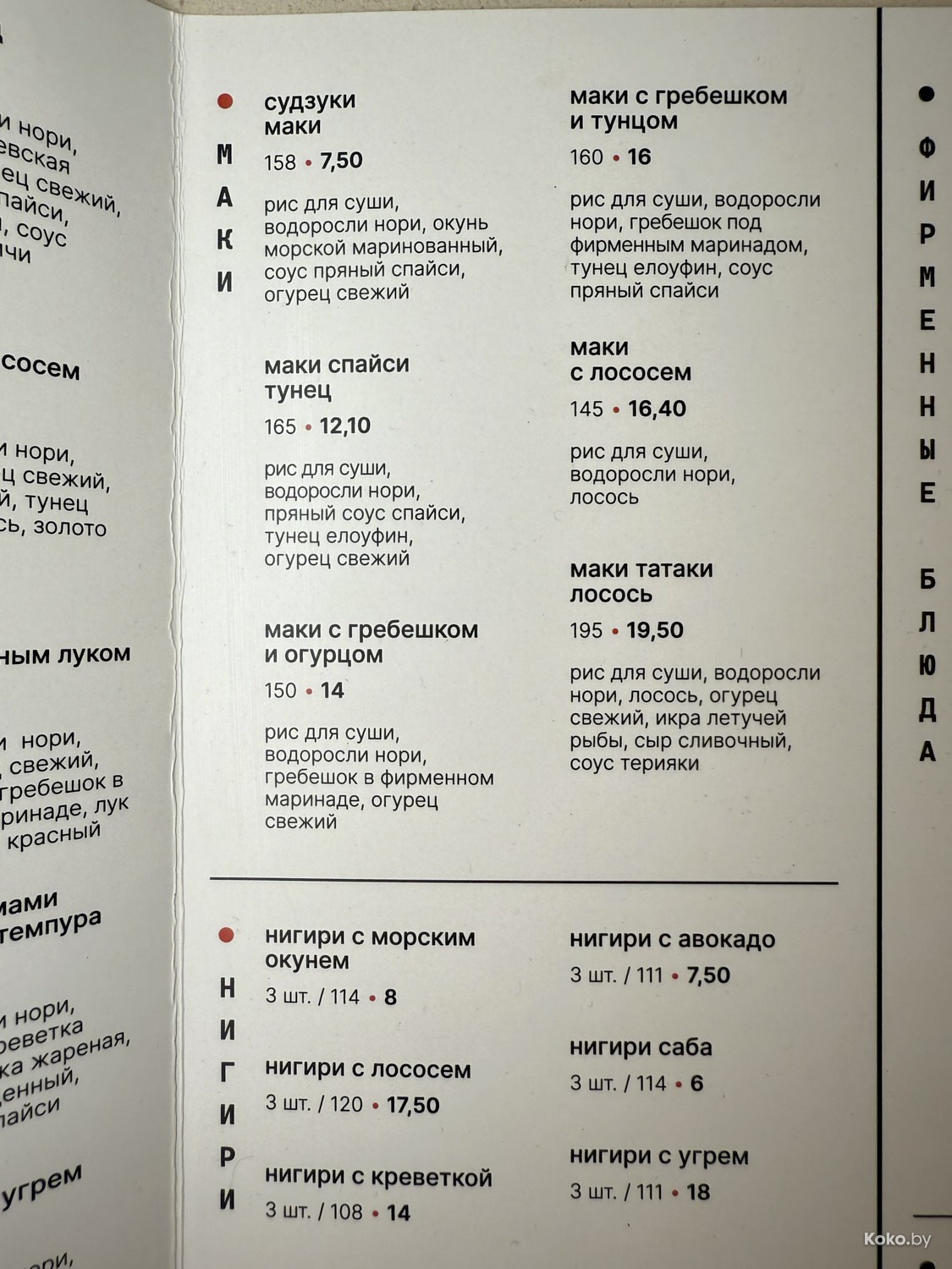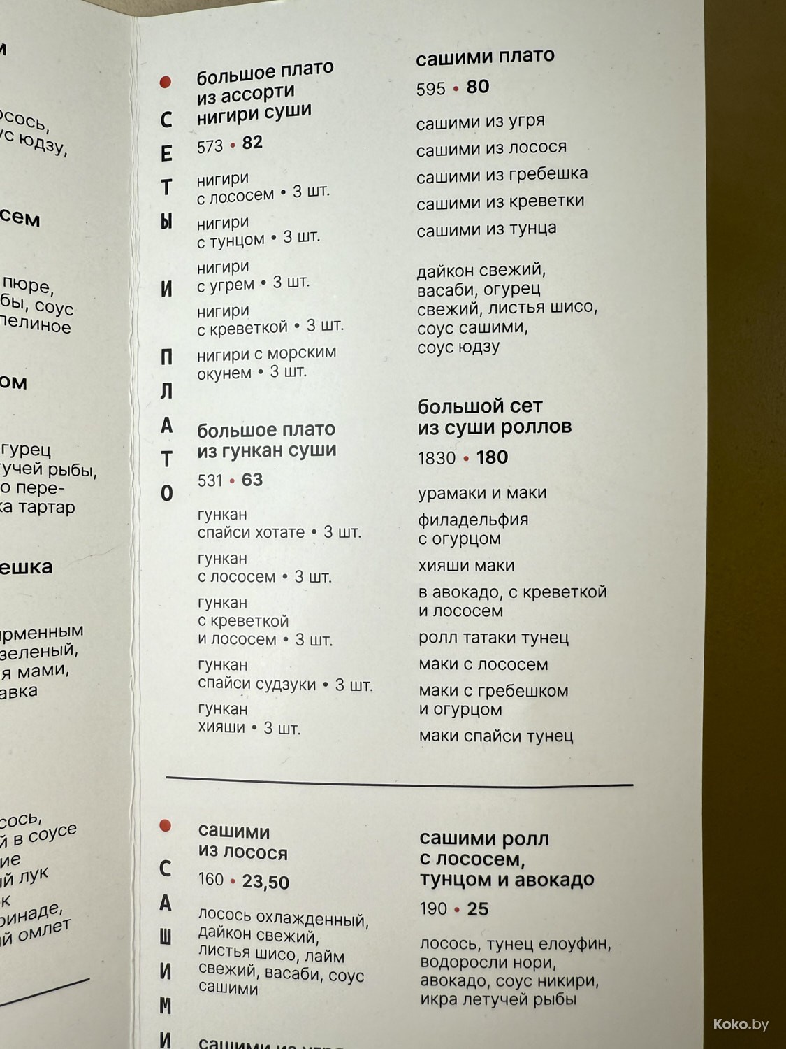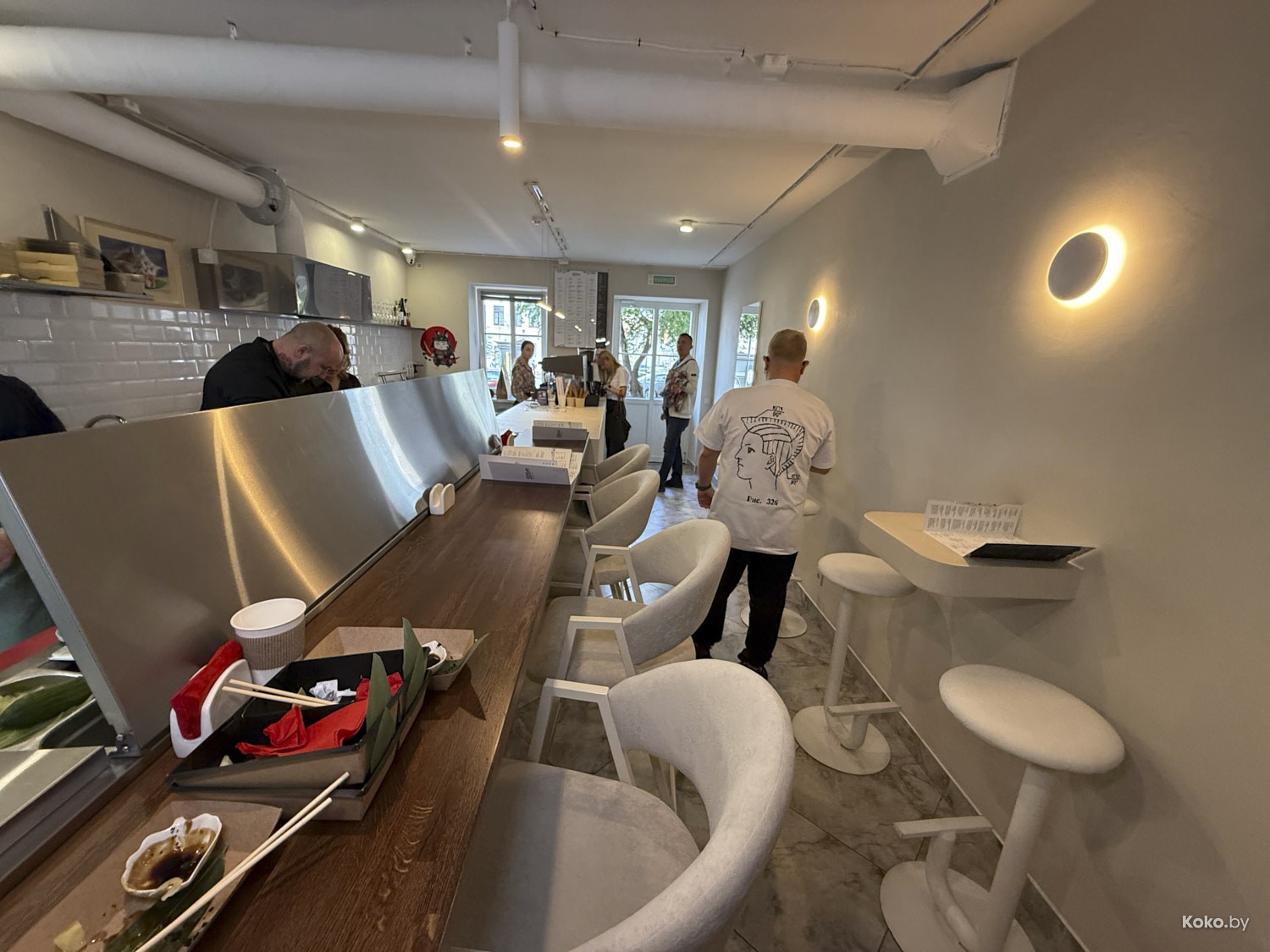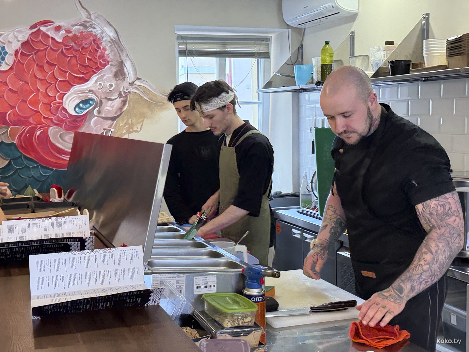 Два места у стены и за общим столом с суши-мастерами, хоть так, чем на ступеньках есть, как пёс. Цены на суши столичные, меня не удивить испугать, местные же жалуются, что у них сильно дорого, но вкусно, поэтому золотая молодёжь Гродно заказывает у них. Проверим.