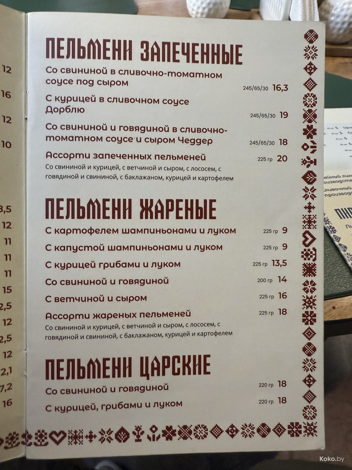 Отварные пельмешата с креветками под укропом - 12,10р, фирменные запечённые под сырной шапочкой - 16,30р за тарелку.