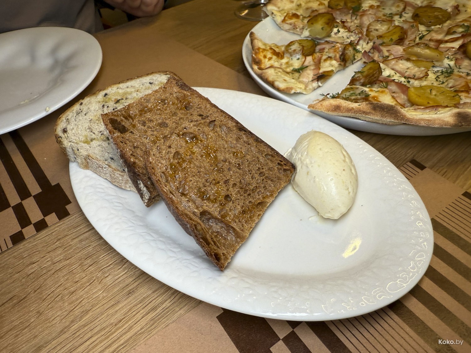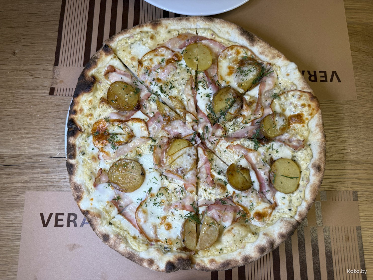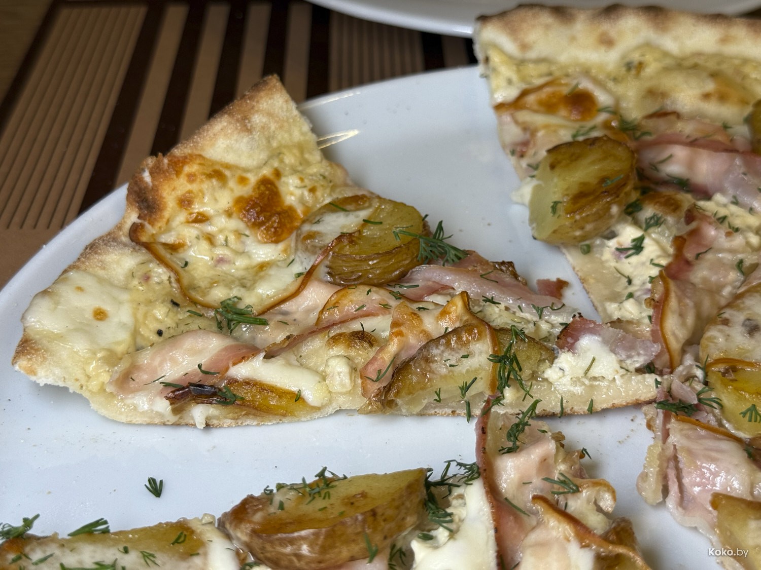 1. Раз, и пицца на тонком тесте по рецепту шкловских деревень с беконом и молодой картошкой в сливочной заливке под укропом. В ней хорошо всё, как жульен на фокаччо, в меню за Бульбаш 18р.